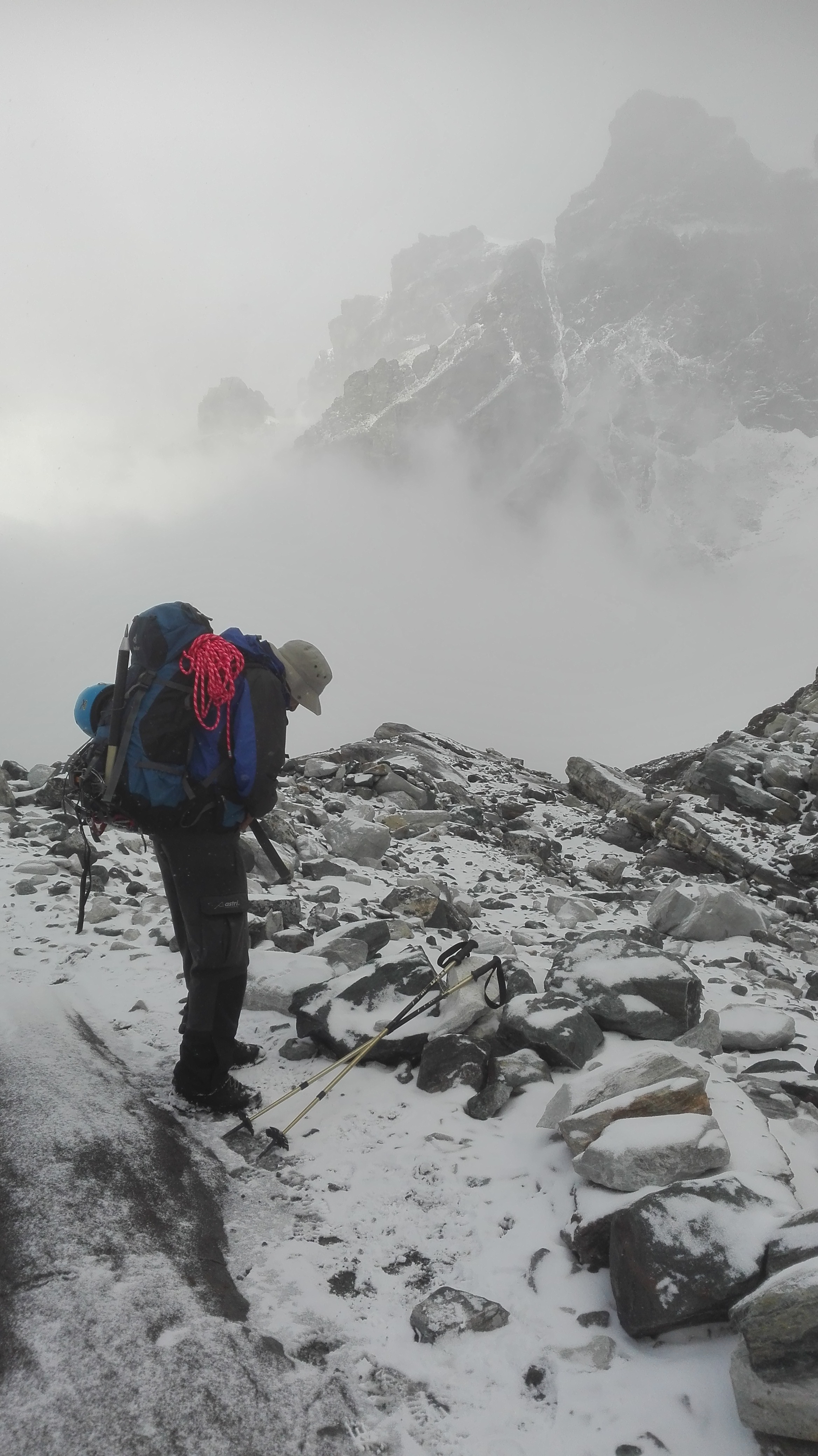 Dienstag reichte das Wetter für eine Tour (siehe oben) und wir bekamen auch wieder einen Platz auf der Ayashütte. Mittwochmorgen lagen erneut 2-3 cm Neuschnee auf Hüttenhöhe und hinab bis unter 3000m. Der Sturm hatte über Nacht wieder etwas zugenommen und die Wolken stärker nach Süden gedrückt. Eine Tour wäre zwar möglich gewesen, die Erfolgsaussichten aber dahingestellt, wir stiegen jedenfalls ab.