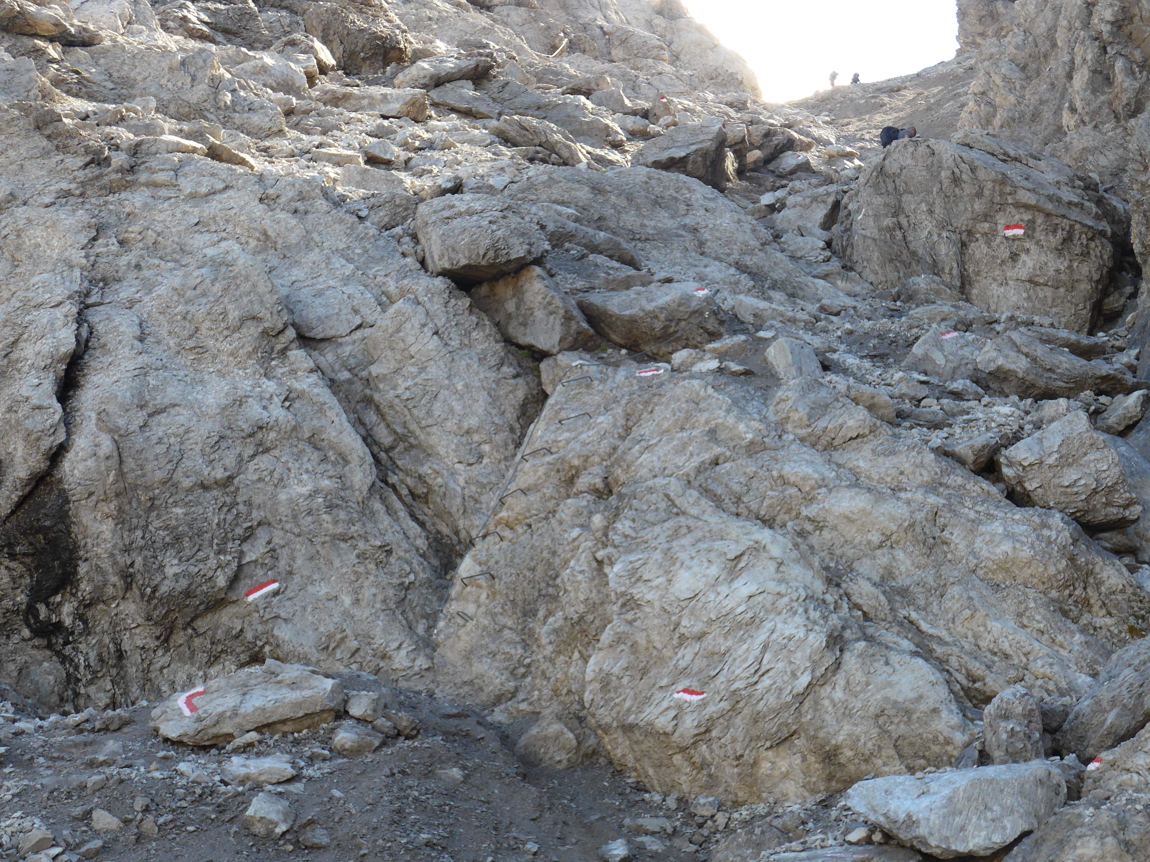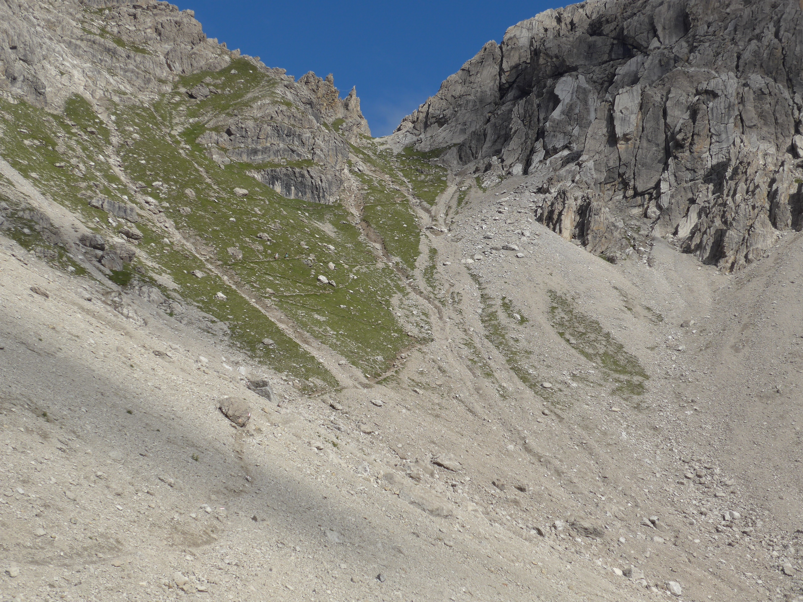 Abstieg vom Scharnitzsattel felsig, rutschig wg. Geröll, Steinschlag, aber gut mit Stahlseilen versichert, unten (bzw. Einstieg) Steilstufe mit Stahlbügel und Seil (ggf. Unterstützung für kleinere Personen notwendig).