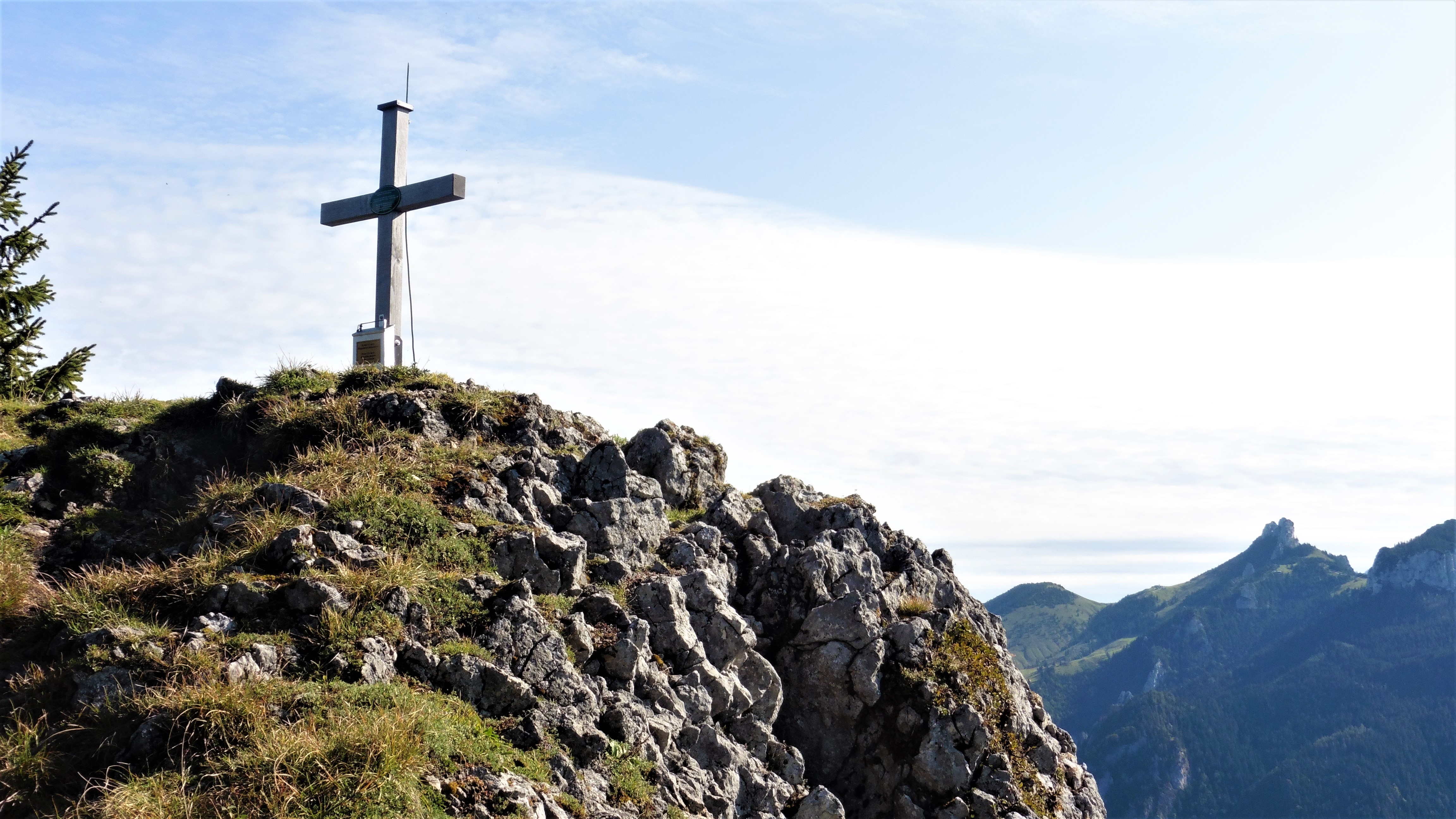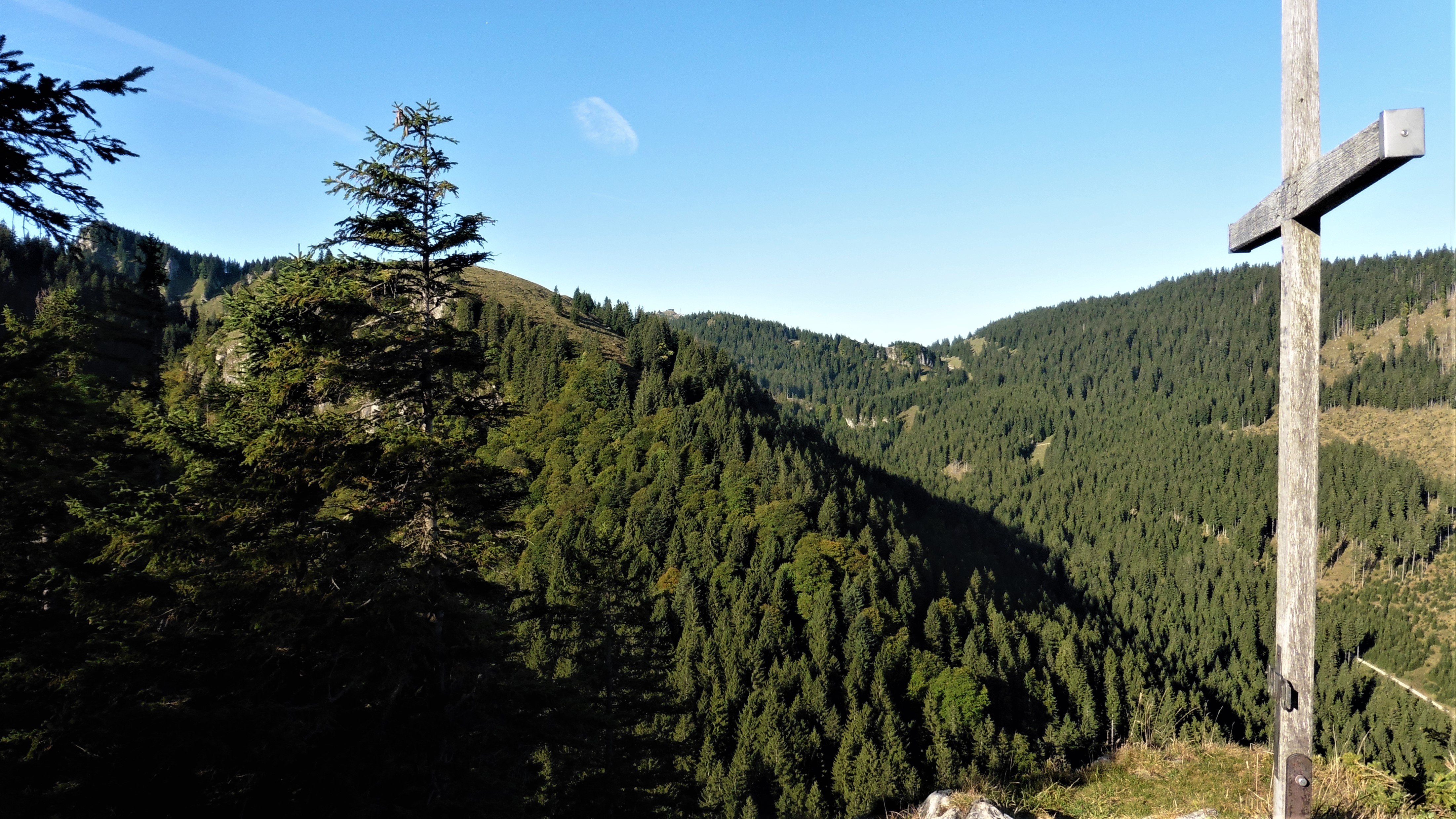 Sonstiges: vom Parkplatz über den Heurafflerweg zur Hofalm; über die Wiese linka hinauf zum Waldrand; dort beginnt ein Pfad, der zu einer kaminartigen Rinne / Sicherungsseil zum Grat leitet; weiter zum Hammerstein/ Kreuz; etwas bergab und dann wieder zum Grat / Gedenkkreuz-Ramsauer; kurz in die Westflanke und über eine steile Grasrinne zum Grat; das letzte Stück zum Gipfel des Zellerhorn (Kreuz mit Buch) ist mit einem Drahtseil versichert; weiter sehr ausgesetzt zur Jägerwand /Kreuz mit Buch; der letzte Gipfel ist die Zellerwand / Kruez; jetzt besteht die Möglichkeit weglos zur Laubensteinalm und von dort zur Hofalm abzusteigen; ich habe den Grat von der Zellerwand weiter in südwestlicher Richtung bis in eine Mulde unter dem Heuraffelkopf verfolgt, dort einen Pfad gefunden, der mich - anfangs sehr steil und ausgesetzt - durch den Wald zu einer Wiesenschneise leitete; über diese weglos zur Ellandalm; der restliche Abstieg erfolgte über die Forststraße nach Hammerbach / Aschau;