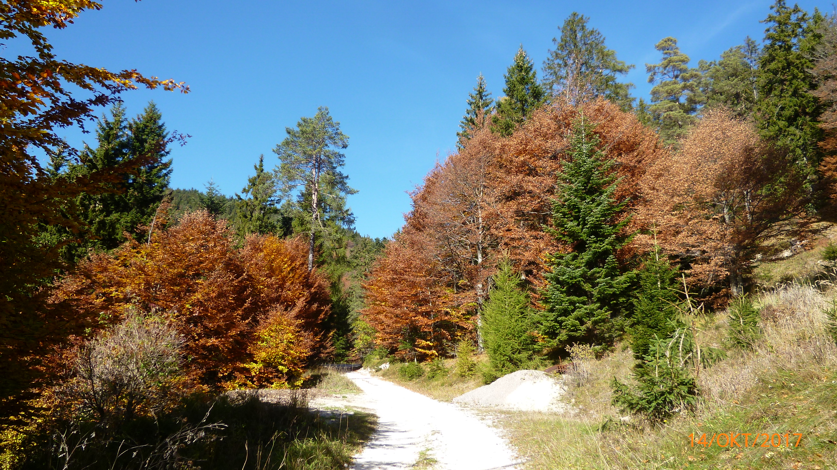 Tourenverhältnisse: Vom Ortskern, Schild E 5, auf tw. ruppigem Forstweg, mäßig bis mittelsteil in vielen Kehren