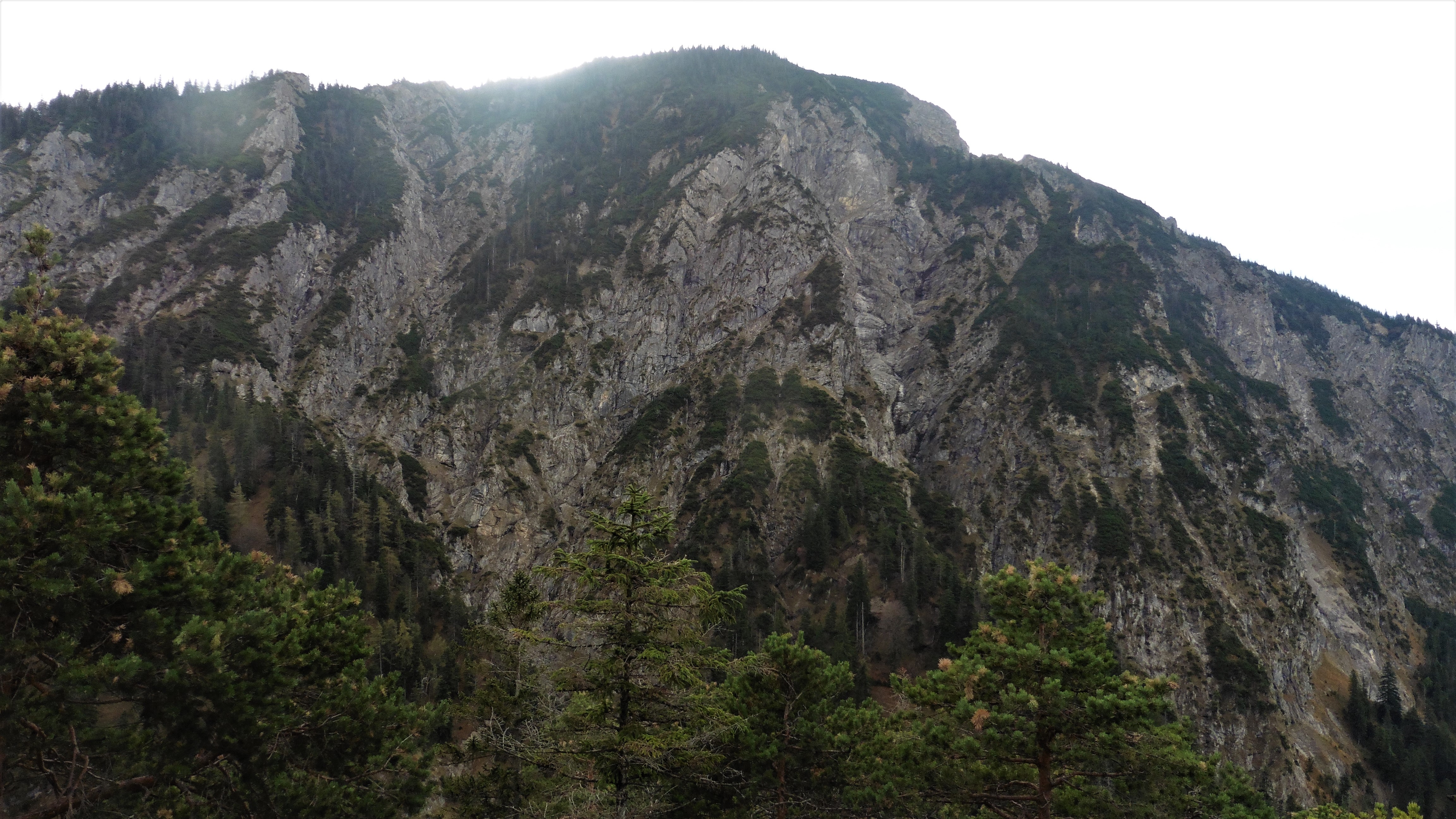 Bild 3: die Jochberg Nordflanke; die Anstiege über die 3 Pfeiler sind klettertechnisch gesehen nicht lohnend - brüchiger Fels mit Latschen garniert;