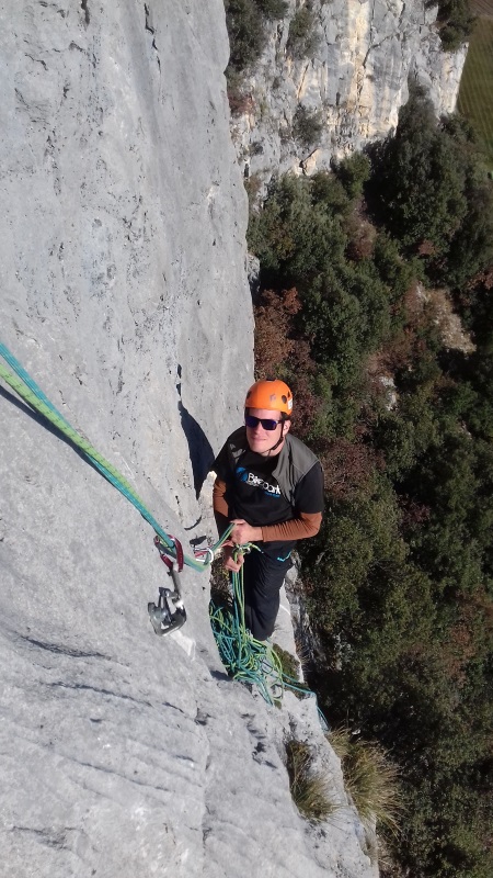 "Fiaba Nel Bosco" (anhaltend im Bereich 6 mit 6+ Stellen) an der Piramide Lakshmi. Vom Ausgangspunkt am Sportgelände in Dro in 15 Minuten zum Einstieg. Sehr schöne und abwechslungsreiche 10 Seillängentour mit guter Bohrhakenabsicherung. Nach oben hin werden die Abstände weiter, ein paar Friends von Vorteil.
