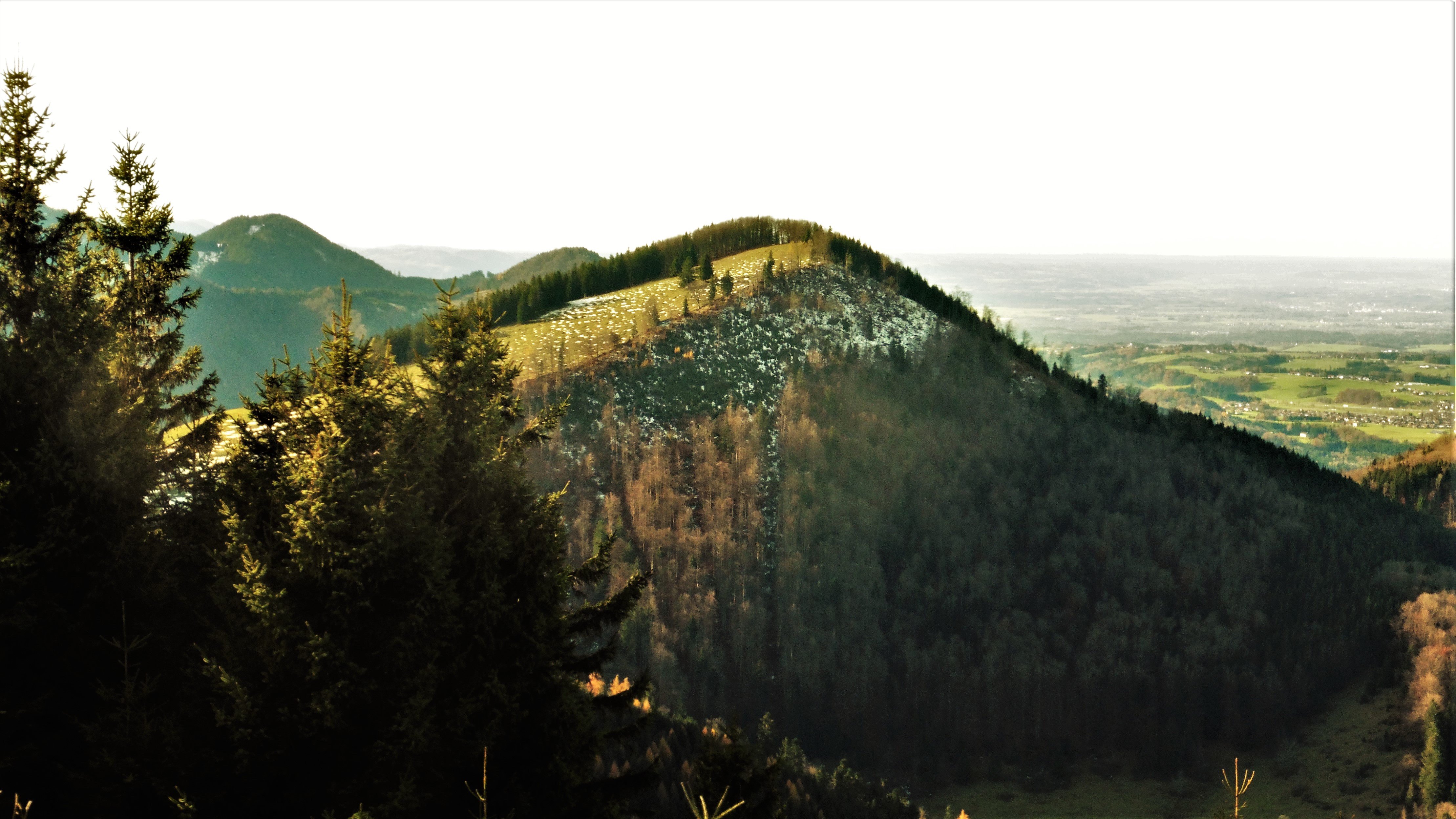 Bild 3: Erlbergkopf / rechts und Schwarzenberg / links vom Haindorfer Berg aus gesehen; der Abstieg erfolgt über die deutlich sichtbare Wiesenschneise;