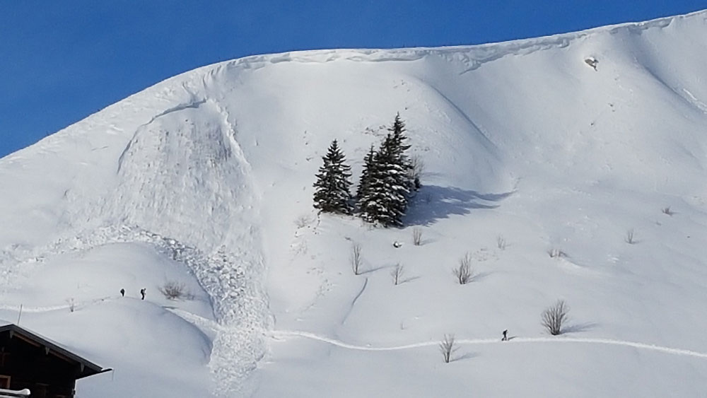 Gefahreneinschätzung: Für mich ein gefühlter 3er - Es gibt frische Triebschneeansammlungen, die zum Teil schwer erkennbar sind, weil es dann noch ohne Wind draufgeschneit hat. Es gab im Steilgelände frische Selbstauslösungen. Dass dennoch hemmungslos und offentsichtlich ohne Gefahrenbewusstsein durch so einen Hang gespurt wird (siehe Bild) - auch noch ohne Sicherheitsabstände (ich meine Sicherheitsabstände, nicht Entlastungsabstände!), finde ich immer wieder haarstreubend.