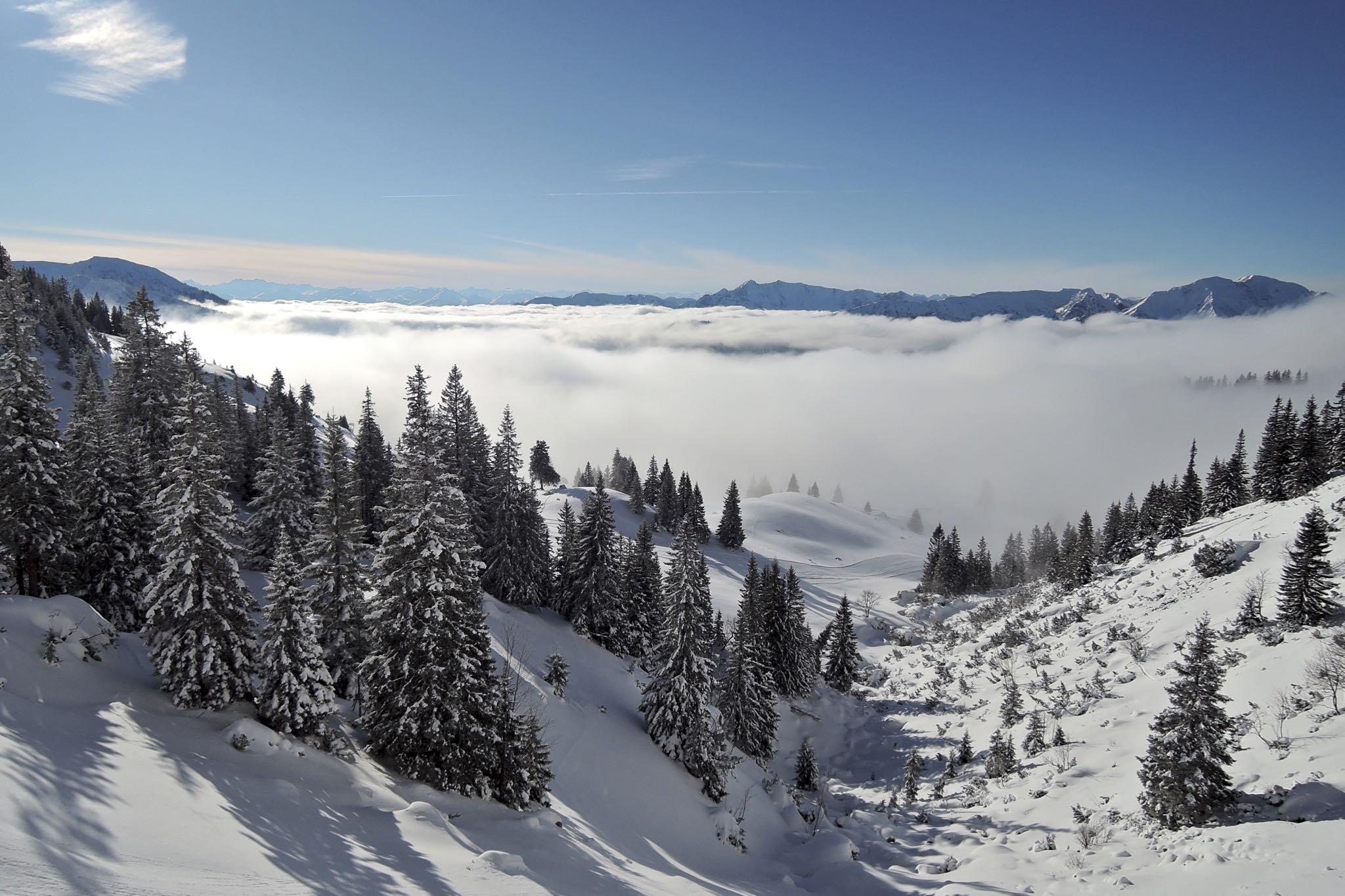 Tourenverhältnisse: Gipfel-O-Hang zwar im Schatten, aber dennoch sehr schwerer Schnee. Feiner Puder an den Wendelsteiner Almen, weiter unten schon schwerer ohne wirkliche Unterlage. Die zahlreichen Grundberührungen blieben folgenlos...