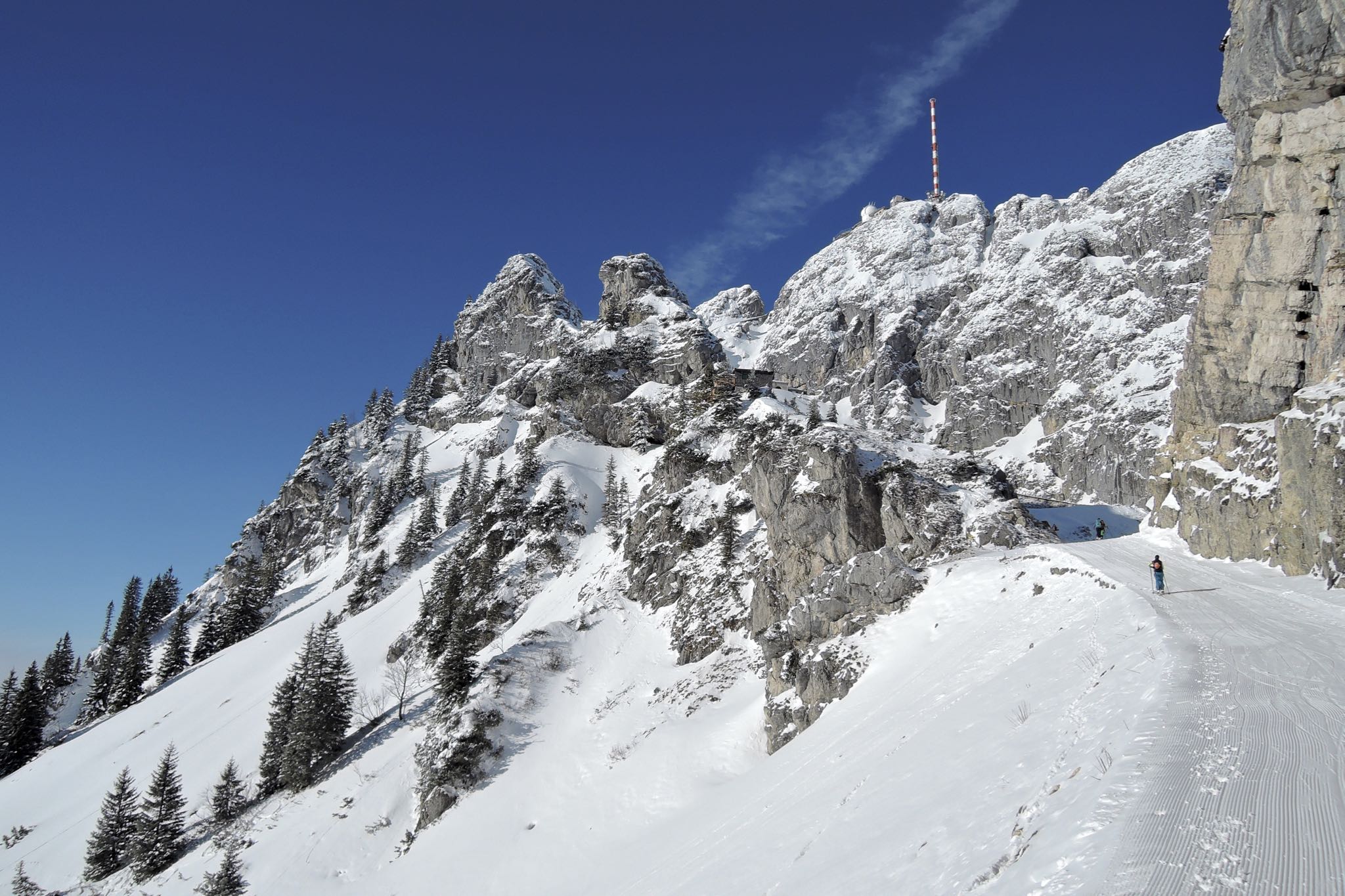 Sonstiges: Vom PP Wendelsteinbahn (3€) in Osterhofen (792m) Richtung ONO zuerst flach dem Verlauf der Piste durch die Bahnunterführung folgend, Oberberg nördlich umrundend, bald Richtig SO bis zum Waldrand. Dann stets der Lichtung Richtung O folgend in angenehmer Steigung hinauf. Auf 1100m Richtung NO über eine Einsenkung hinweg unterhalb der Siglhütte (1334m) teils steil hinauf zum Hochplateau der Wendelsteiner Alm (1420m) südlich des Wendelsteins (1838m). Weiter links des Lacherlifts auf die Kesselwand (1721m) zu bis zu einer Hütte (1510m). Von dort Richtung NO in einem weiten Linksbogen zur Zeller Scharte (1611m). Von nun an Richtung W unter der Zahnradbahn hindurch den steilen Gipfelhang hinauf zum Wendelsteinkircherl und ins Wendelsteinhaus (1724m).
