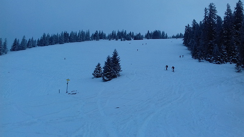 Tourenverhältnisse: die Sonne hat uns heute leider im Stich gelassen, die Sicht war aber ok. Zunächst vom Parkplatz aus auf der aperen, gesalzten!! Straße Richtung Untere Firstalm kurz die Ski hochgetragen. Dann rechts ab und über eine herrliche Winterwunderlandschaft hinauf zur oberen Straße (Rodelbahn) die vom Spitzingsattel herkommt und auf der bekannten Route (natürlich stark verspurt) hinauf zum Wintergipfel mit der Messsation. Abfahrt hinunter zur Freudenreichalm (feiner Pulver, aber nicht ganz sharkless) und Gegenaufstieg zum Freudenreichsattel mit anschließender Abfahrt auf der Piste hinab zum Ausgangspunkt. Route siehe Tourentipparchiv: