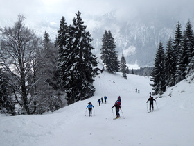 Tourenverhältnisse: Leider hat sich die im Wetterbericht angekündigte Sonne heute nicht blicken lassen, oben dichter Nebel, weiter unten ausreichende Sicht. Der Schnee: Dort, wo er noch nicht zusammengefahren ist, sehr schon pulvrig. Das Gros der Leute ist heute zur Lacherspitz angezweigt, wir haben die Wärme in der Wirtschaft an der Bergstation vorgezogen (dort steht jetzt auch eine Holz-Gams als Kunstwerk - zwei reale und ziemlich dicke Gämsen hatten wir kurz zuvor gesehen). In der Abfahrt wird die teils schon sehr abgeschrubbte Schneedecke mit jedem Höhenmeter dünner, Steinski ratsam. Geht aber recht gut.