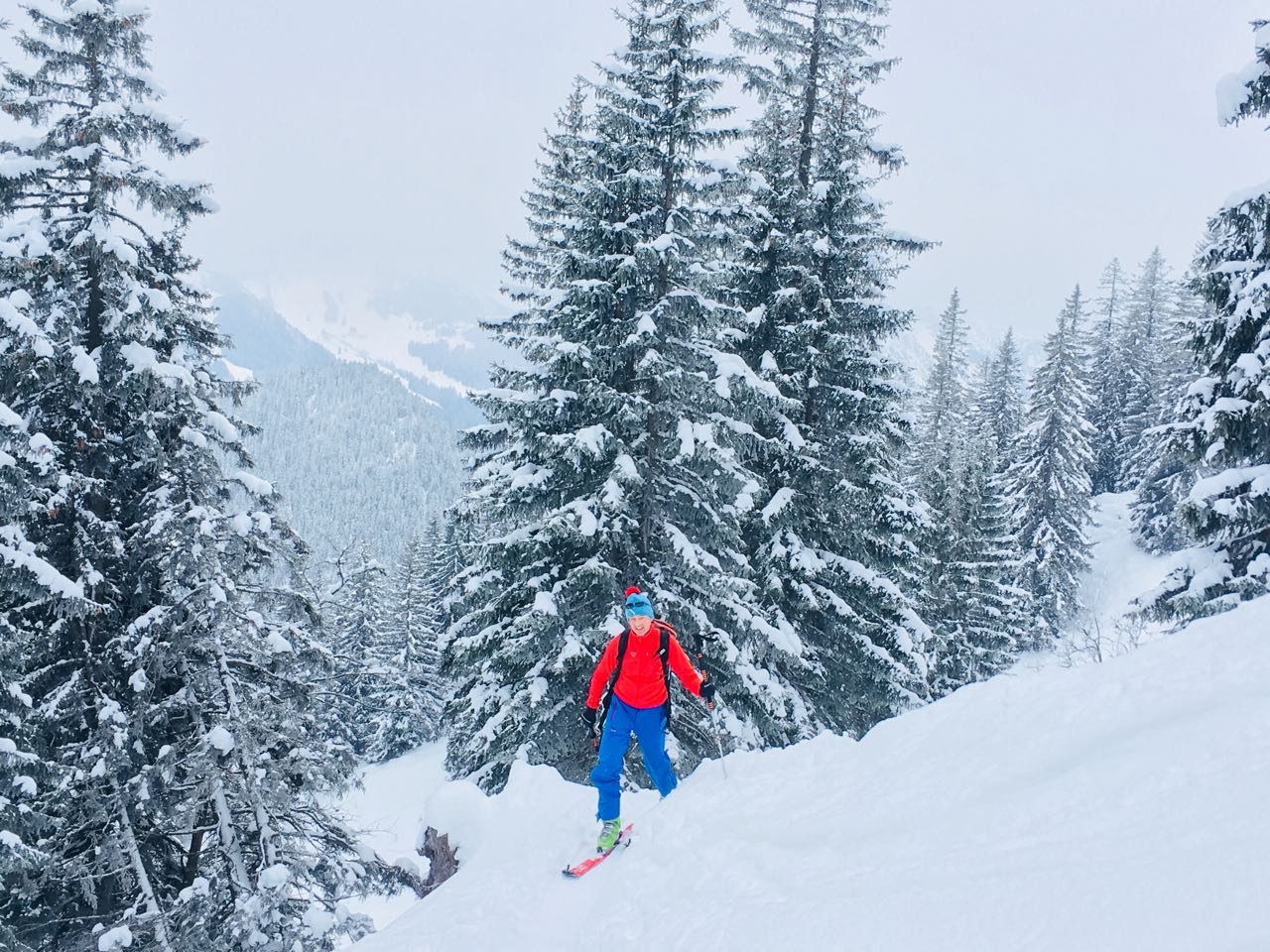 Sehr schöner Pulver, aber Hauptabfahrtsrouten schon pistenartig verspurt. Wer schaut, findet aber noch immer ein paar unberührte Passagen abseit vom Mainstream.