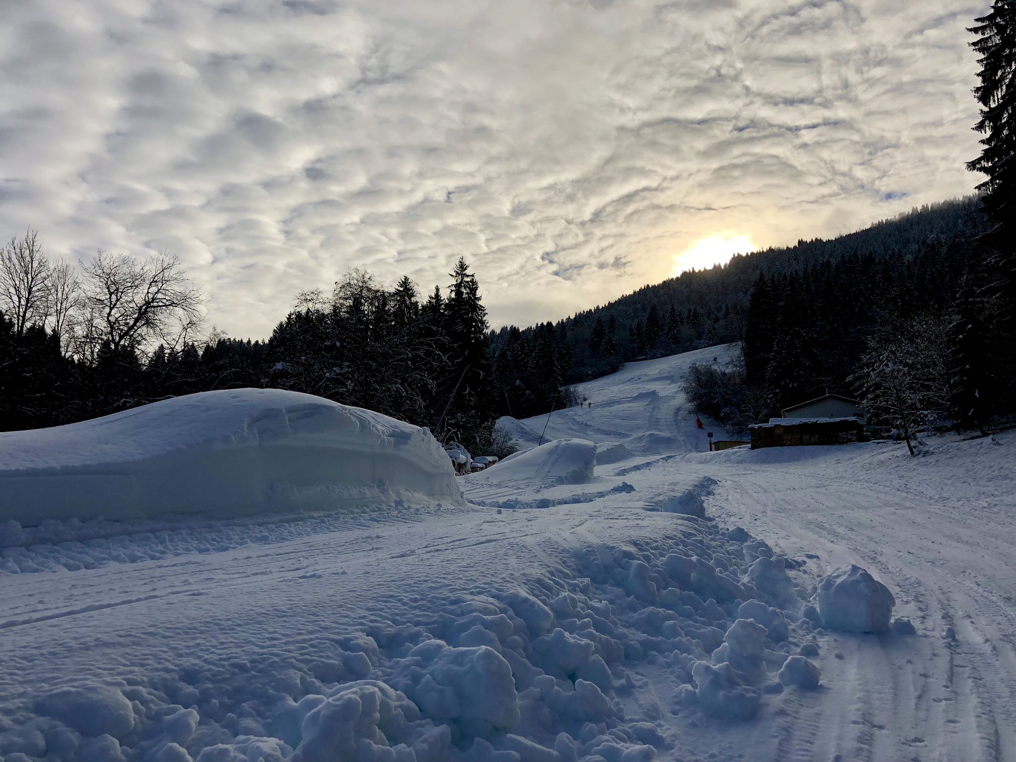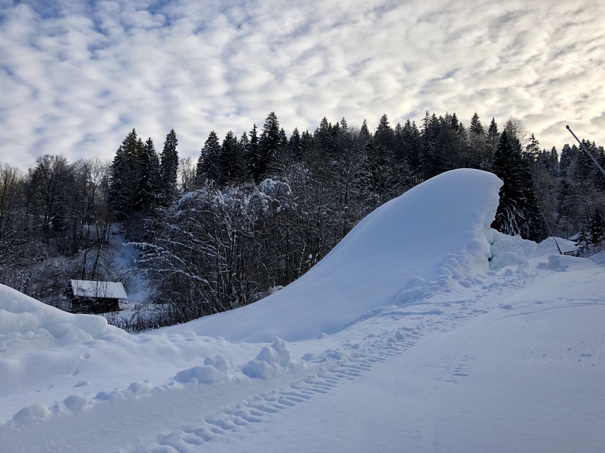 Sonstiges: Vom PP Hausbergbahn (730m) über die auf 10m Breite präparierte Kochelbergabfahrt auf den Hausberg und über die Skiroute Standard-Tonihütte Richtung Trögelhütte (1436m). Neben dem geschlossenen Tunnel über die Kandahar und weiter entlang der Skiroute zur noch geschlossenen Kreuzalm (1600m).