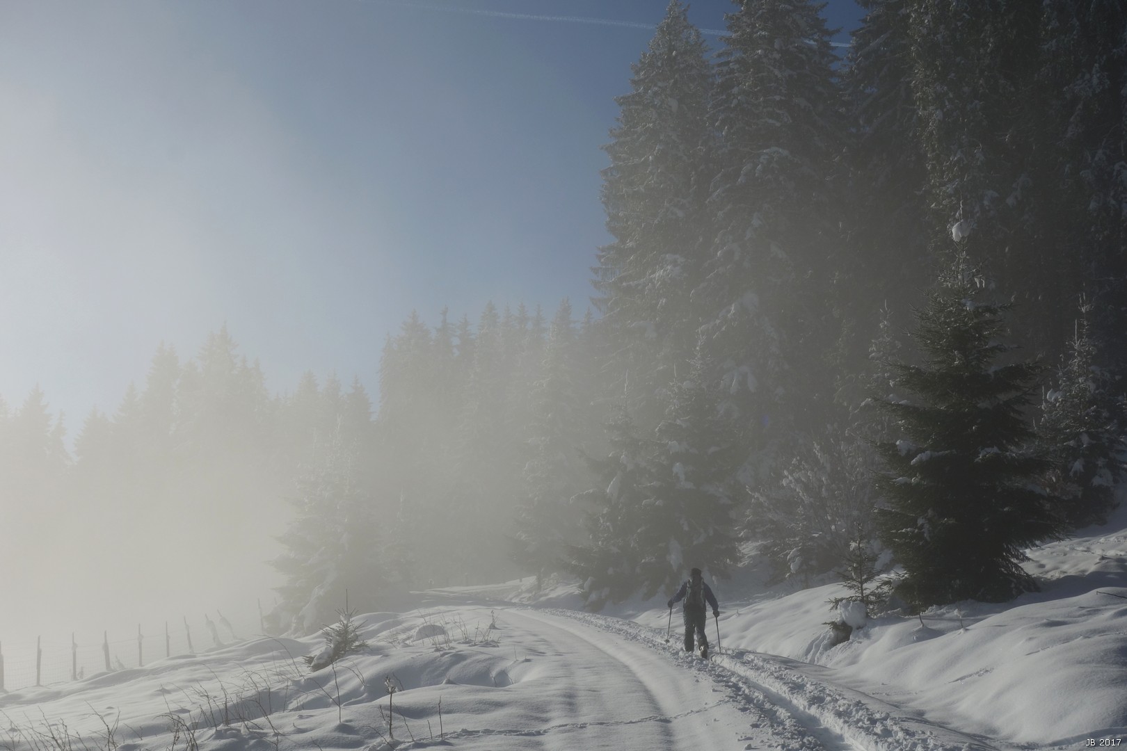 Bei der Abfahrt unter der Falkenmoosalm haben wir die breite unverspurte Forststraße statt des steinigen Hohlwegs gewählt, konnten aber wegen des tiefen Pulvers kaum abfahren.