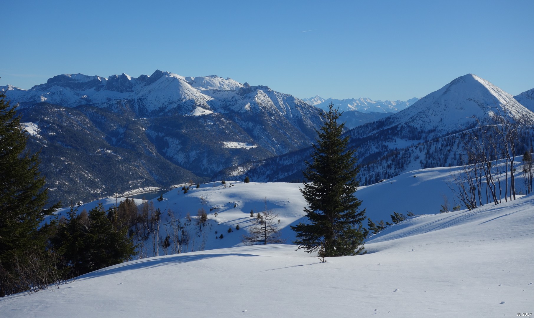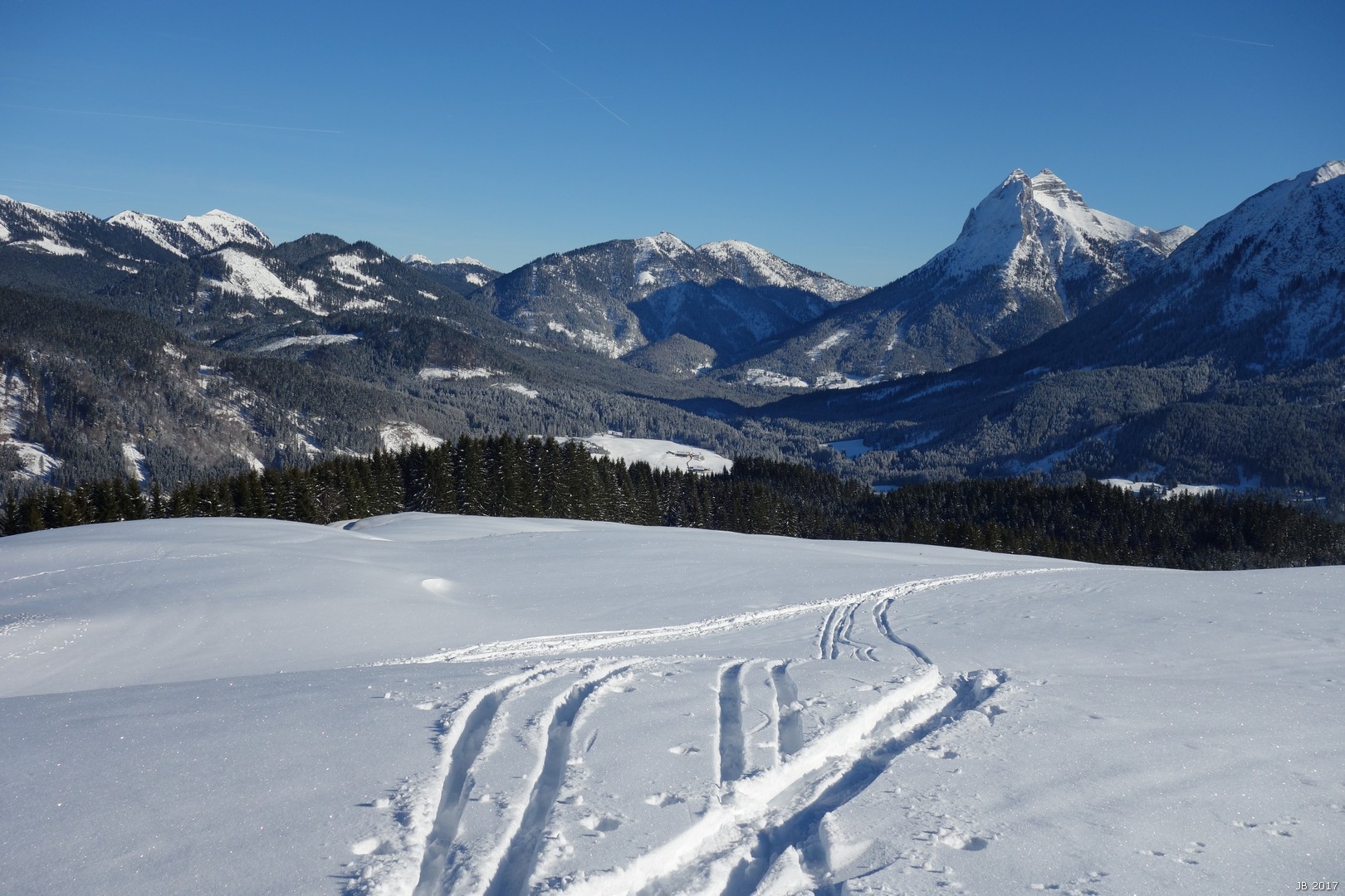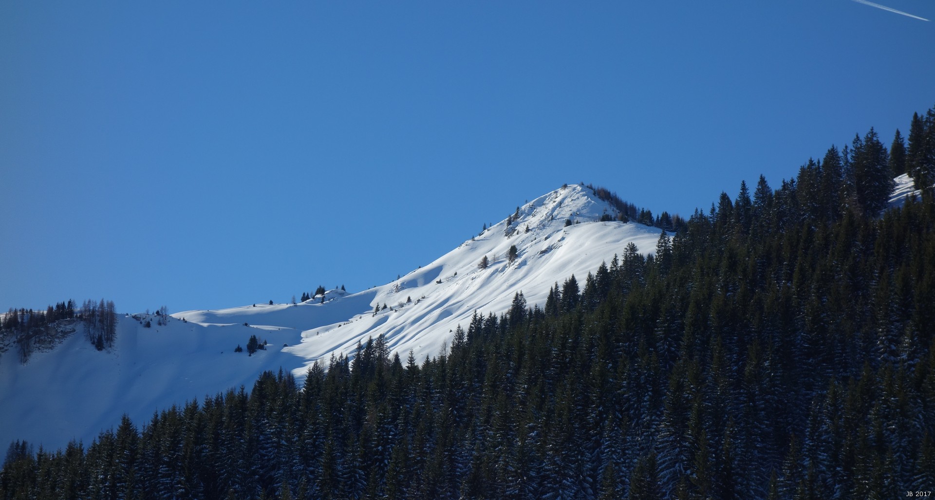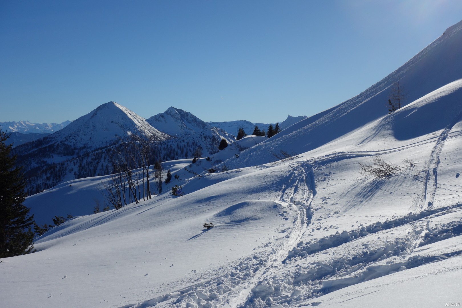 Vom PP weg reichlich Pulverschnee (ca. 15 cm), ab der Falkenmoosalm ca. 20 cm mit guter Aufstiegsspur bis zum steilen Grataufschwung unterm Gipfel; dort windgepreßt. Da vom Südost-Rücken ein Schneebrett abgegangen war, verzichteten wir auf die Querung, bei LWS 3 sicher kein Fehler. Im Schatten herrlicher Pulver bei der Abfahrt, an sonnigen Stellen war der Schnee schon pappiger.