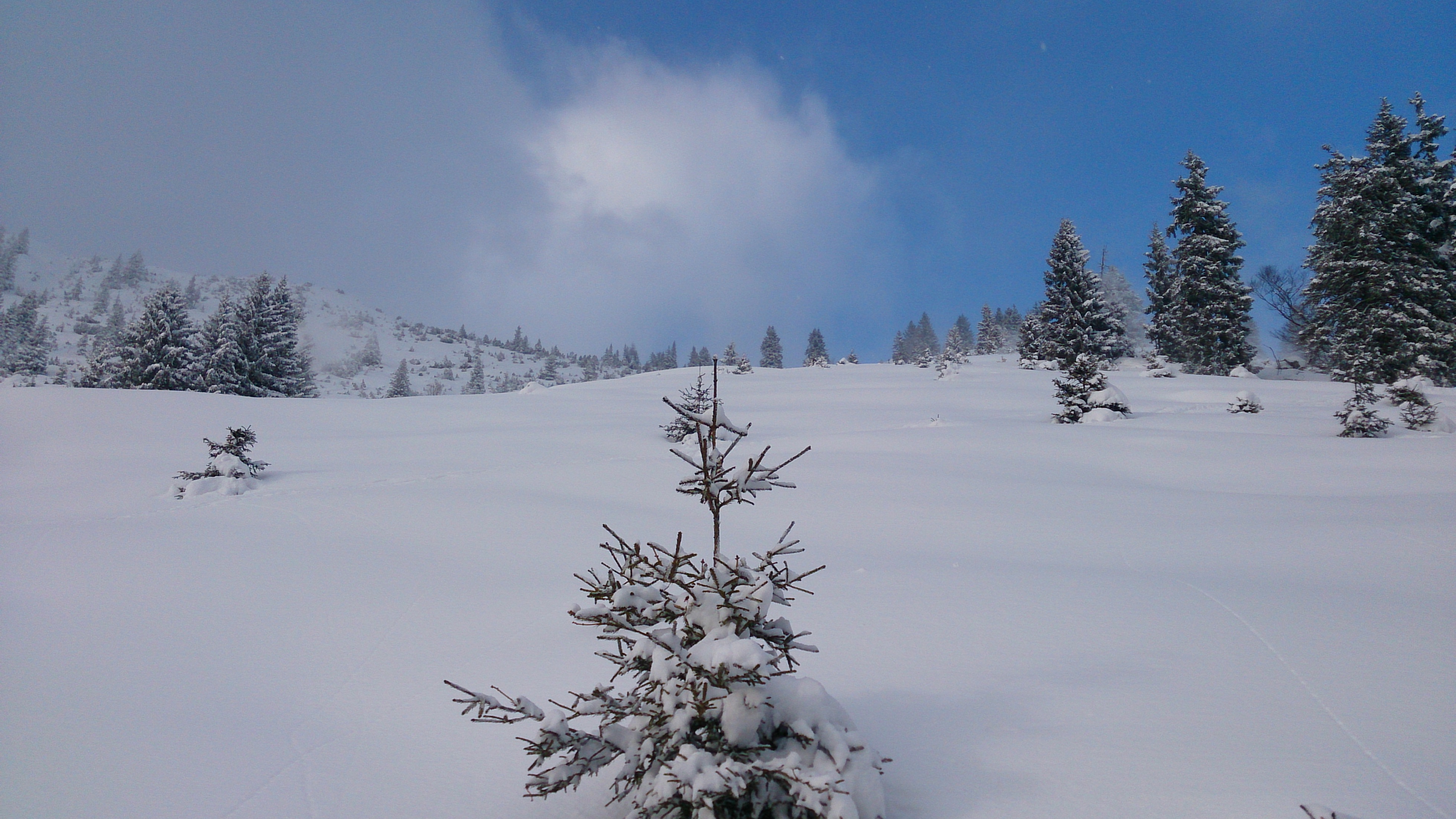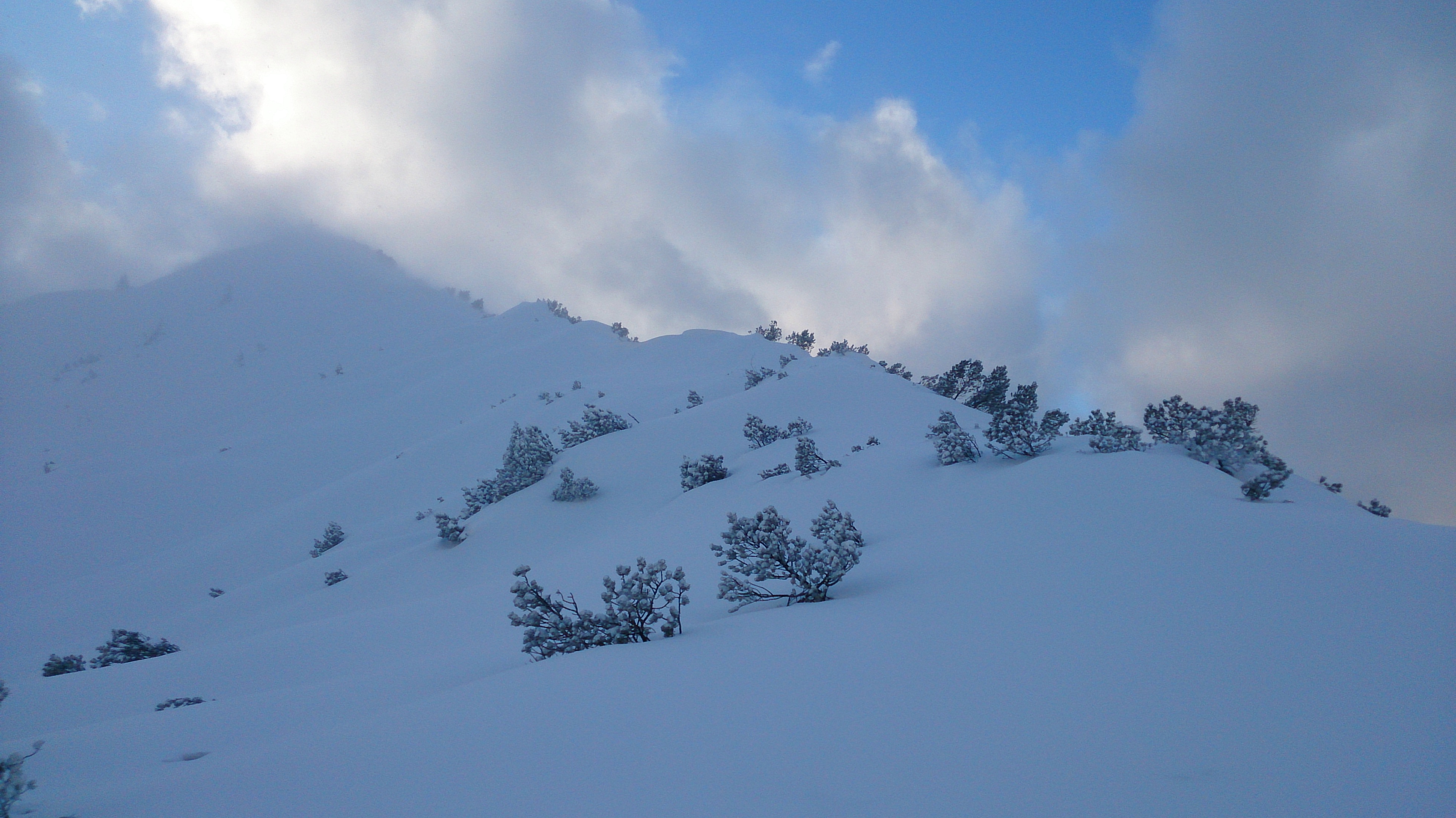 Tourenverhältnisse: viel Pulver vom Ausgangspunkt weg, ca. 20 cm Neuschnee, am Gipfelkreuz extremer Wind