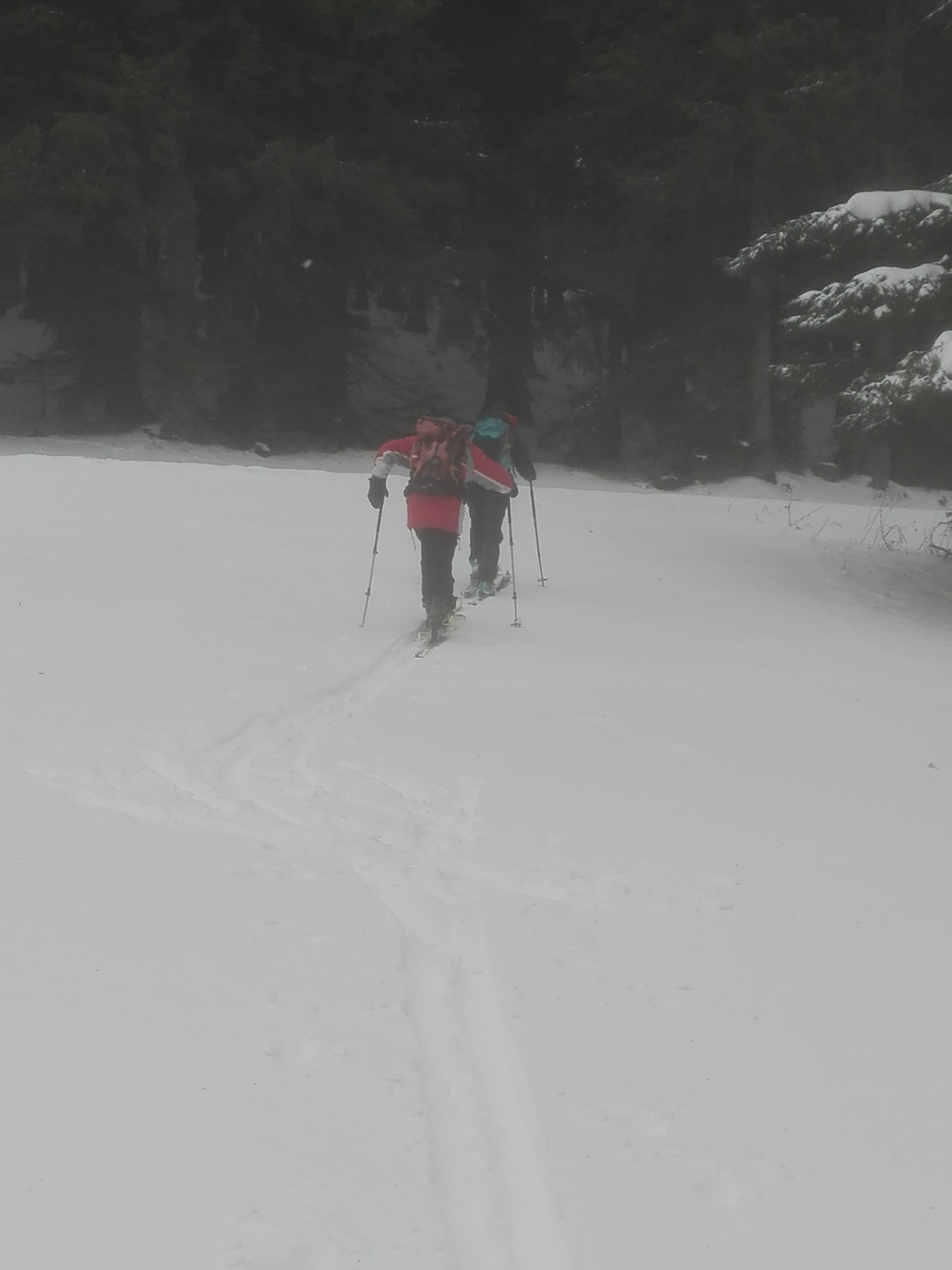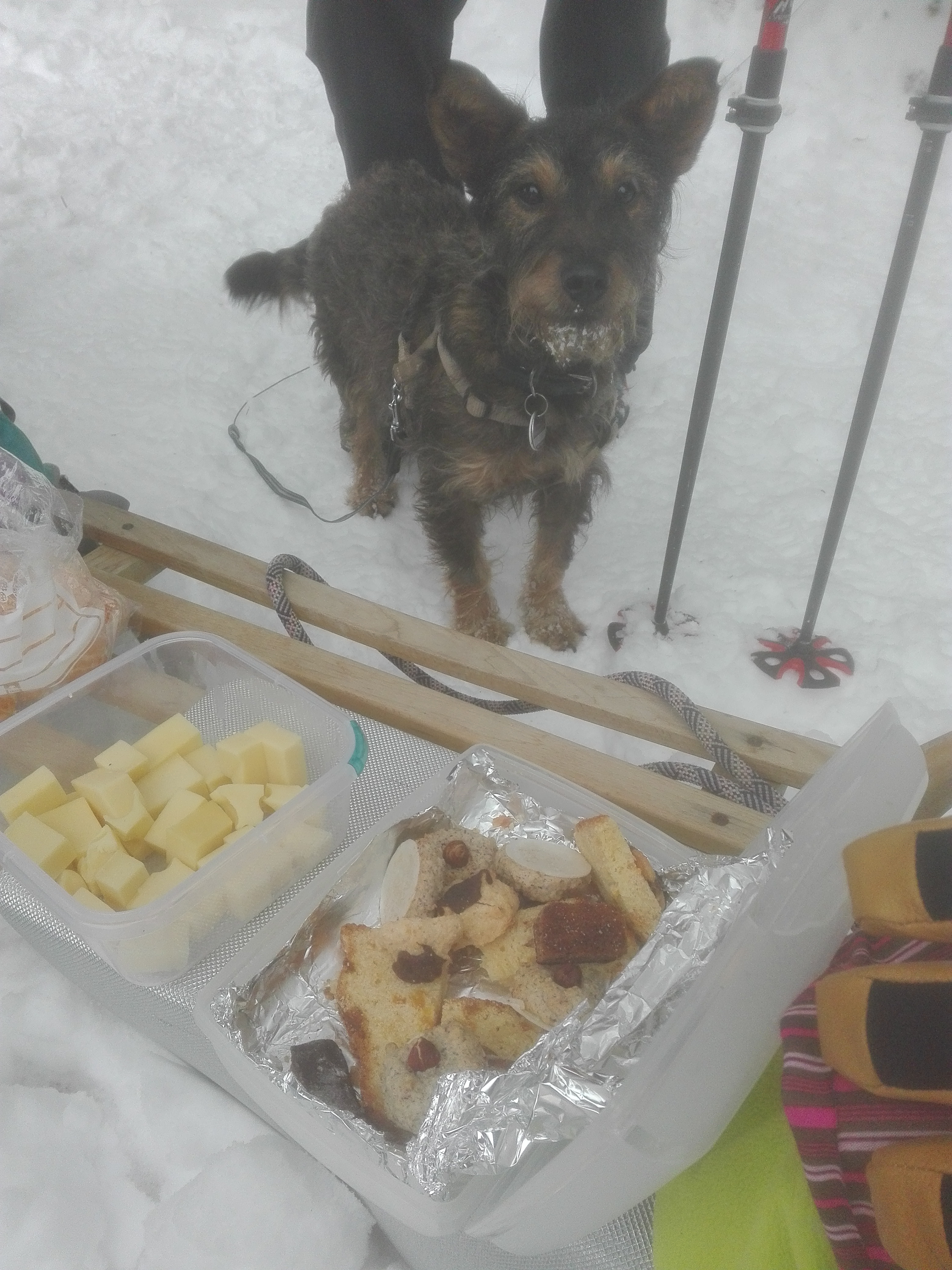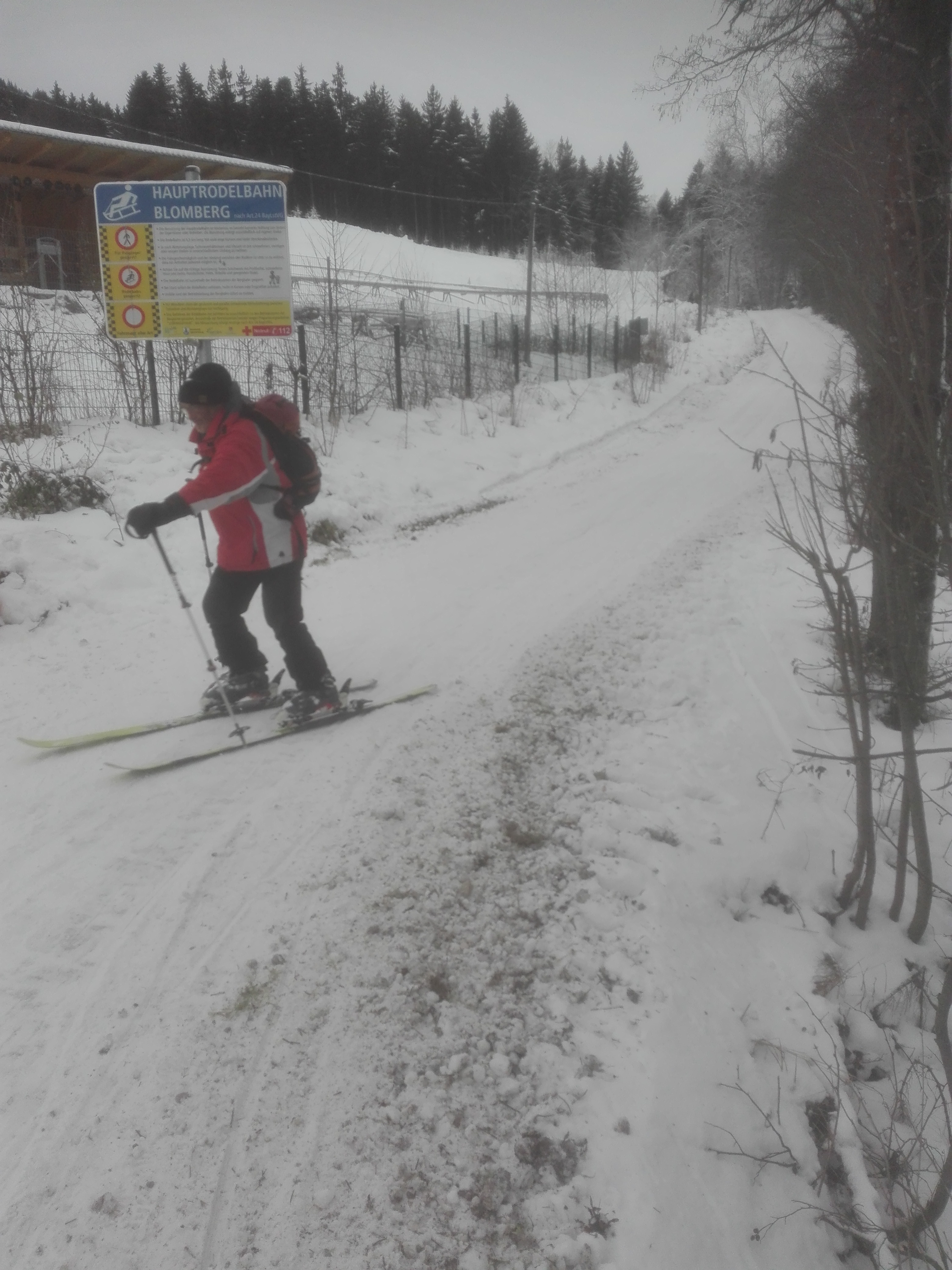 Tourenverhältnisse: Nicht lohnend. Man kann die Skiroute zwar vom Auto weg mit Ski gehen, "dank" einer Pistenraupe, die schon gestern oder früher hochgefahren ist, ist die Route streckenweise aber mit Steinen und Dreck durchsetzt, denen man im Aufstieg noch ausweichen kann, bei der Abfahrt teilweise kaum noch. Weiter oben keine Steine mehr, aber dort schaut immer wieder Gras raus. Oberhalb ca. 1100m dann ok. Ein paar schöne Schwünge waren vom Blomberghaus zur Talstation des dortigen Schleppers möglich. Von der Bergstation des Sessellifts runter zu war es bis zur Mittelstation überwiegend brauchbar, ein Stückchen auch schlecht (abrutschen neben Dreck oder Schuss). Ab der Mittelstation wechselten wir auf die Rodelbahn. Die war hart bis eisig, aber ohne Steine. Zur Zeit gibt es definitiv schönere Ziele. Skifahren war aber heute auch nicht der Hauptzweck der Tour (vgl. Bilder)