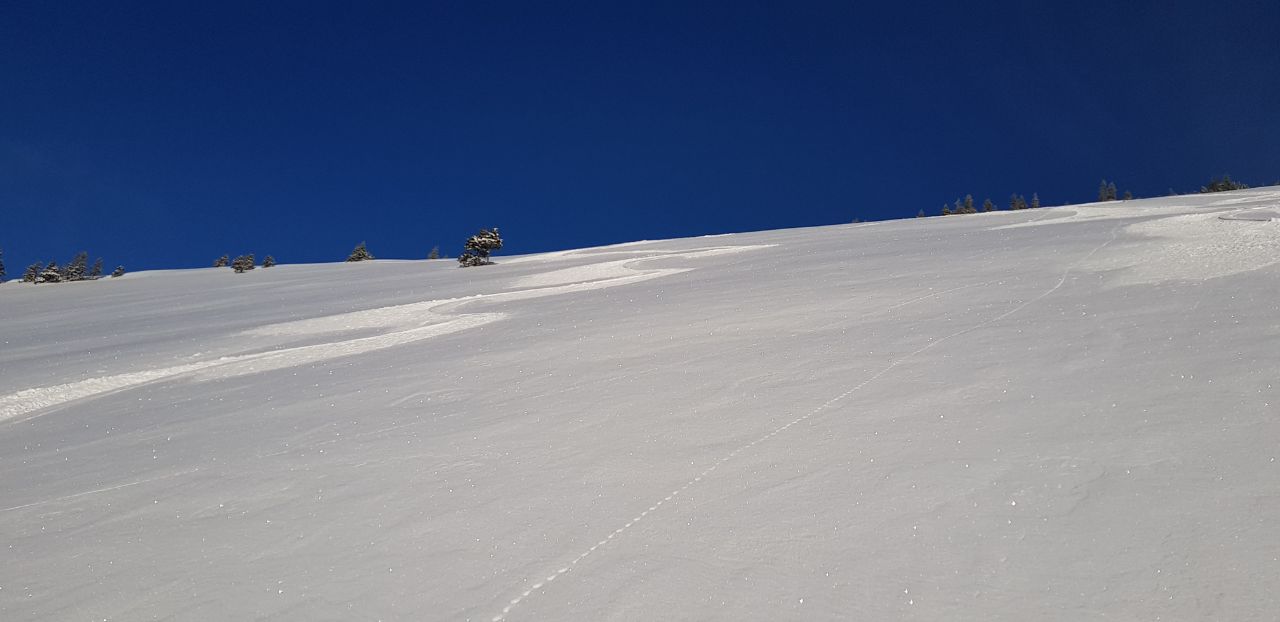 Abfahrt über den vorg. freien Hang (fast unverspurt) ca.15 cm Pulverauflage auf alt, dann hinunter rechts der Glockenwand und später Lochgraben.