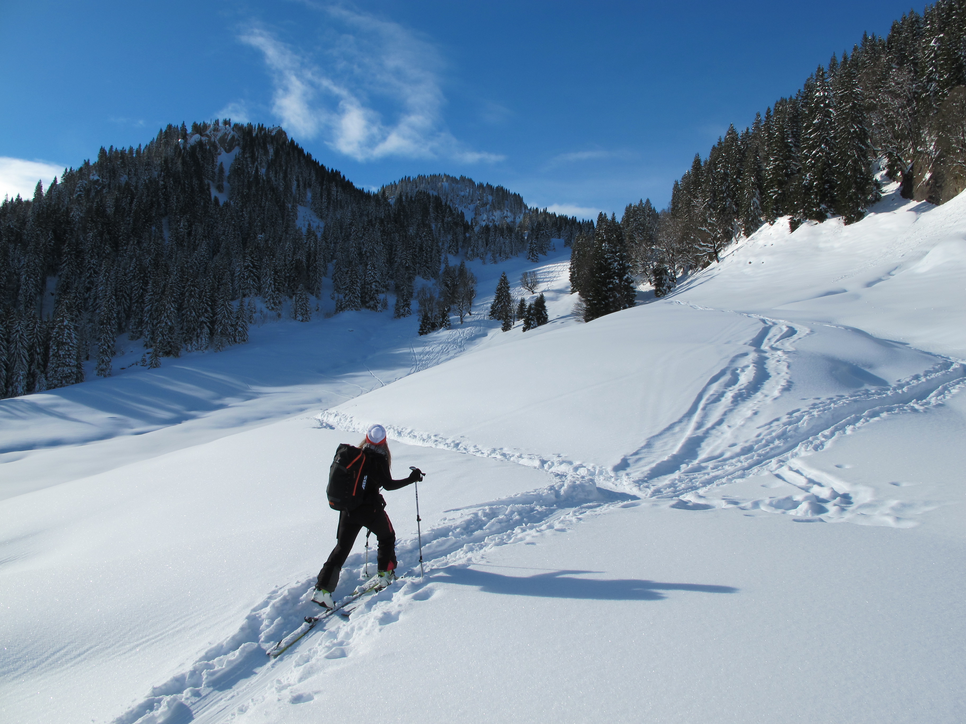 Tourenverhältnisse: Unglaublich wieviel Schnee es in den Allgäuer Bergen bis in die Tallagen hat. Schnee heute pulvrig mit bis MIttag leichter Kruste, am frühen Nachmittag bei der zweiten Abfahrt (dann vom Ostertalberg) ohne Kruste, dafür ein bisserl feucht- allesabergut zum Fahren!