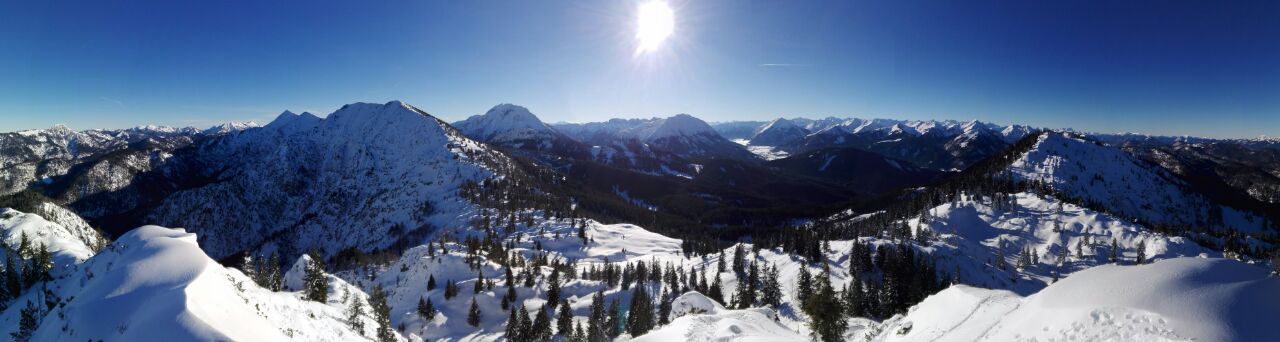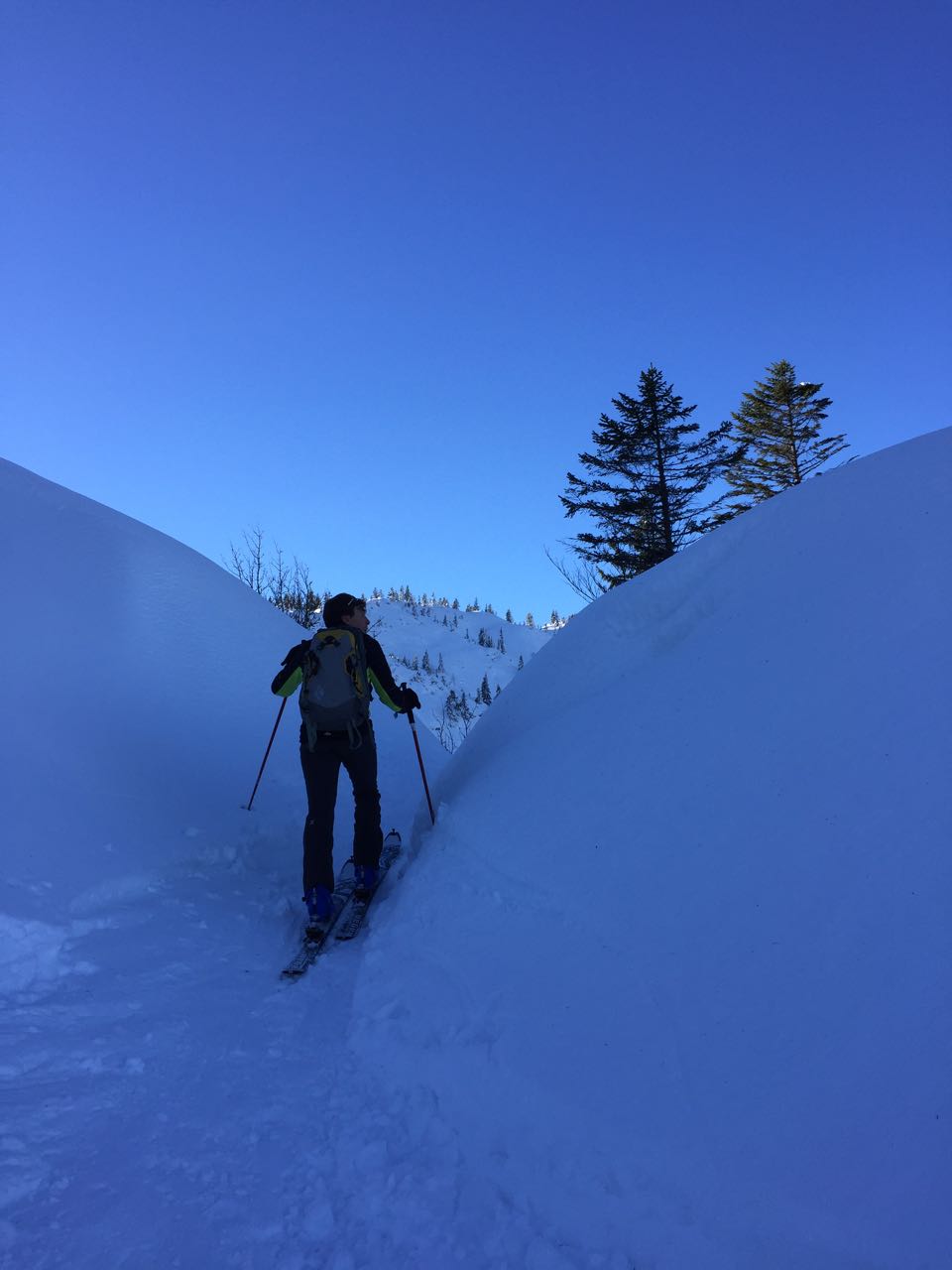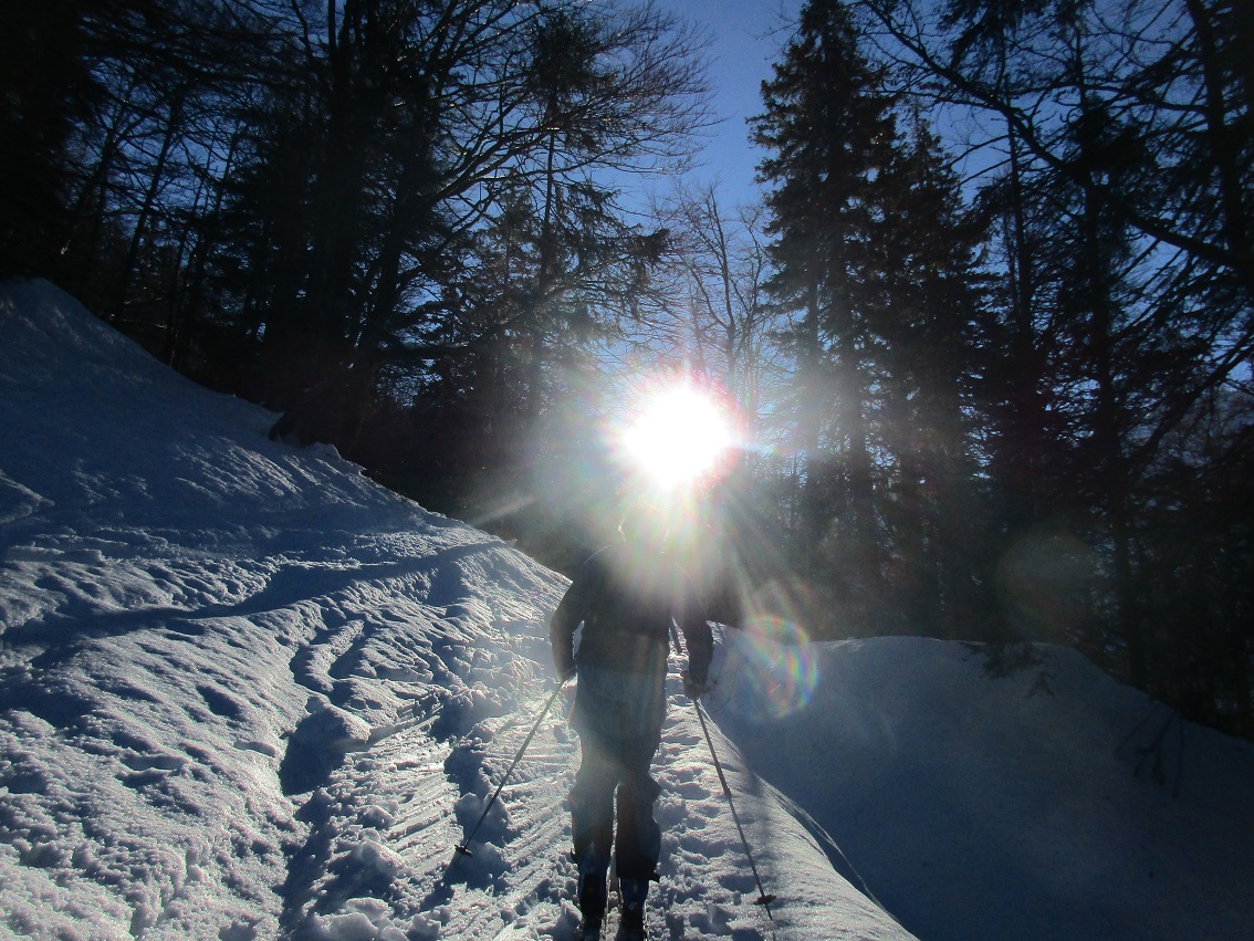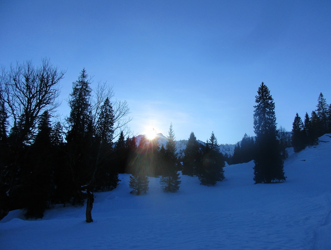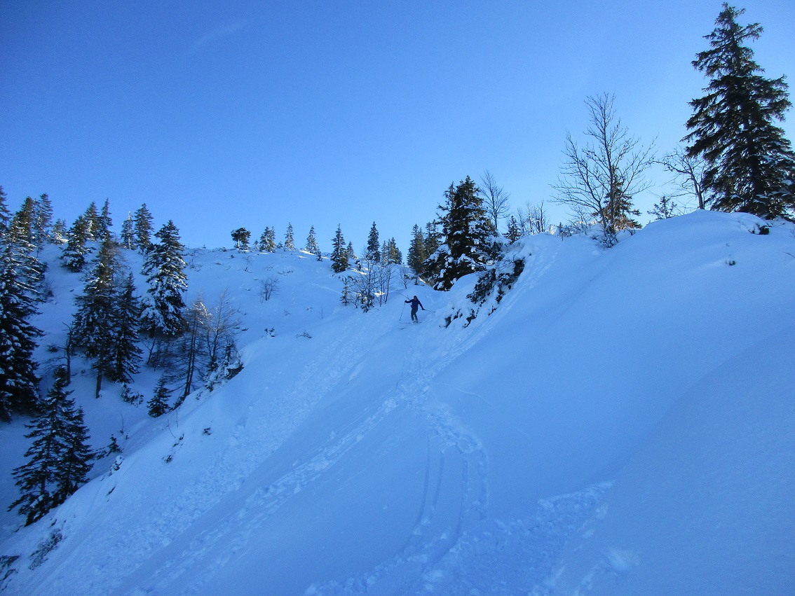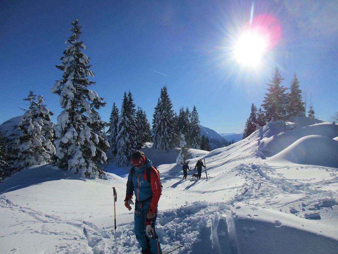 Tourenverhältnisse: Genug Schnee, harter Schnee bis ca. 1350 m / drüber wird er leicht pulvrig und in der Sonne sulzig / bei der Abfahrt trägt der Harschdeckel