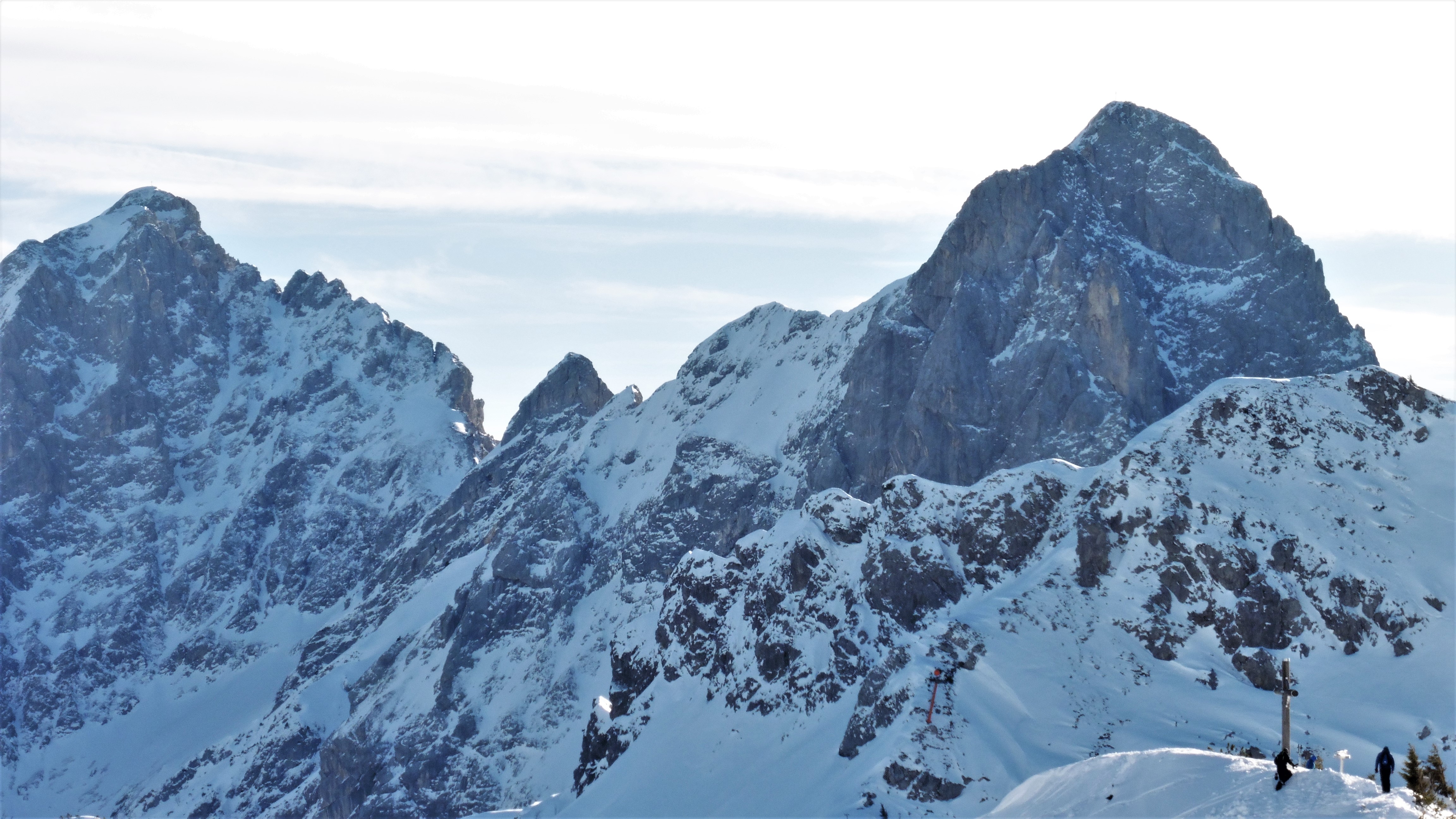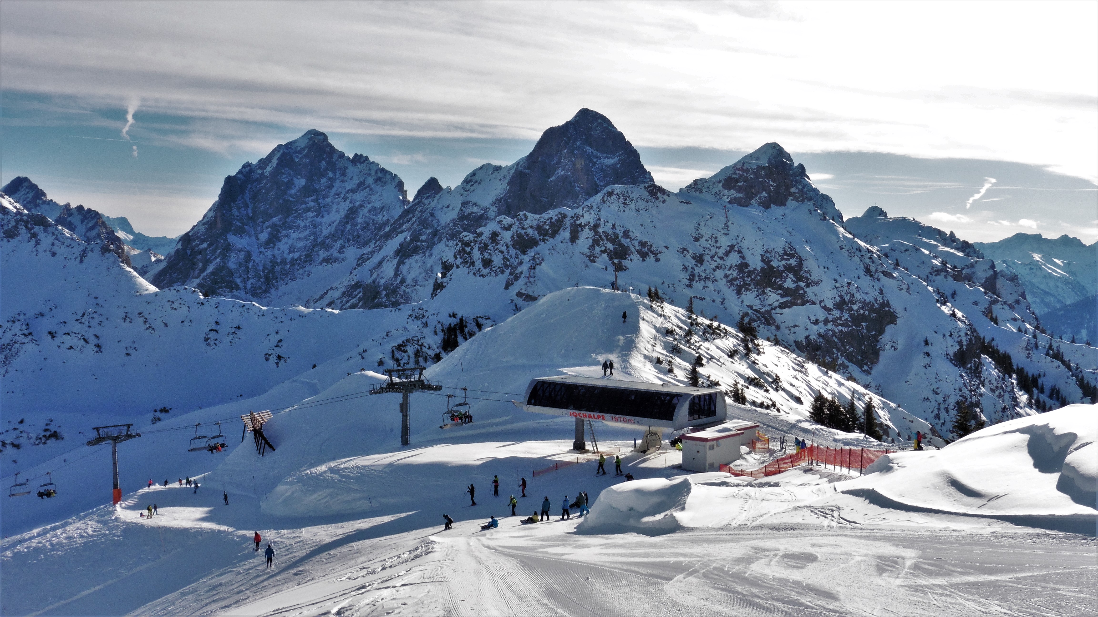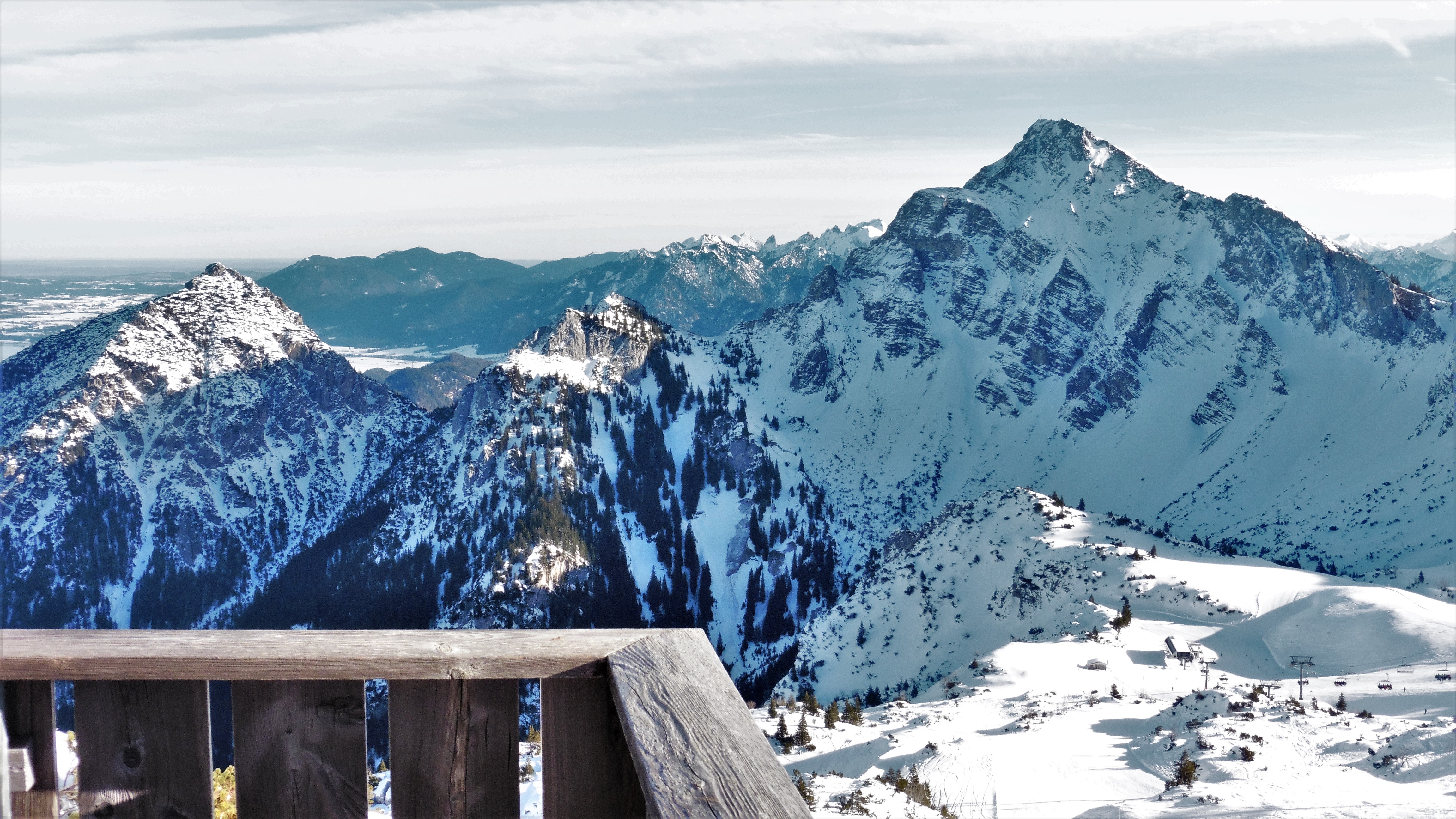 Bild 1: Blick über die Sessellift-Bergstation zu Kellespitz, Gimpel und Rote Flüh;