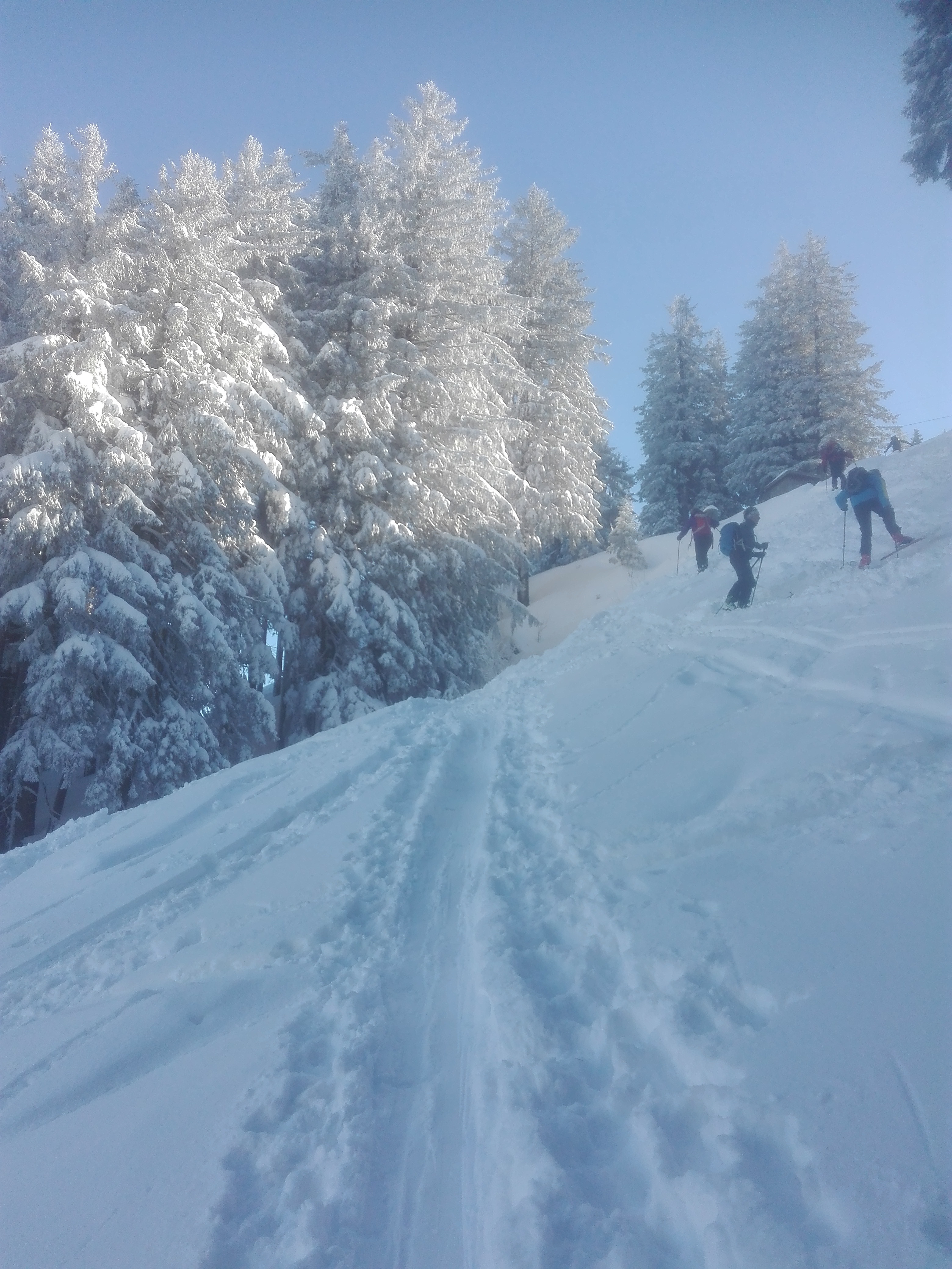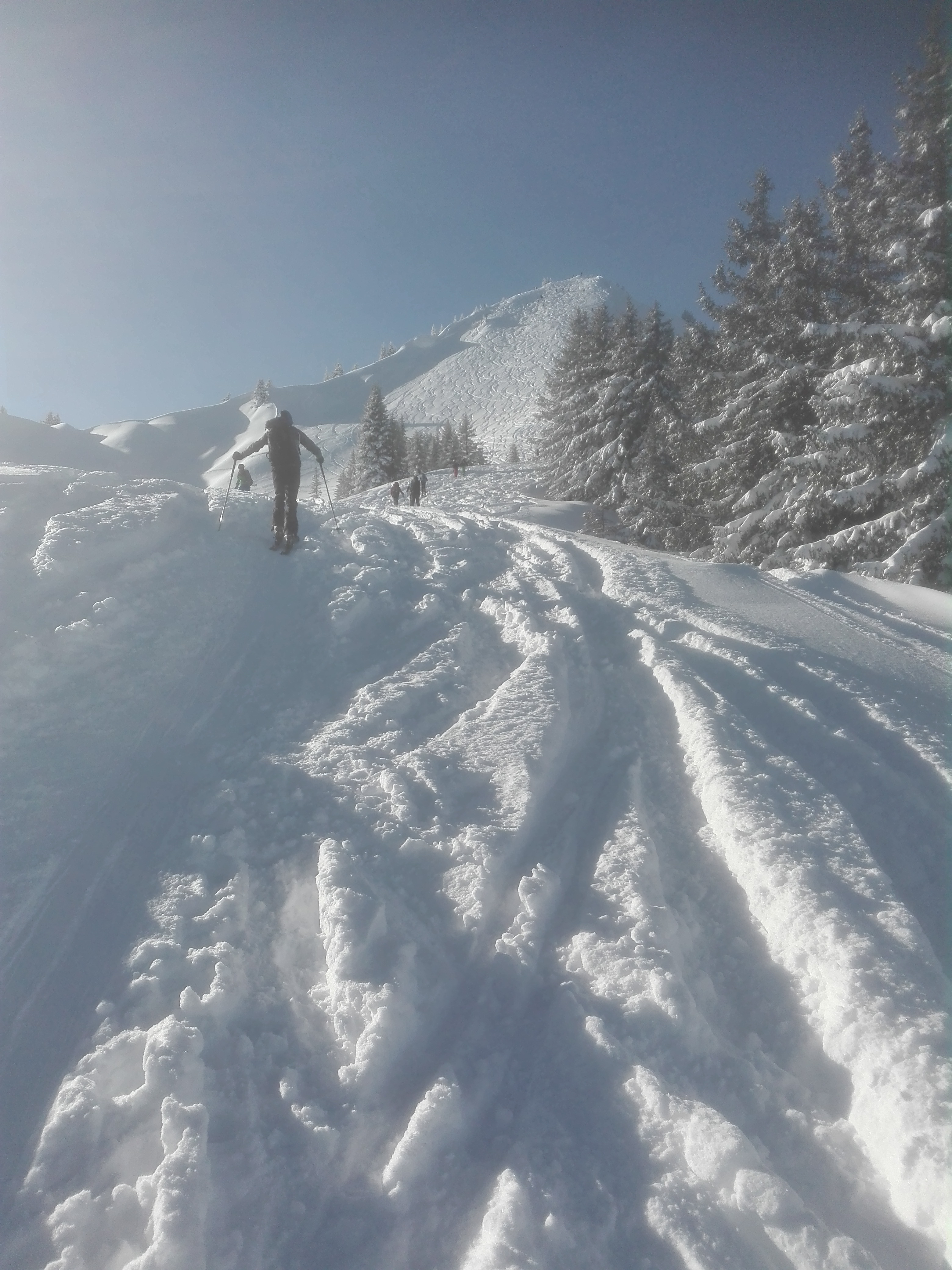 Ach ja - und Pulverschnee ohne Ende, unten ca. 20cm, oben ca. 40 cm, teilweise waren die Hänge schon zu flach, um noch flott runter pflügen zu können. Trotz der vielen Tourengeher noch Platz für neue Spuren im Tiefschnee.