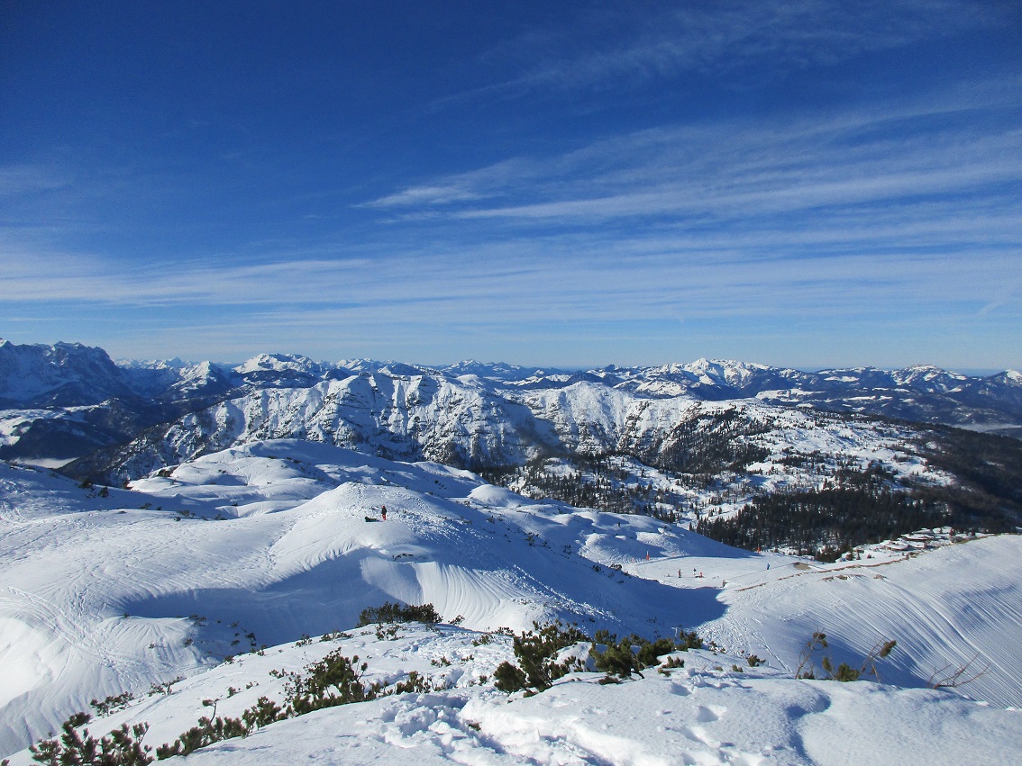 Tourenverhältnisse: Sehr gut / Unterer Pistenabschnitt ( 3 km ) noch ohne Gegenverkehr / im freien Skigelände zum ' Kalten Wasser ' / von hier bis kurz über die Stallenalm am Pistenrand = Abfahrermenge hielt sich in Grenzen / nun wieder im freien Gelände auf die Südseite und Aufstieg über den KL.St. Schuster Gangl zum Gipfel / Felspassagen frei aber noch vui Schnee / Abfahrt über Kammerköhr und Möslalm perfekt zu fahren