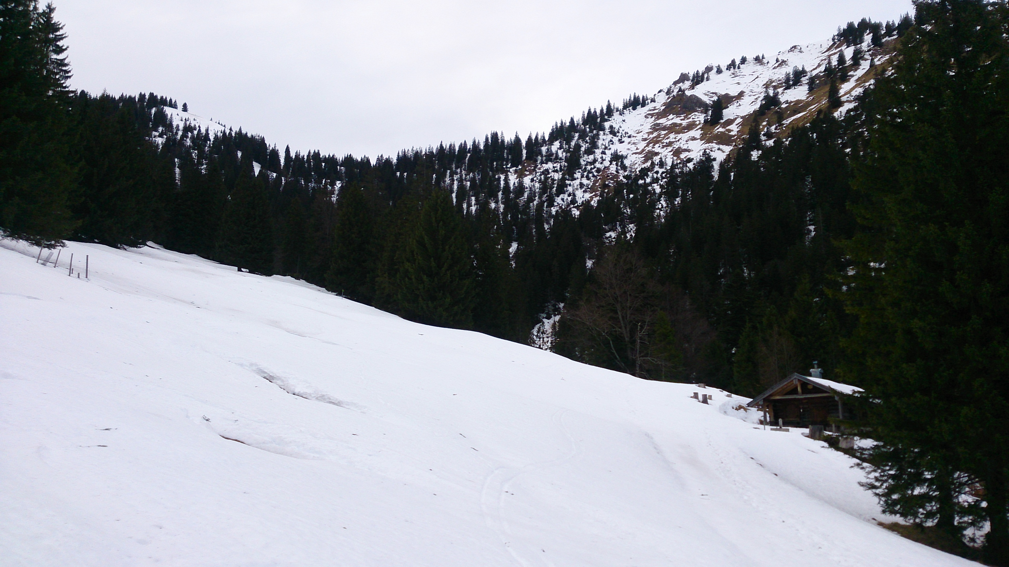 Insgesamt ist die Tour bei solchen Verhältnissen wohl nicht zu empfehlen. Wahrscheinlich haben Schneeschuhgeher auch ansonsten mehr Spaß dort. War heute auch der einzige Tourengeher, ansonsten nur Schneeschuhgeher sowie zwei Winterwanderinnen (wie weit die gegangen sind, kann ich aber nicht sagen - oben sind Schneeschuhe schon gut). Das Gießenbachtal bräuchte mehr Schnee, um mit Skiern Spaß zu machen, dann aber sicher sehr lawinengefährlich.