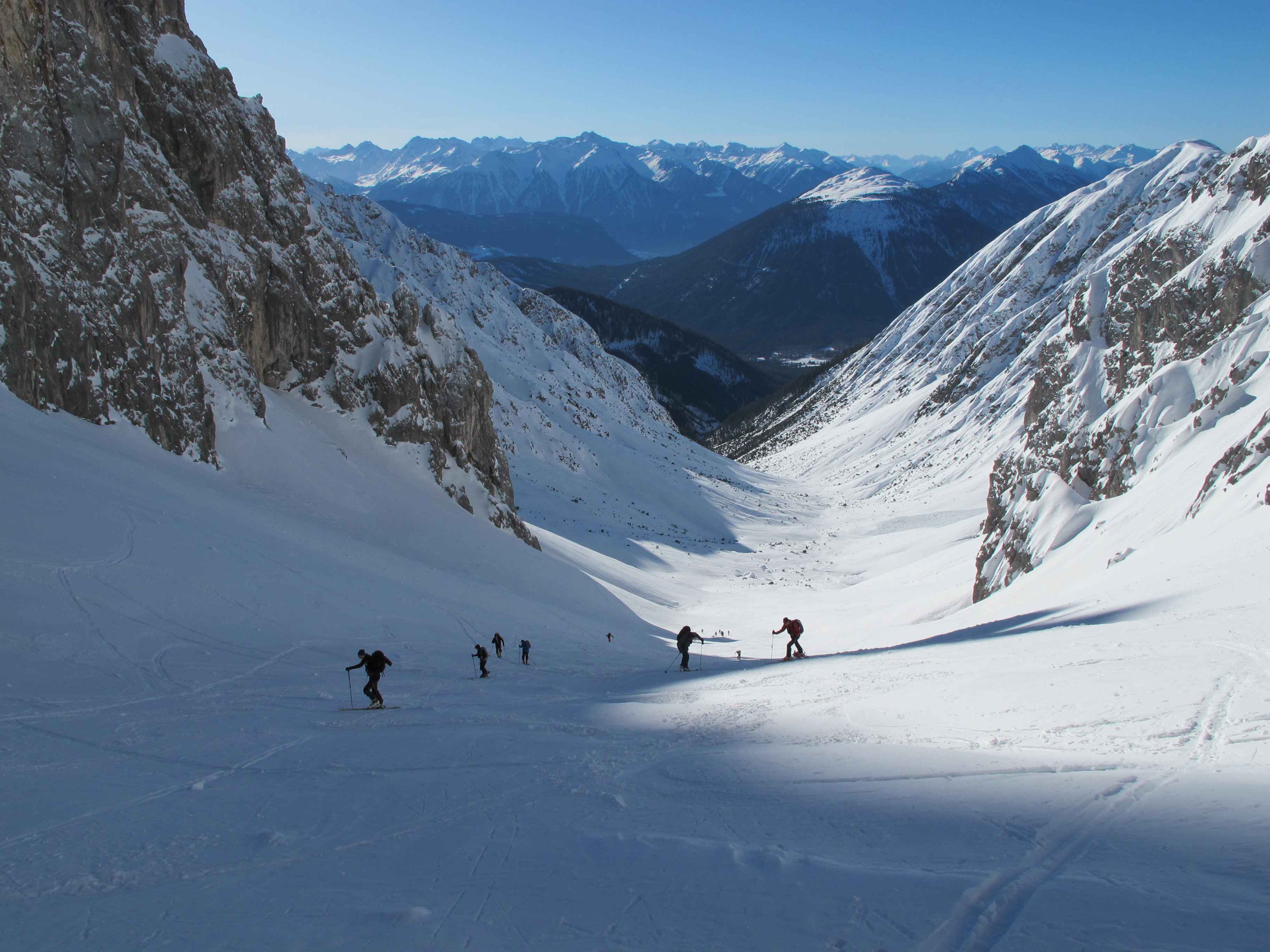 Tourenverhältnisse: Trotz Südseite von unten weg ausreichend Schnee und auch auf der Rodelbahn vom Lehnberghaus herunter (Abfahrt am Ende der Tour) gute Verhältnisse. Trotz Südlicher Exposition firnt das Kar zur Grünsteinscharte nicht auf. Hier liegt eine hausdünne Pulverschicht auf einer sehr harten Unterlage. Etwas ruppig, aber sonst gut zu fahren.