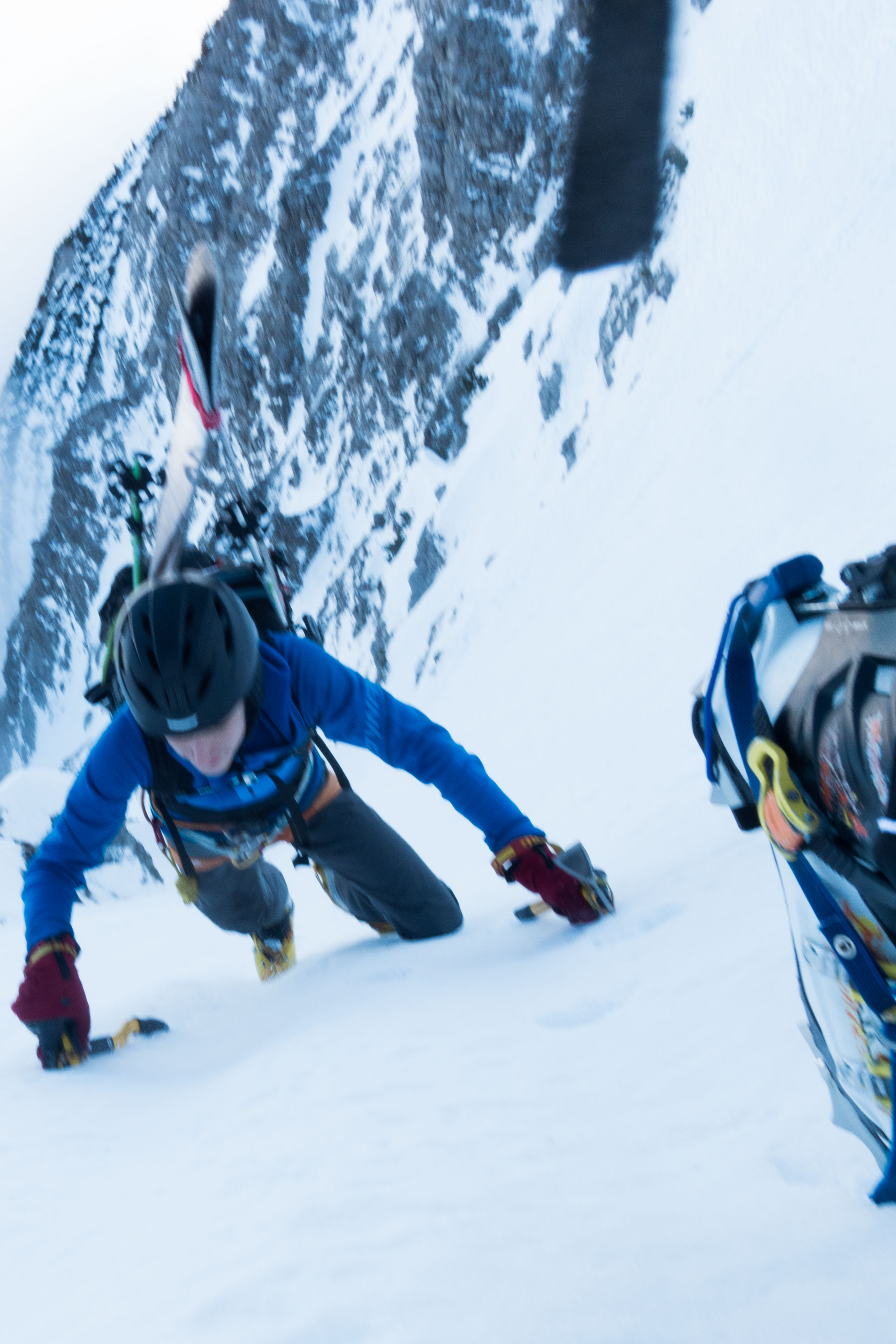 Wir sind ca. die Hälfte bis zur erten Engstelle mit Ski aufgestiegen, dann mit Pickel & Stock bzw in der Gipfelrinne auch mit Pickel und Eisgerät (ein Pickel ginge auch, je nach Sicherheitsbedürfnis ...). Für die Abfahrt haben wir die leicht aufgefirnte Südseite gewählt, die Abfahrt durch die Rinne macht bei weichem Schnee mehr Spaß und ist weniger absturzgefährdet.