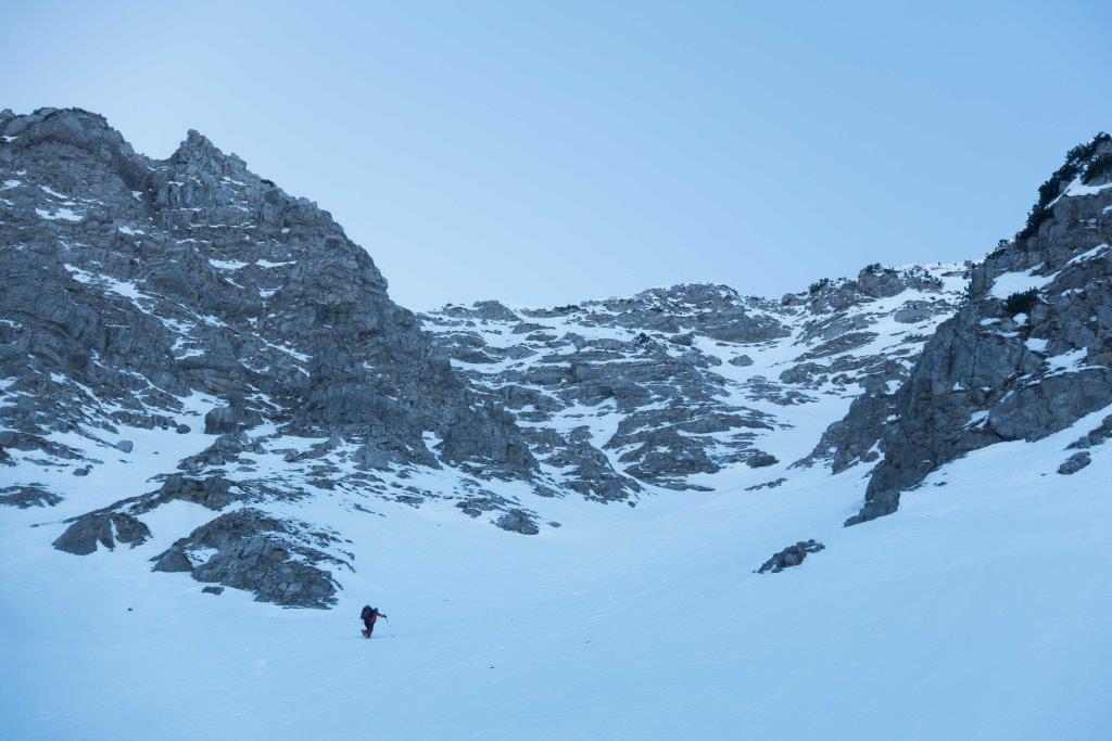 Tourenverhältnisse: Die Nordrinne ist durchgehend wie erwartet recht hart gefroren. Kaum Lawinenboller, der im Aufstiegssinne linke Rand (Osten) ist steinschlaggefährdet (auch derzeit). Daher besser rechts halten, dort hat man recht lange einigermaßen Schutz von allem, was von oben kommt.