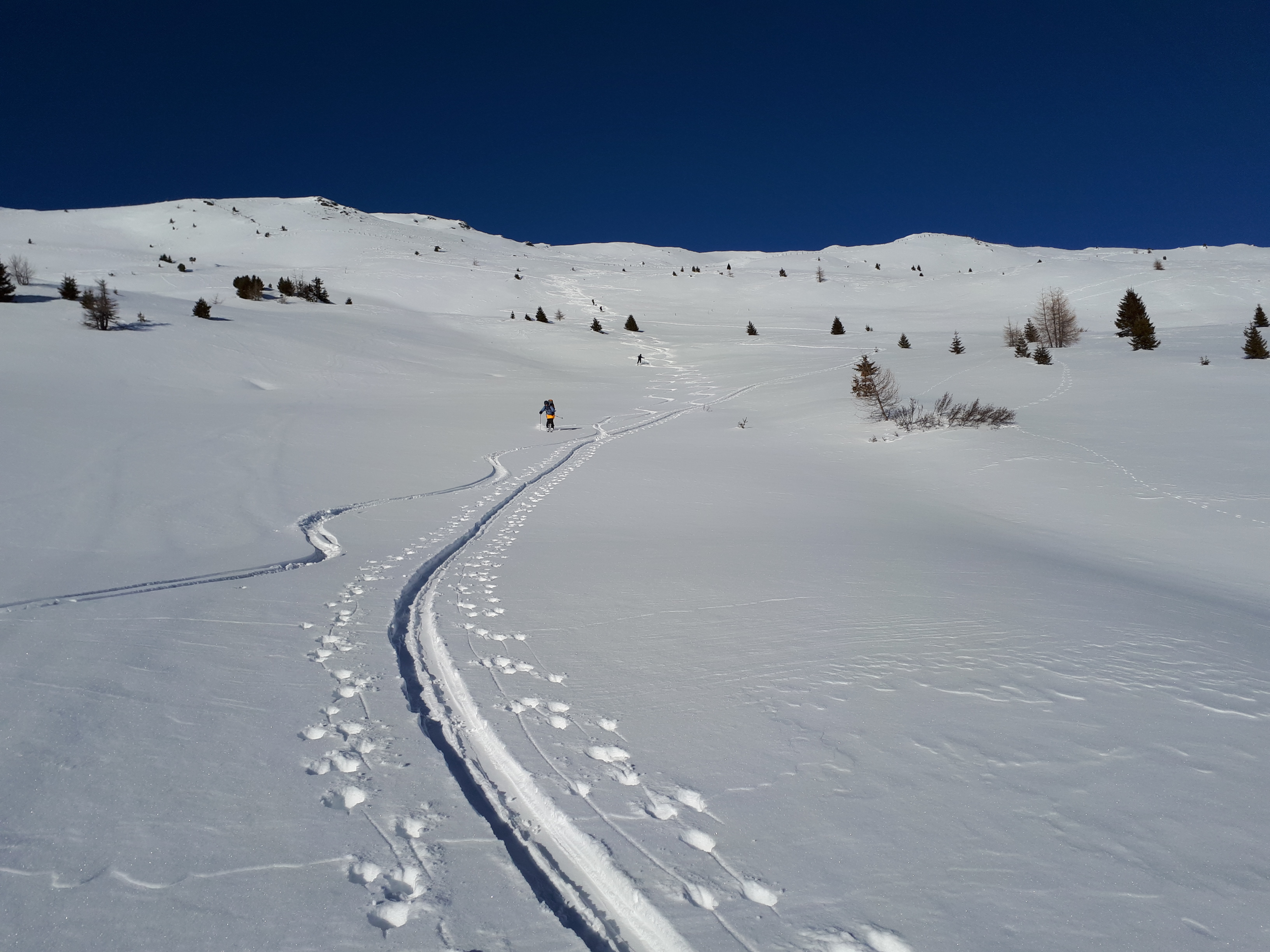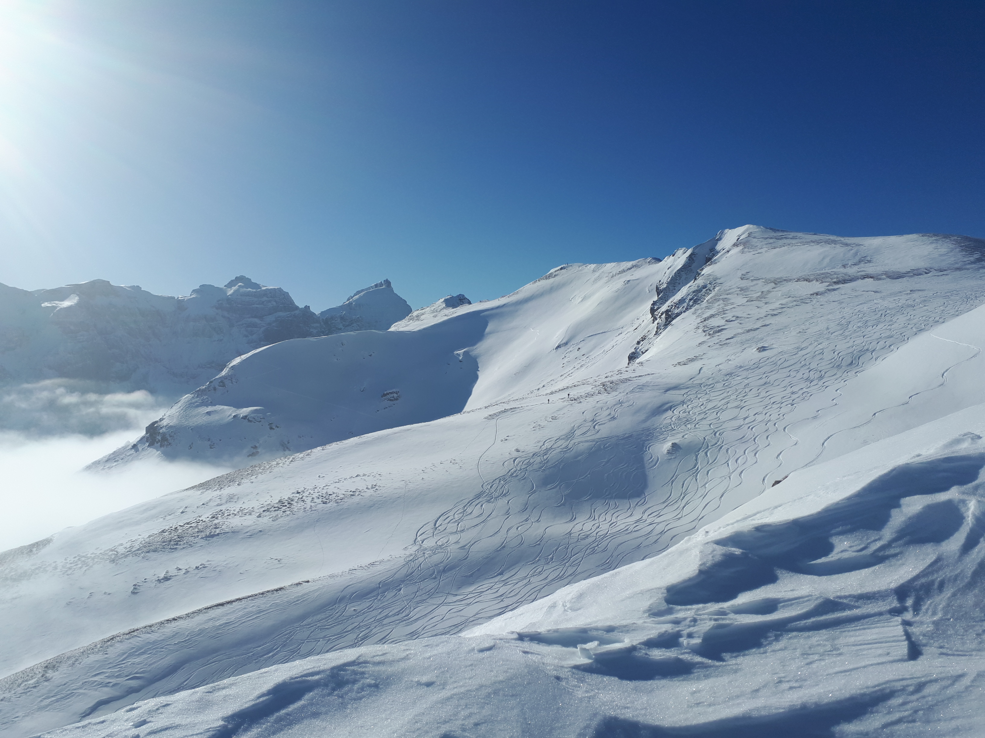 Tourenverhältnisse: Am Samstag auf den Leitner Berg. Die unteren steilen Südhänge waren schon recht aper, man konnte sich aber noch hochmogeln. Auch im Wald erstmal noch dünn, ab 1700m aber immer besser. Überraschenderweise war der Berg völlig unverspurt und es gab eine 10cm Pulverschneeauflage. Reine Südseite war harschig, aber in kleinen Mulden und im lichten Lärchenwald war schöner Pulver. Am Gipfel stark verblasen, aber bereits wenige Meter unter dem Gipfel bereits gut fahrbarer Schnee. Topwetter! Nur noch 3 weitere Tourengeher gesehen.