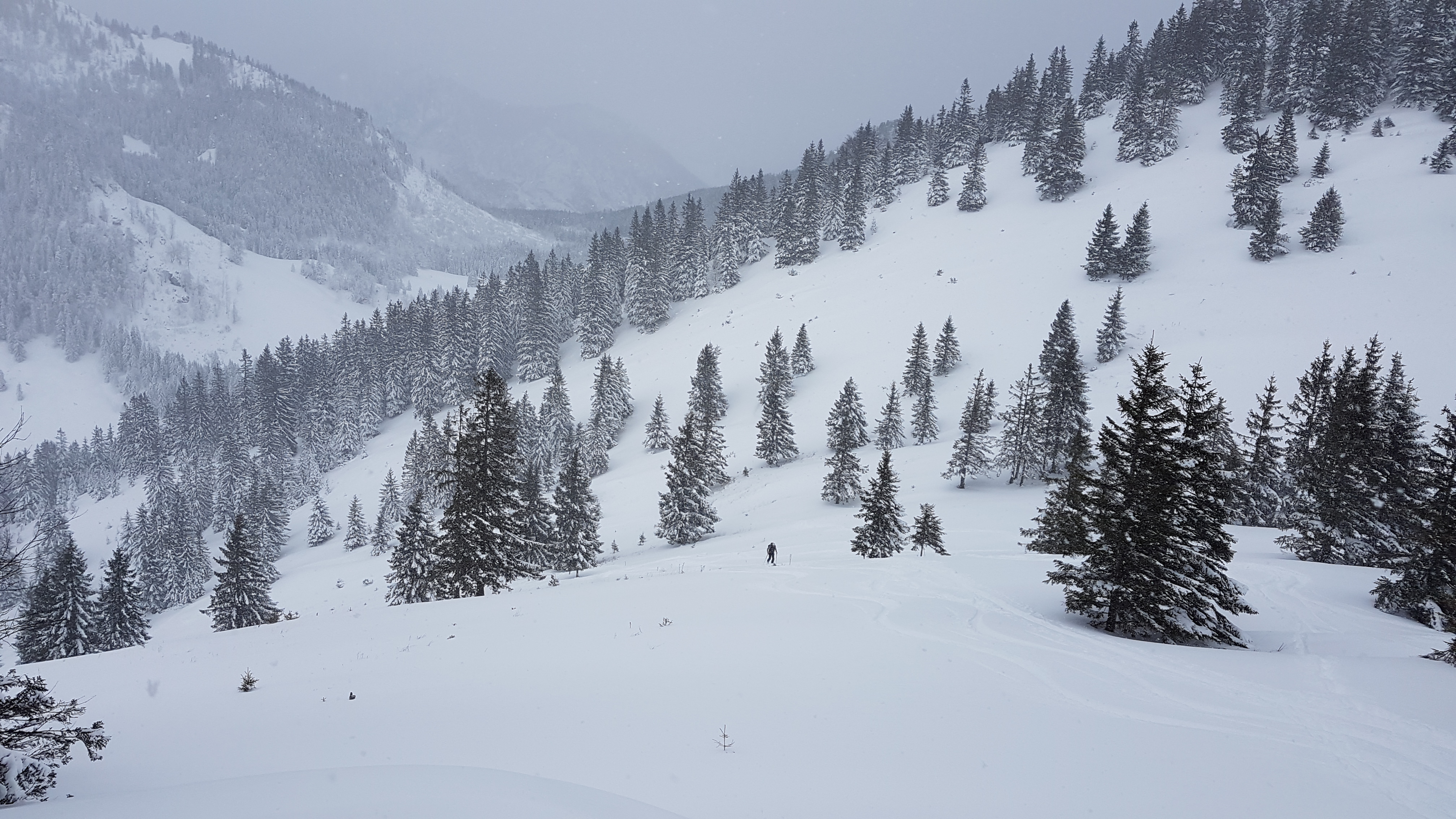 Tourenverhältnisse: Unten sind ca. 40 cm, oben gut einen halben Meter Neuschnee auf aperen Boden gefallen. Im unteren Bereich ist eine Grundberührung nicht ganz ausgeeschlossen, aber auf den Wiesen kein Problem - es war recht fein zum Fahren.