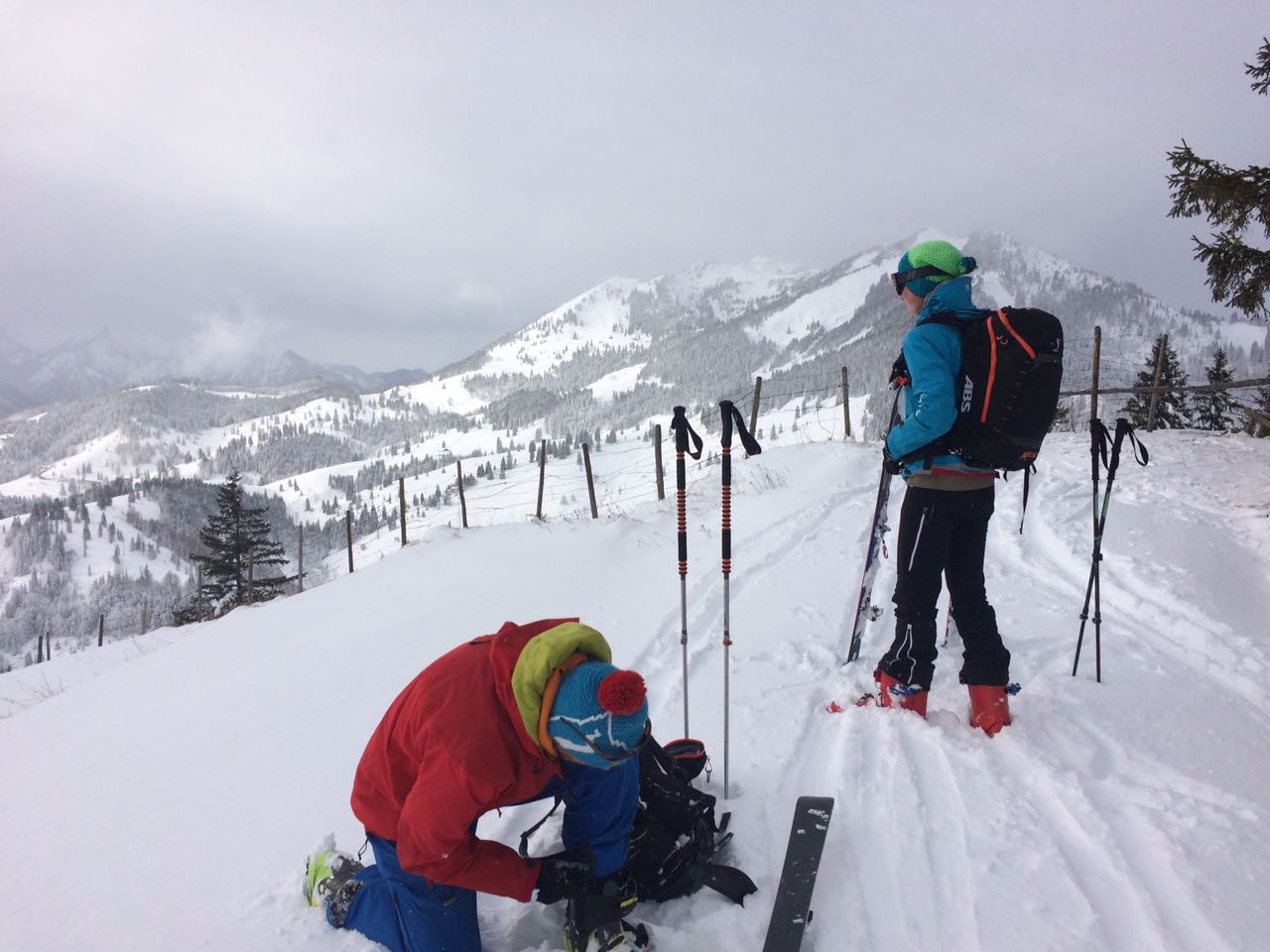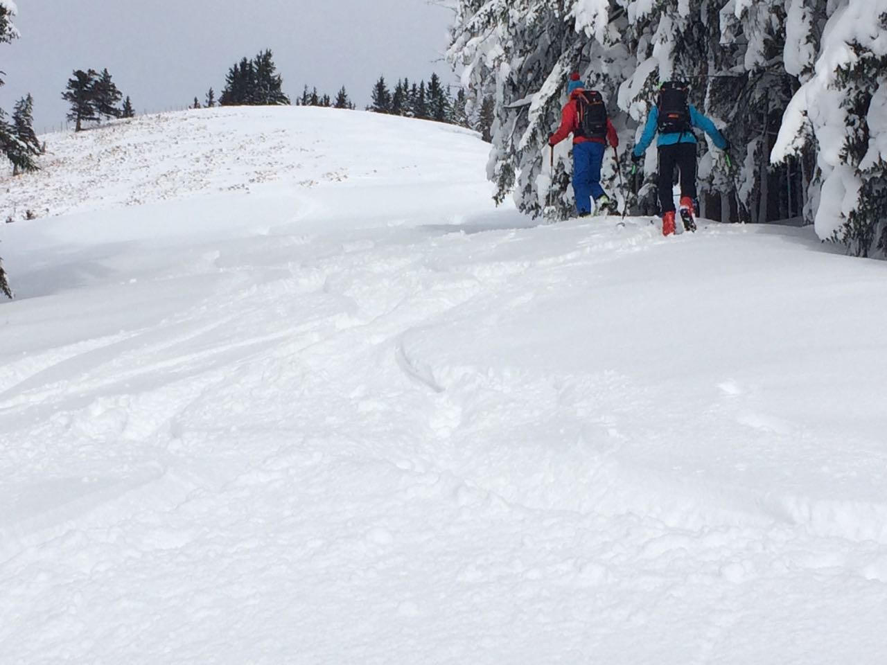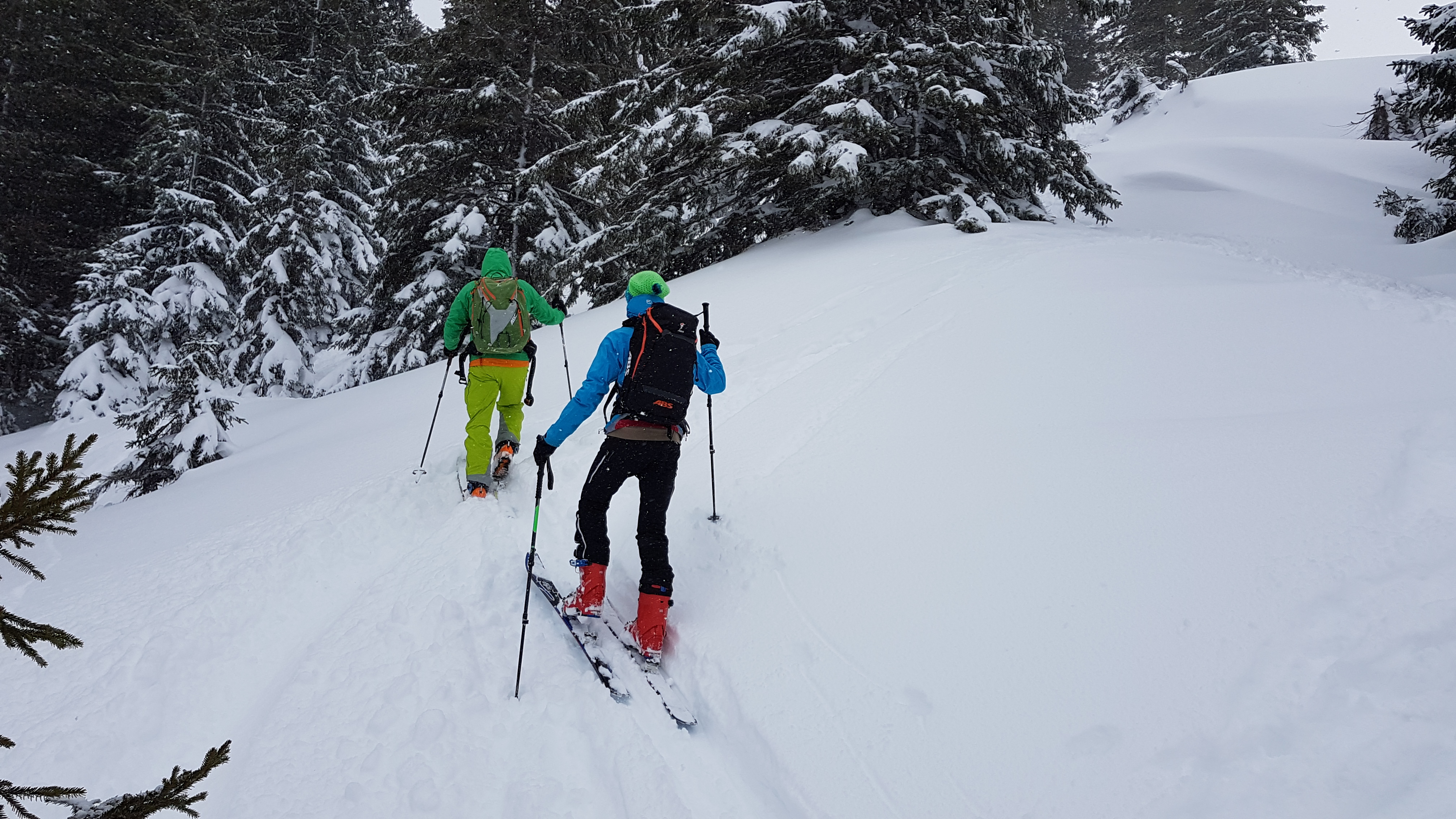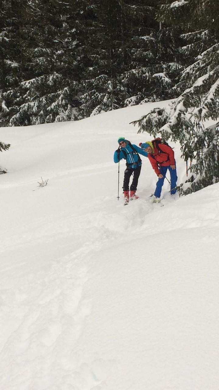 Aufgrund des Sturms ist der Schnee sehr ungleich verteilt - so ist z.B. die Route über den Rücken komplett abgeblasen und lohnt weder im Aufstieg noch in der Abfahrt - sind aber trotzdem welche rauf. Gut dagegen die relativ windgeschützte westseitige Mulde dahinter. wir sind zusätzlich nach süden abgefahren, was auch sehr fein war.