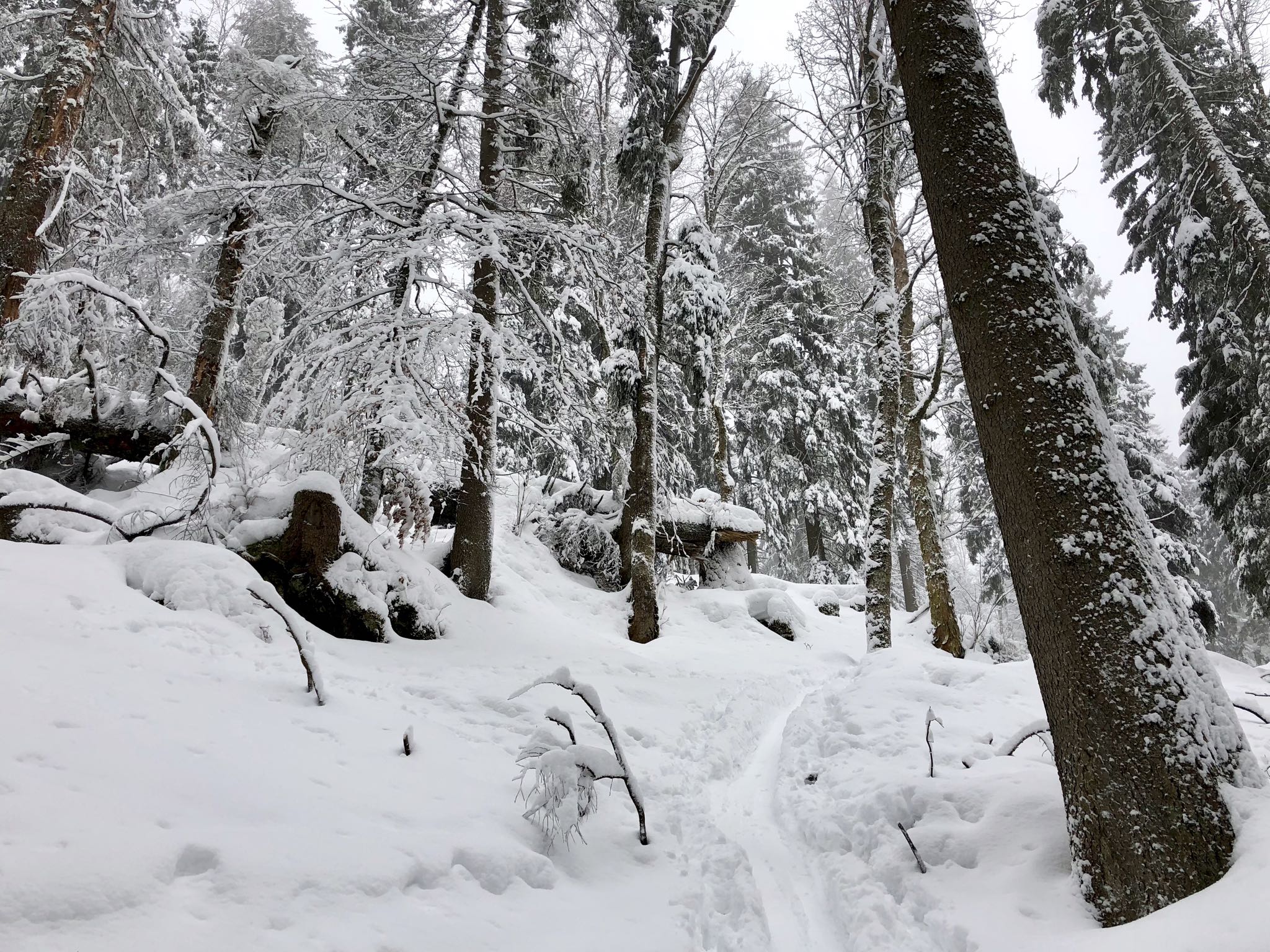 Sonstiges: Vom PP Hausbergbahn (730m) Richtung Horn-Abfahrt. Kurz vorher rechts weg und über die Lichtung unter der Hausbergbahn bis zur Schnitzschulhütte (890m). Dort links raus zur Skiroute und auf dieser zur Tonihütte (1096m). Weiter auf der Skiroute; auf 1140m statt der Standard-Tonihütten-Abfahrt den Steig nach rechts Richtung Olympiaabfahrt. Auf 1240m scharf links Richtung SO (Umleitung Fußweg Richtung Kreuzeck) in den Wald, ab 1320m Richtung S bis man letztlich kurz vor der Trögelhütte (1429m) wieder die Skiroute erreicht. Die Olympia und die Kandahar gequert und auf dem Winterweg zum Kreuzeckhaus (1652m).