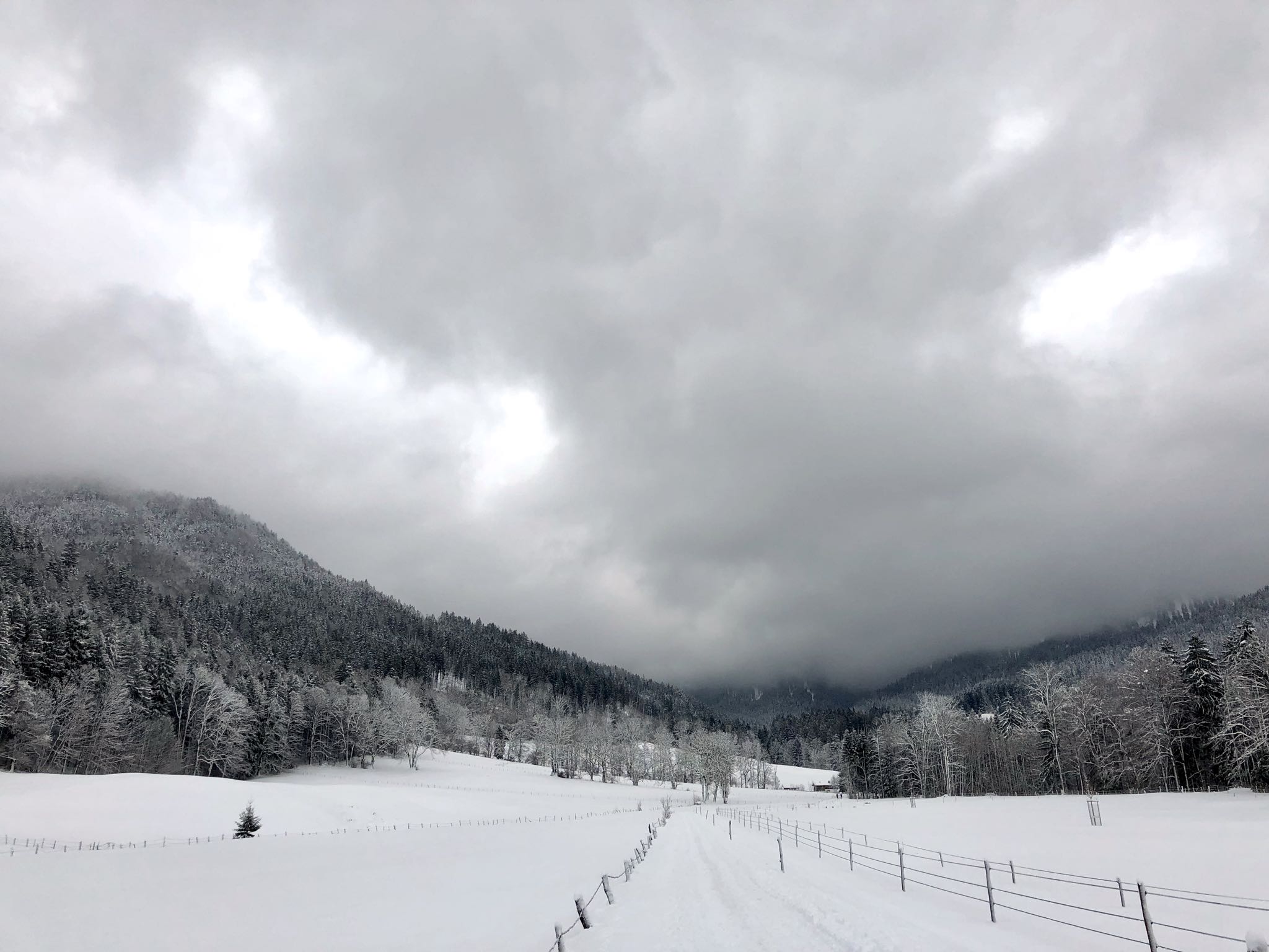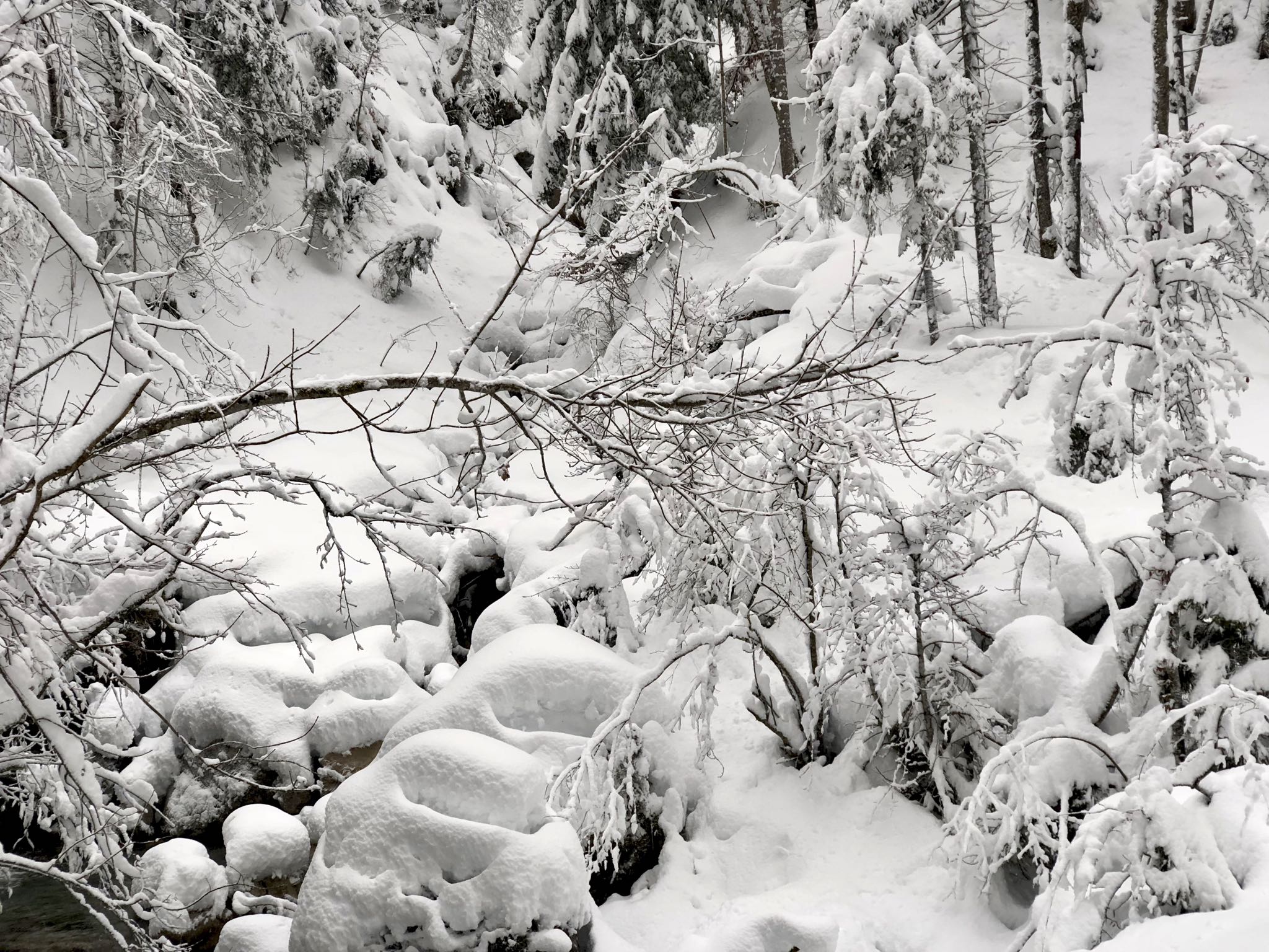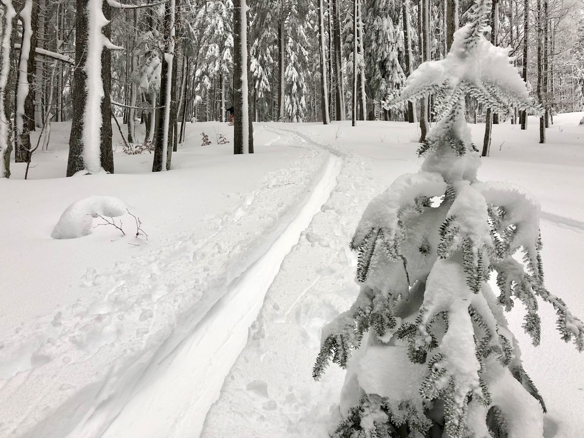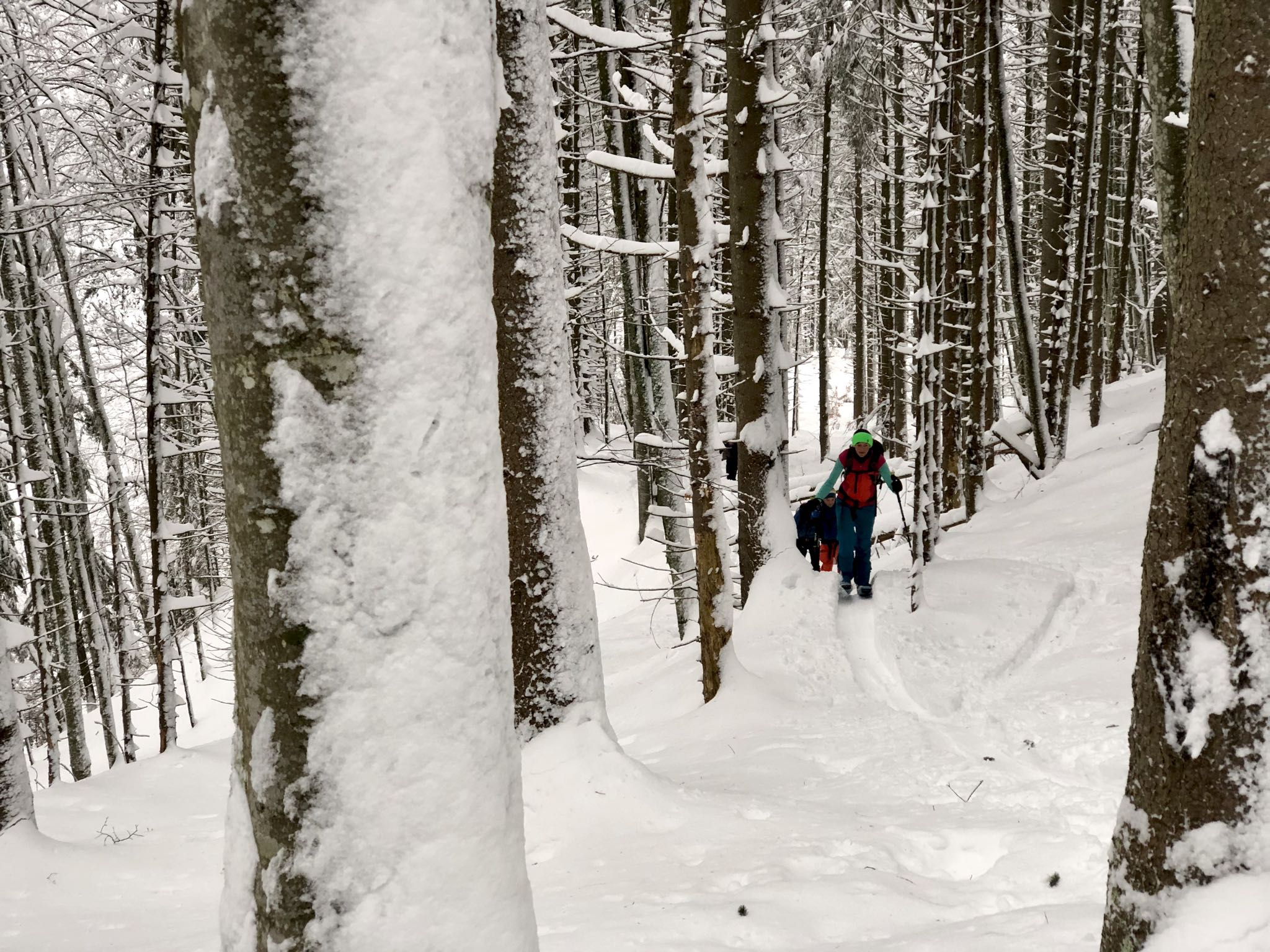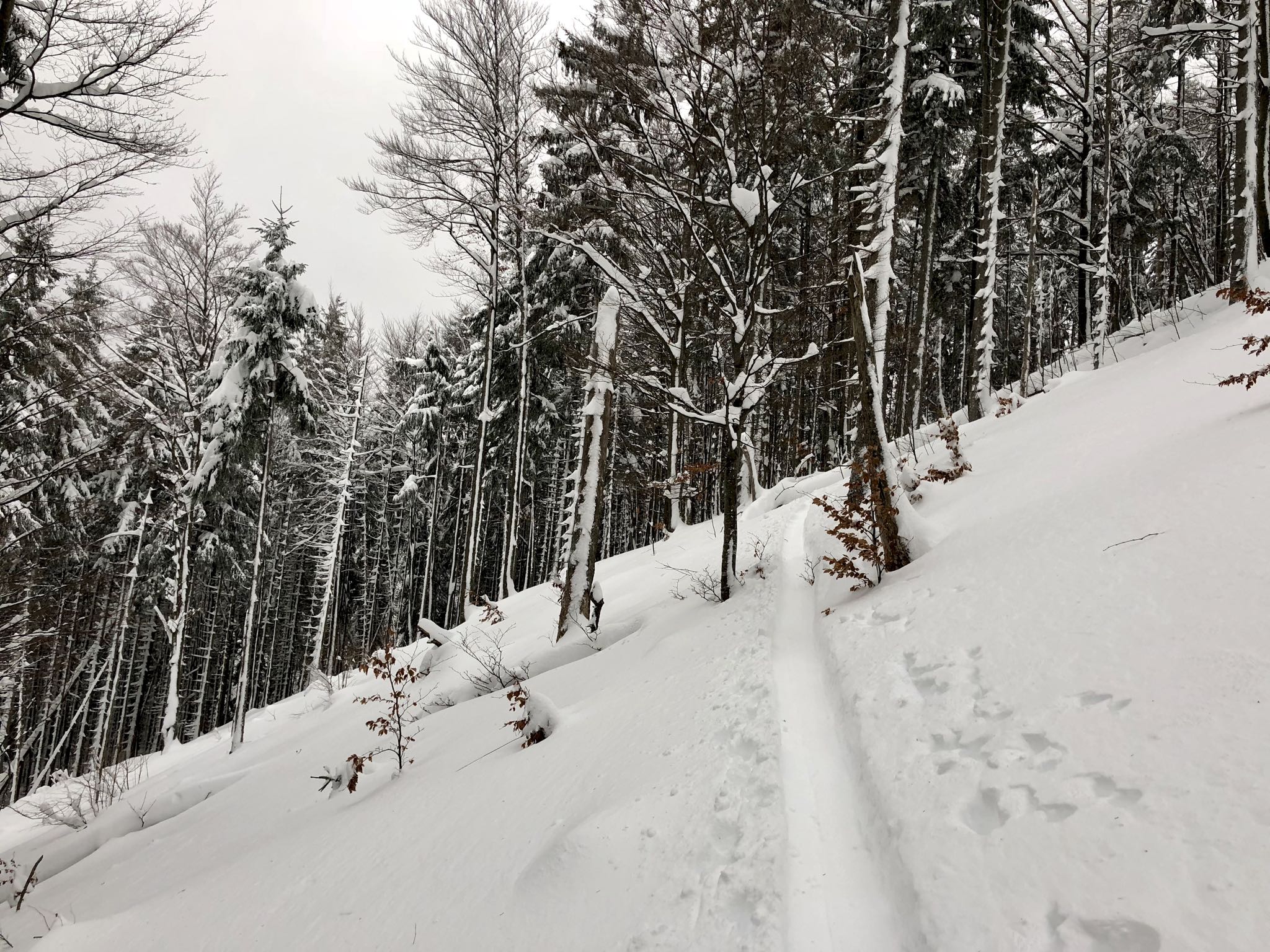 Runter gleich Richtung N nach links in den lichten Wald hinein und rechts haltend einzeln in den 300Hm Hang mit fettem Pow von oben bis unten . Am Forstweg etwas nach NO gequert und dann immer nach WNW in zunehmend schwererem Schnee durch den Wald in mal weiteren, mal engeren Bögen durch die Bäume bis man unten den Forstweg trifft, der zum PP zurück führt.