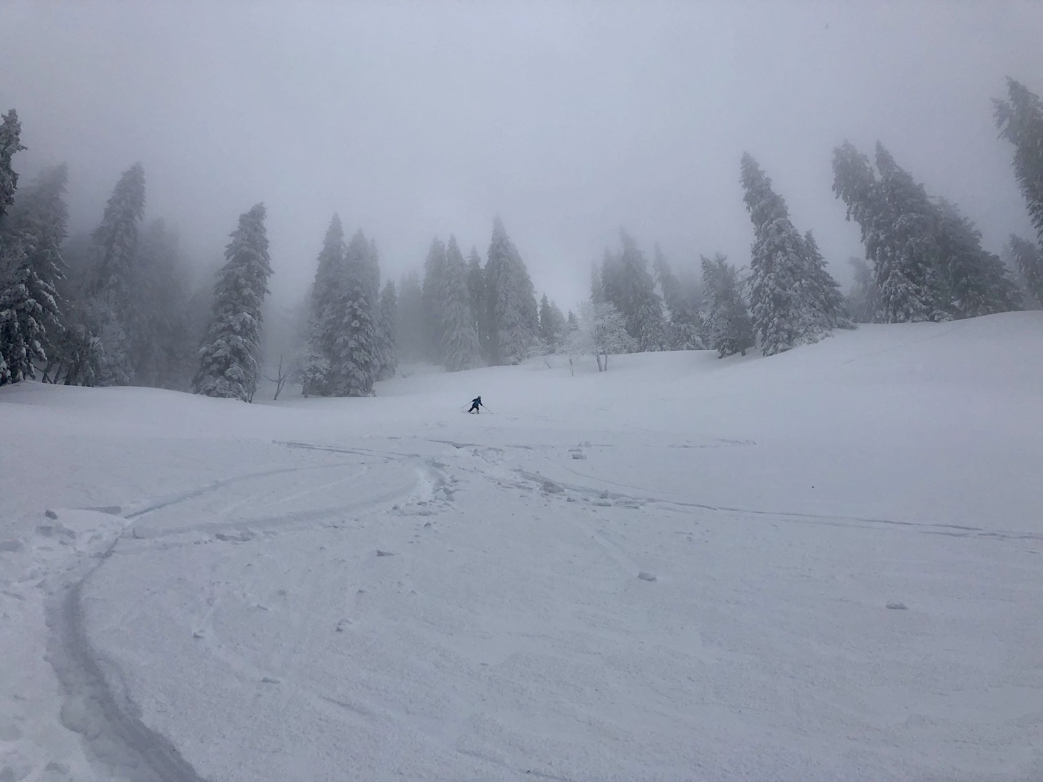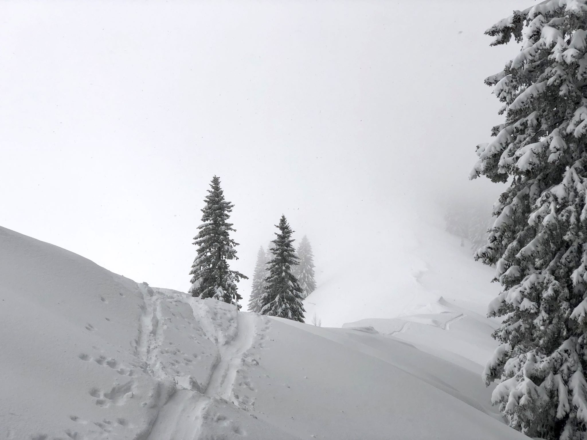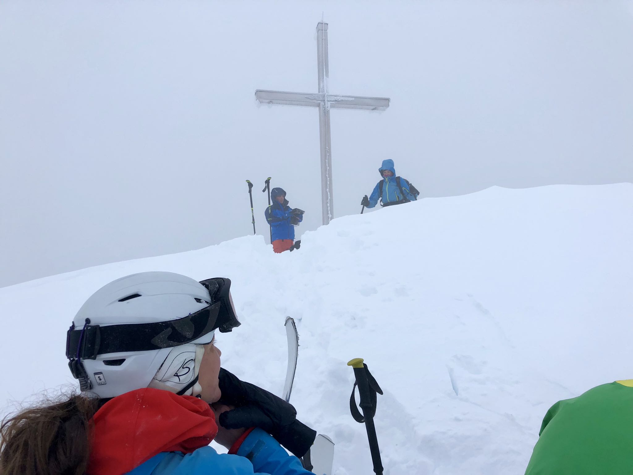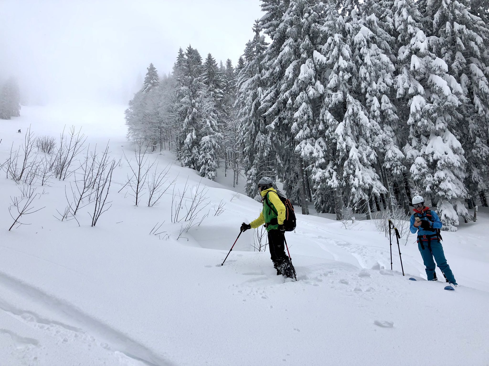 Tourenverhältnisse: Unten weg ausreichend Schnee, wenn auch nicht wahnsinnig viel im Wald. Gipfelgrat etwas verblasen, aber soweit im Nebel erkennbar noch nicht die Mega-Wechten. Die große Lichtung Richtung N haben wir einzeln befahren, dort gab es schönen Pulver. Weiter talwärts wurde der Schnee dann zusehends schwerer, insgesamt aber gut zu fahren.
