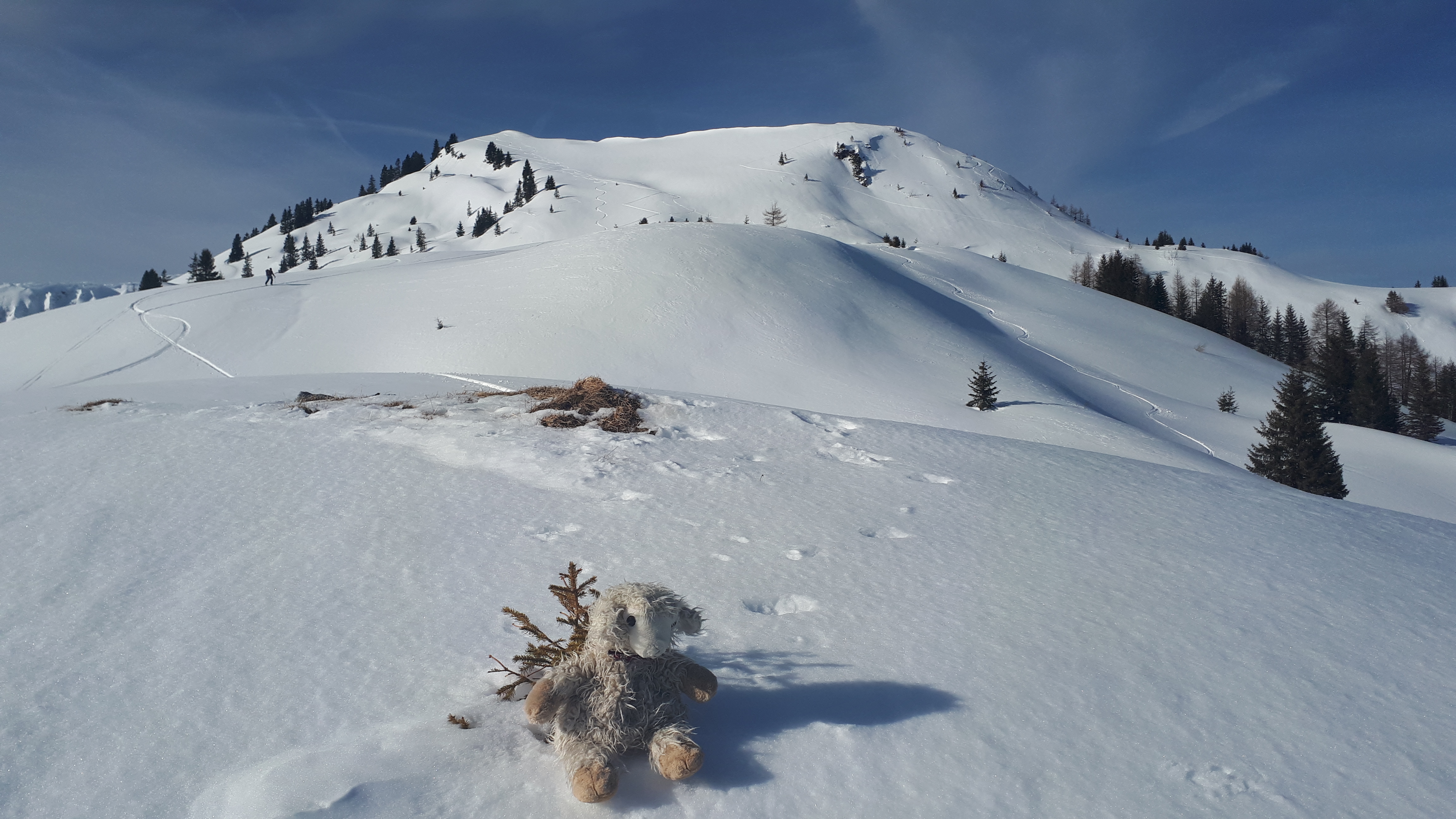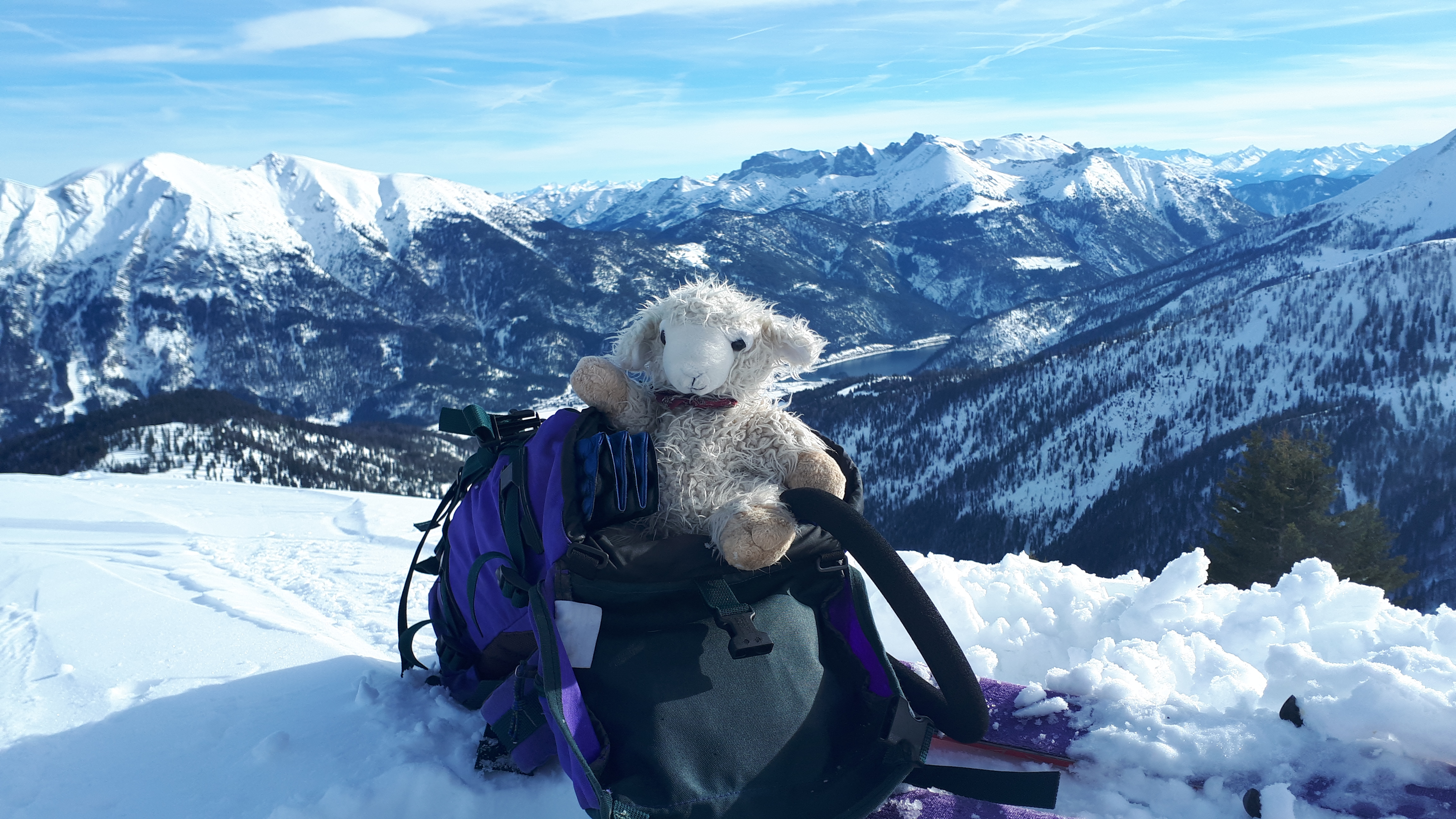 Tourenverhältnisse: Aufstieg über die "Südroute" von Achenkirch über Bründlalm-Jochalm-Seewaldhütte. Vormittags sehr schönes Wetter und tolle Sicht. Der Schnee war unten hart gefroren, bald dann Bruchharsch (nicht tragend) und ab 1500m gab es schattseitig feuchten Pulver mit Deckel. Die Route ist landschaftlich deutlich attraktiver als die über die Falkenmoosalm, und da der Schnee sowieso nix war, sollte wenigstens der Aufstieg schön sein. Am Gipfel war es windstill und nicht zu warm. Die Abfahrt war oben noch ganz okay, dann wurde der Schnee immer nasser und tiefer. Die Forststraße war sehr unangenehm zu fahren, da halb gefroren-halb Batz.