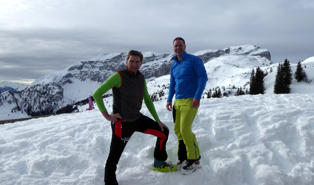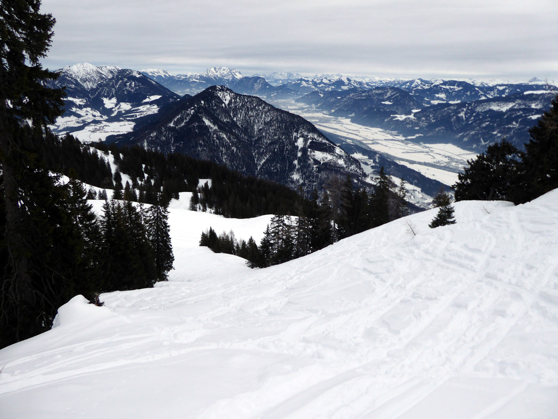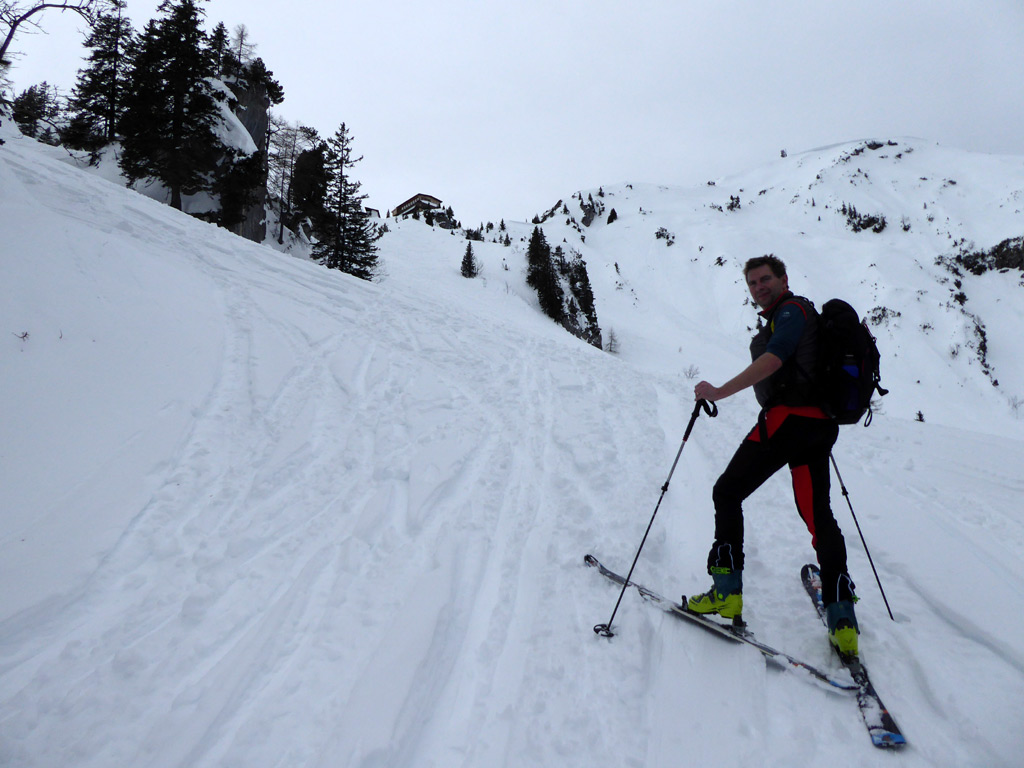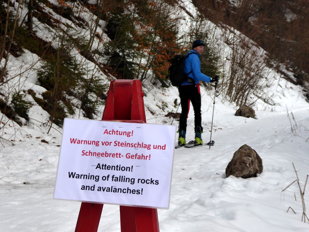 Gefahreneinschätzung: lawinenmäßig gering (heute LWS I bis II); eher das Risiko, dass man sich im schweren Tiefschnee den Ski verdreht.