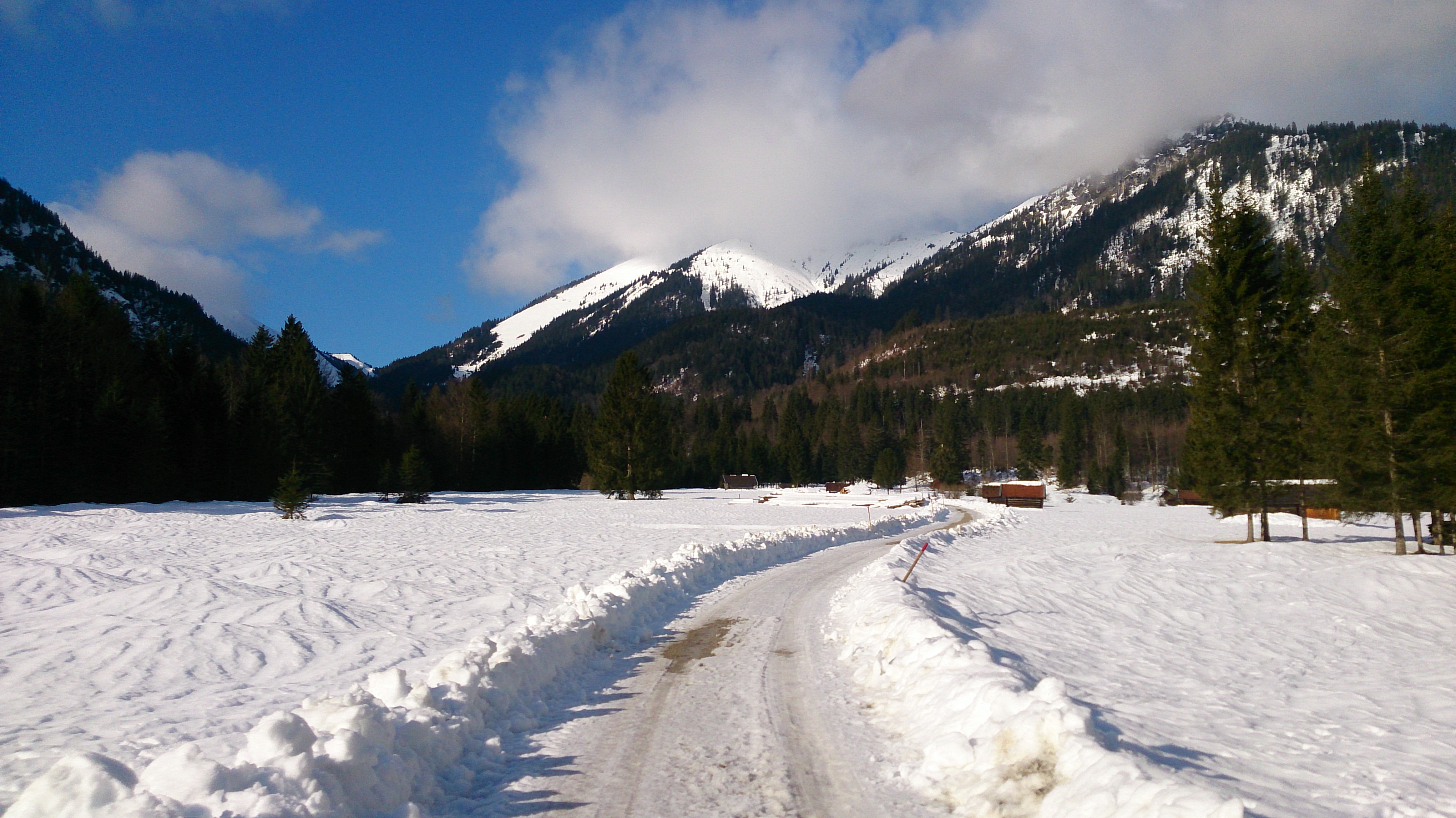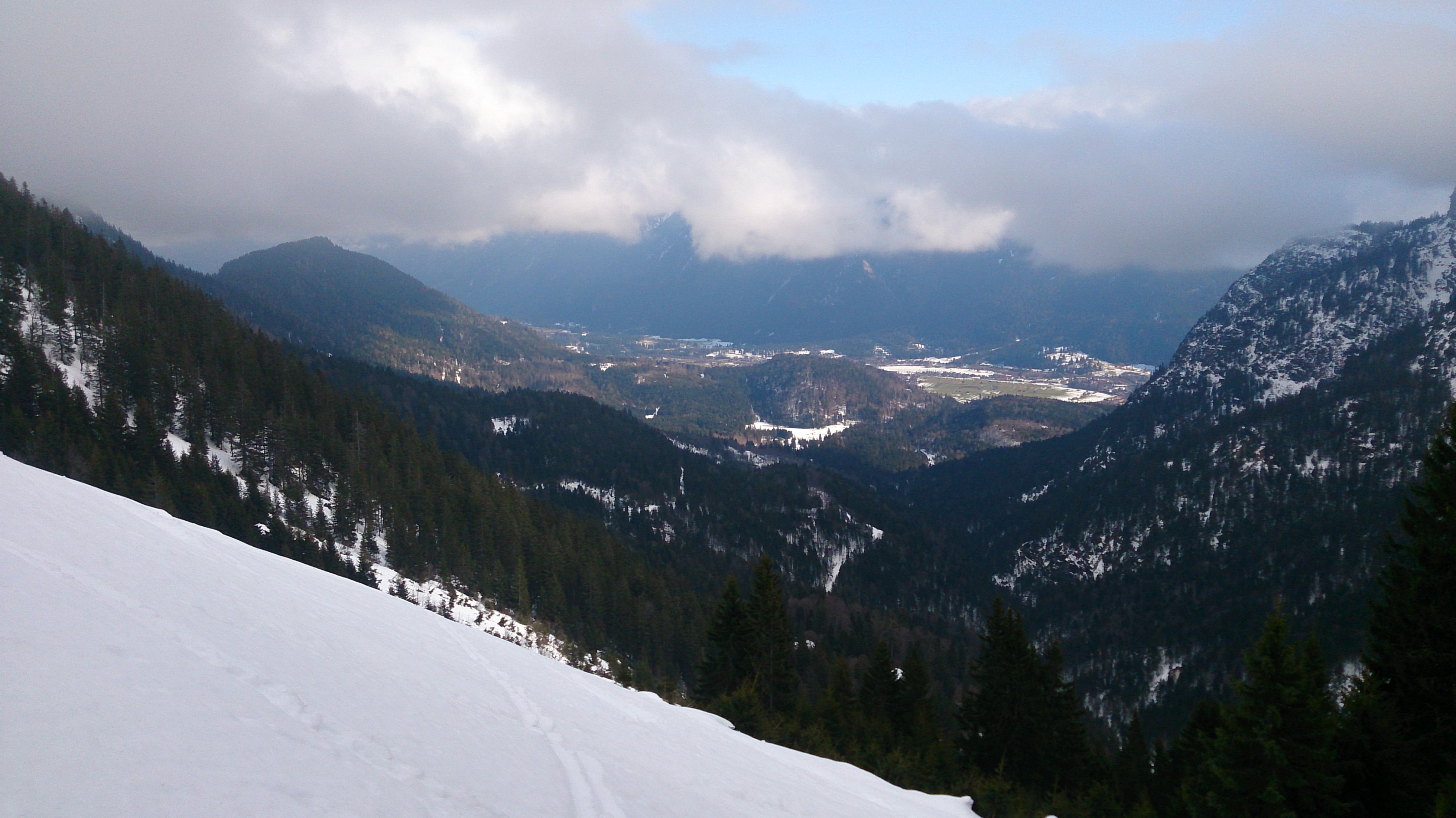 Sonstiges: Heute wollte ich eigentlich die angekündigte Wetterbesserung ab dem Vormittag nutzen, in der Realität war es aber am Morgen sonnig, dann zunehmend bewölkt / neblig. Die Skier habe ich bis zum "Garmischer Stich" (ca. 900 m) getragen, es hätte aber schon ab den Reschbergwiesen ausreichend Schnee / Eis für einen Skiaufstieg gegeben. Von den allerorts angesprochenen Rekordschneemengen ist allerdings auf dieser Höhe noch gar nichts zu sehen. Die Forststraße Richtung Enning-Alm ist (von den örtlichen Jägern?) gründlichst geräumt worden und weist einen dicken Eispanzer auf, teilweise auch apere Stellen. Auf knapp 1.200 m ist aber zum Glück dann wieder unberührte Natur.