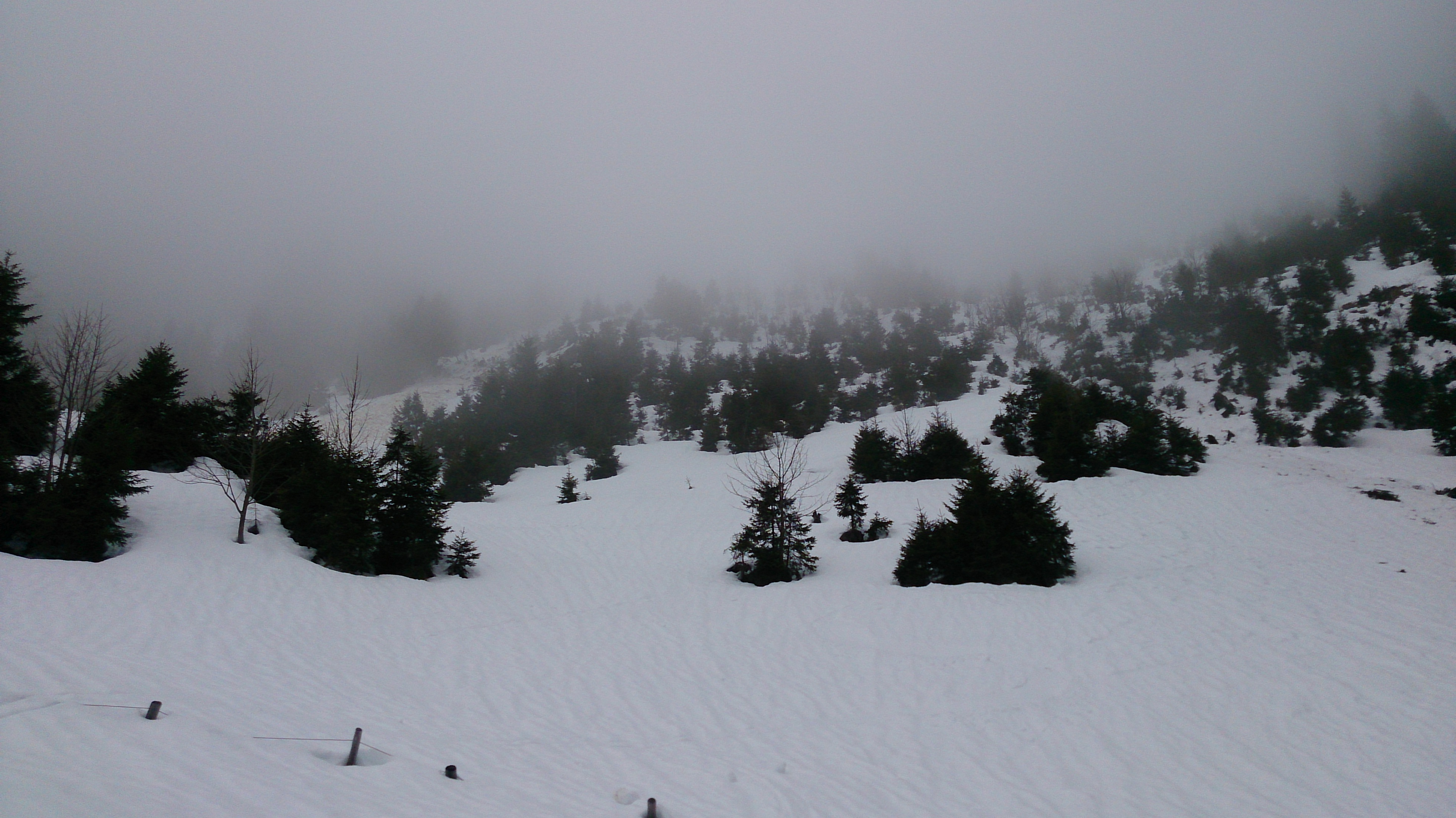 Da es ab Mittag am Berg leider zunehmend eingenebelt hat, war bei der Abfahrt kaum mehr was zu sehen. Da war ich um jede alte Spur dankbar. Schnee schon recht tief, hatte über Nacht wohl nicht gut durchgefroren wegen Bedeckung. In der Mitte des Hangs ist eine alte, große Lawine abgegangen und hat den Hang sauber durchgepflügt; der Durchschlupf ist auch unfahrbar abgeräumt worden, daher etwas mühsam an der Seite im Wäldchen durchgemogelt. Bei der weiteren Abfahrt bin ich dann durchgehend auf der Forststraße geblieben, deren Eisbedeckung mich letztlich noch bis fast 800 m hinab mit Skiern abrutschen ließ (aber kein echtes Fahren möglich, da man wegen des Eises und aperer Stellen vorsichtig fahren sollte). Dann noch in 20 min ins Tal und zurück zum Bahnhof.