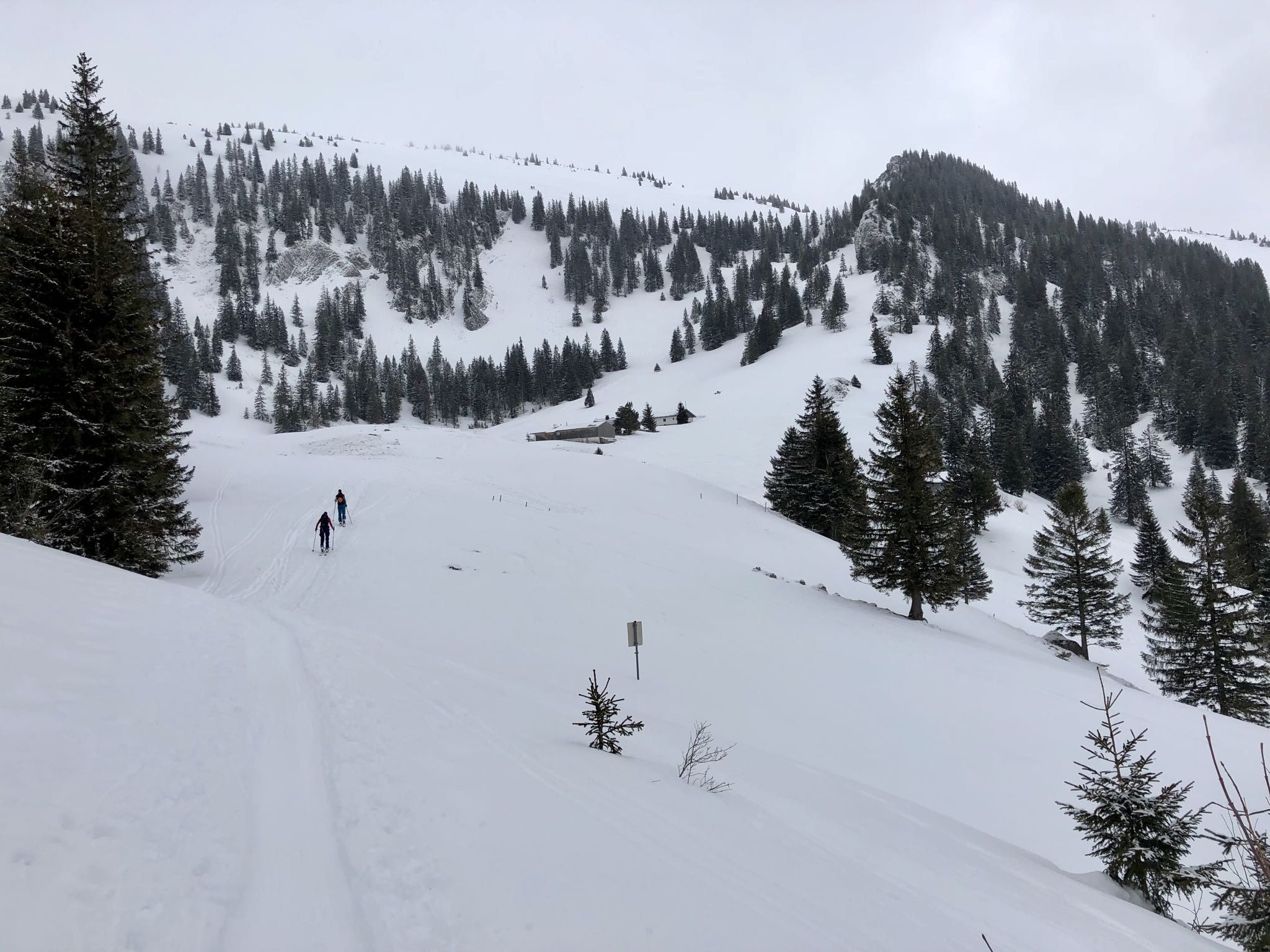 Tourenverhältnisse: bis ca. 10cm Neuschnee auf meist sehr harter Unterlage. Zur Krottentaler Alm hinunter etwas mehr Schnee, recht schön zu fahren. Lochgraben noch recht gut, der Starthang eisige Buckelpiste.