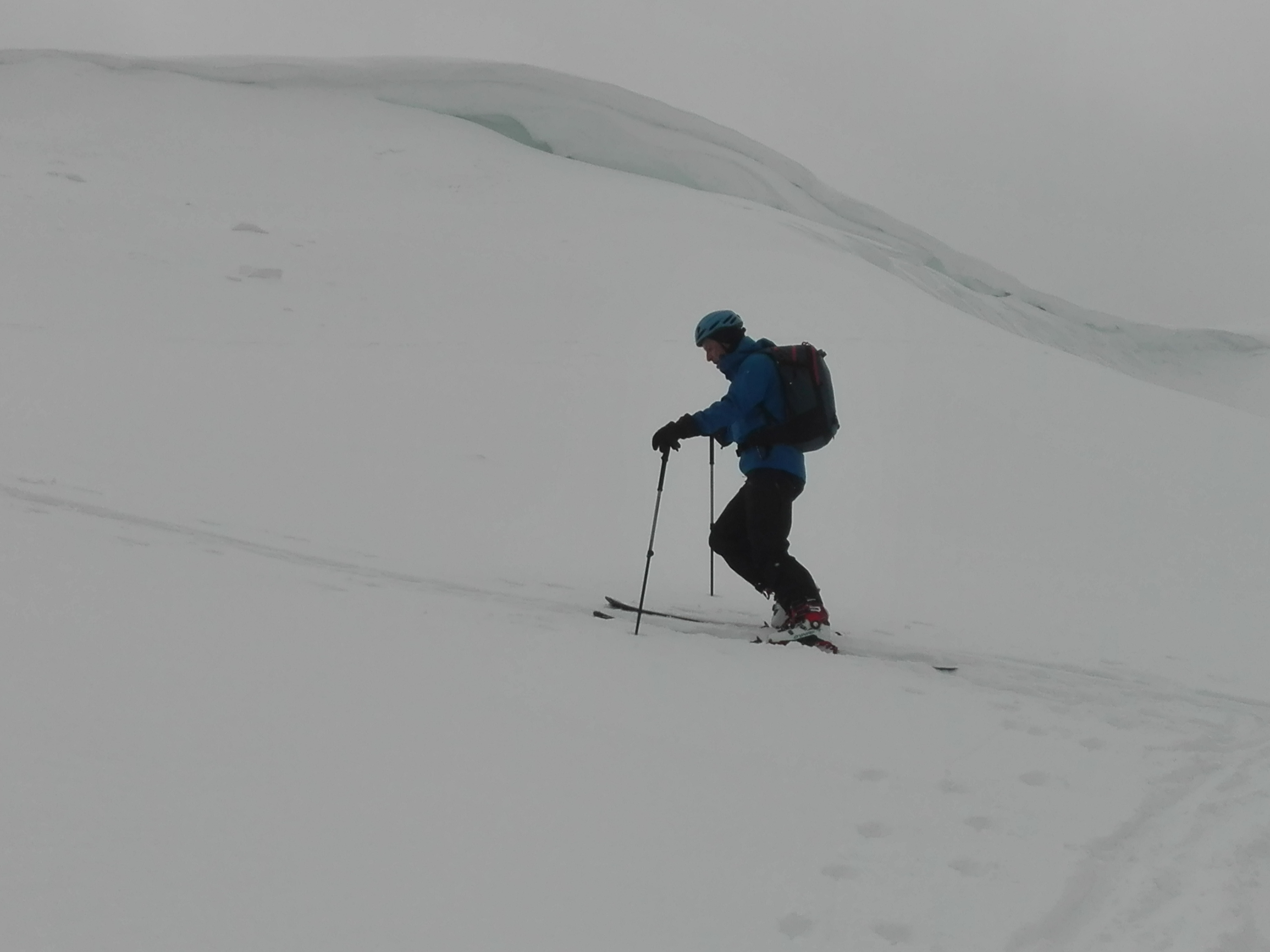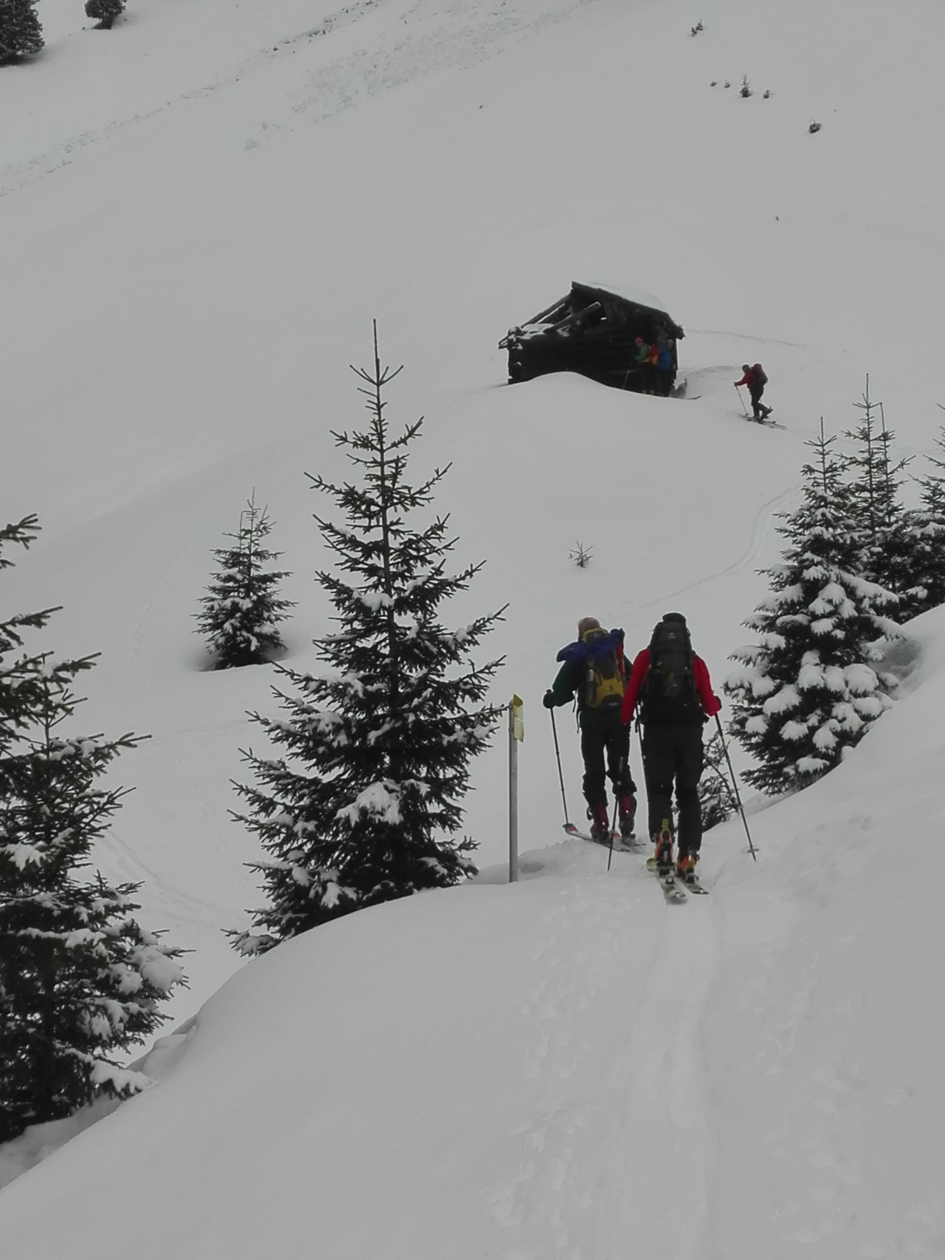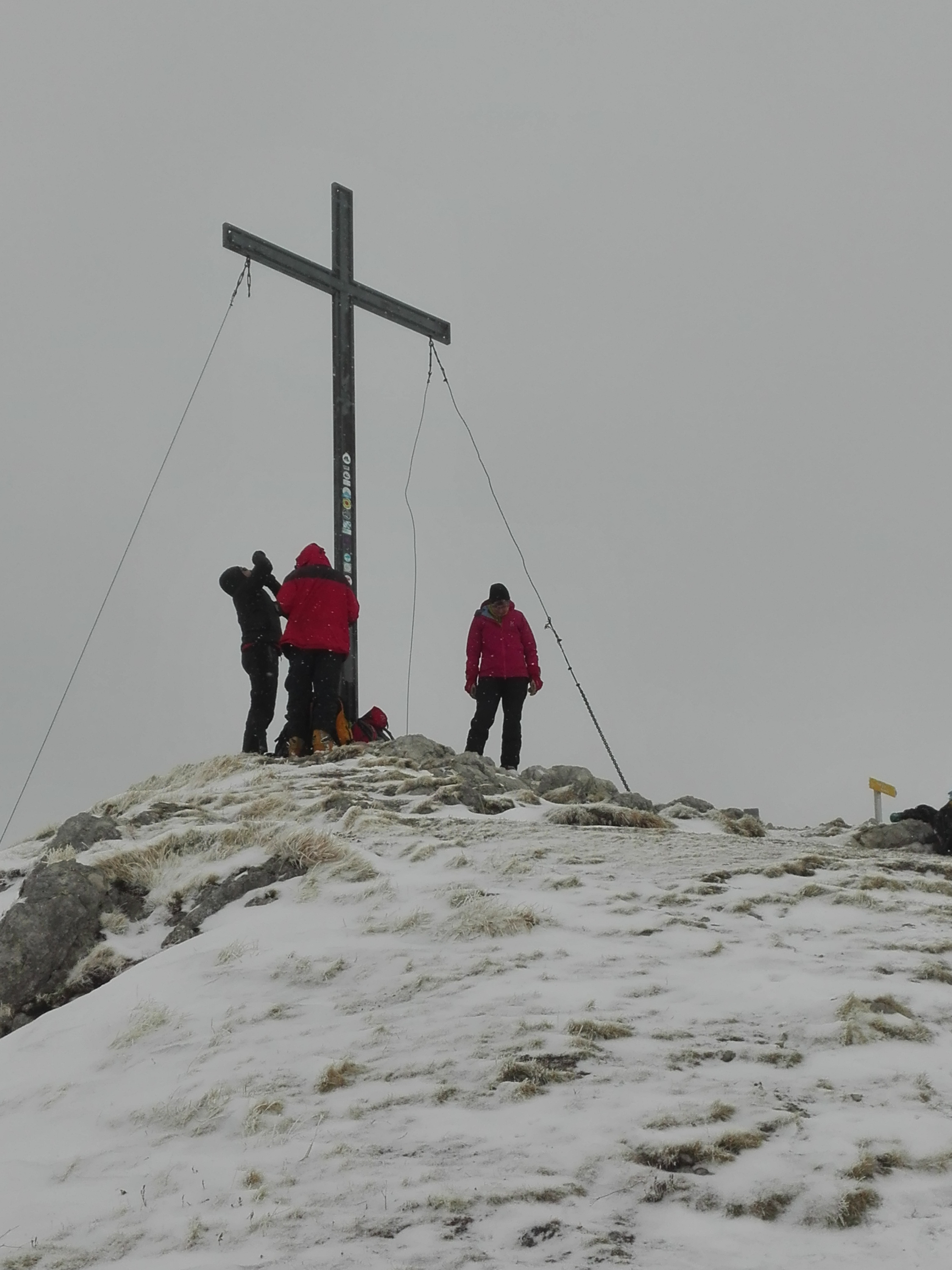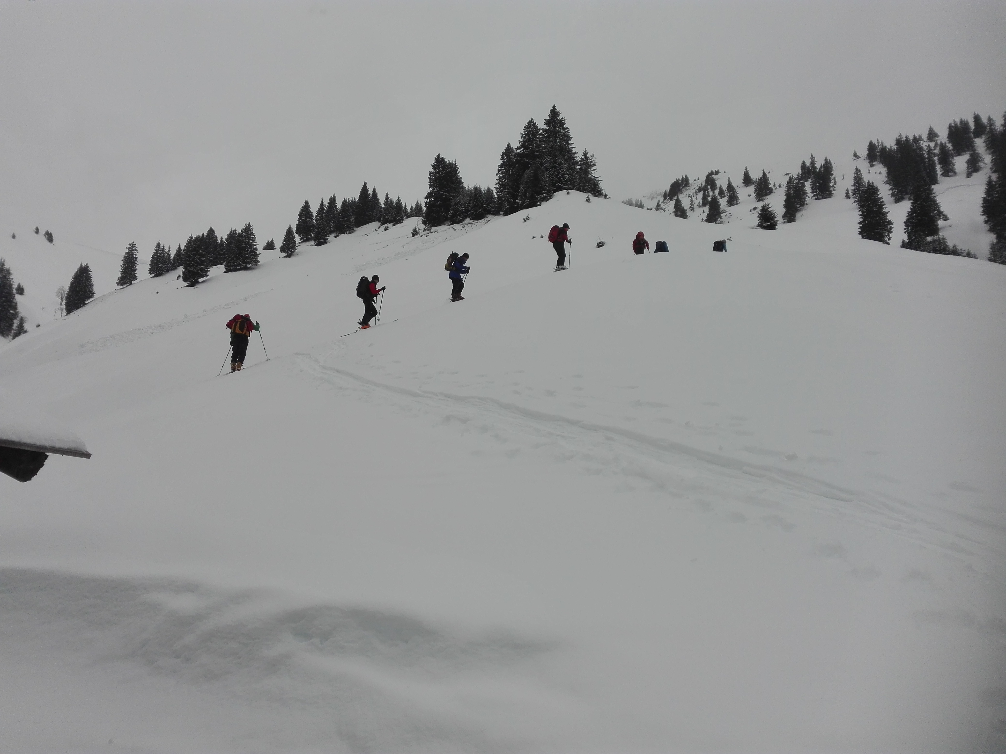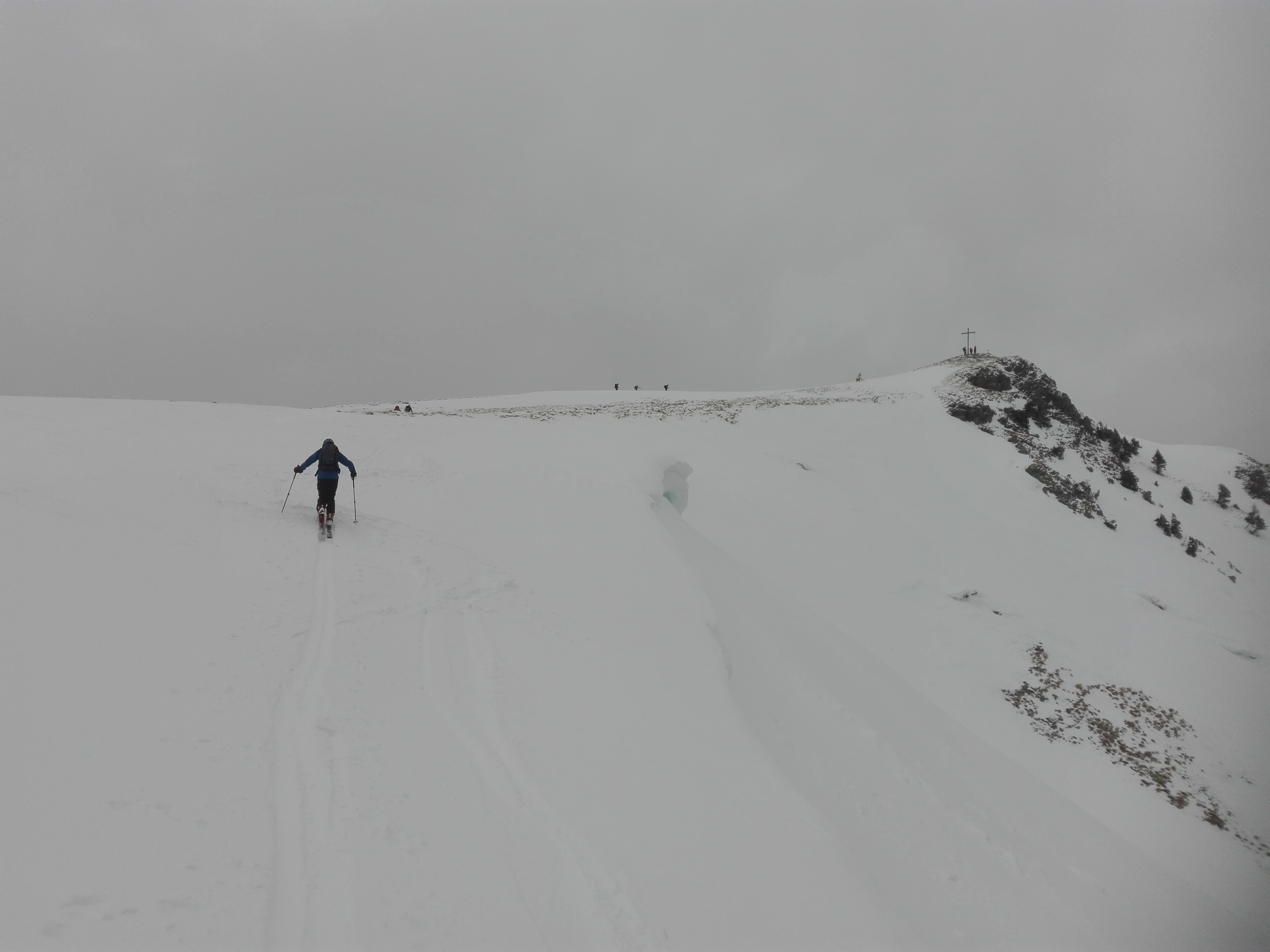 Wetter: während der ganzen Tour lag die Wolkenuntergrenze knapp über dem Gipfel, ein oder zwei Schneeschauer, am frühen Nachmittag auch zwei, drei Sonnenstrahlen. Unter null Grad.