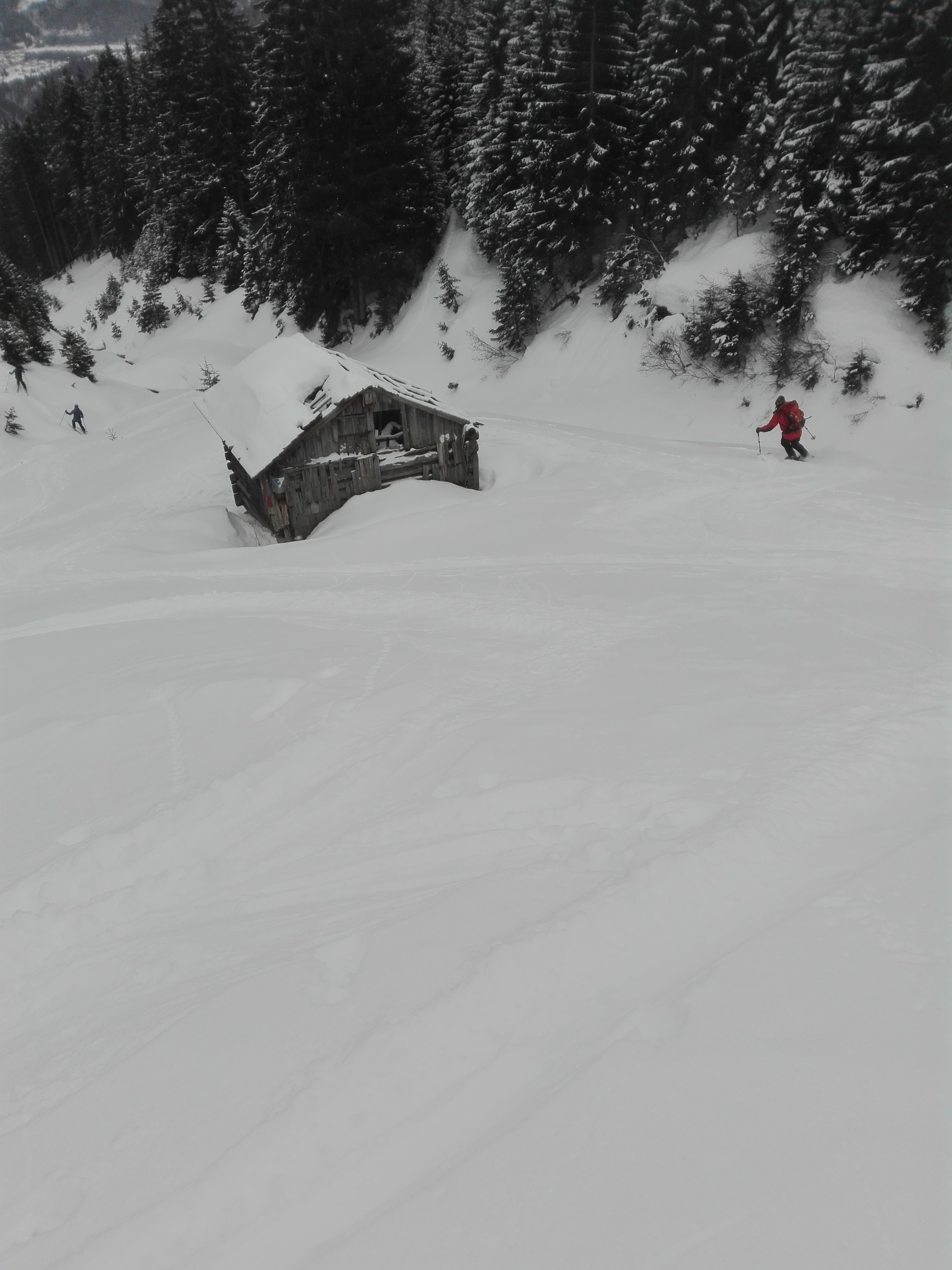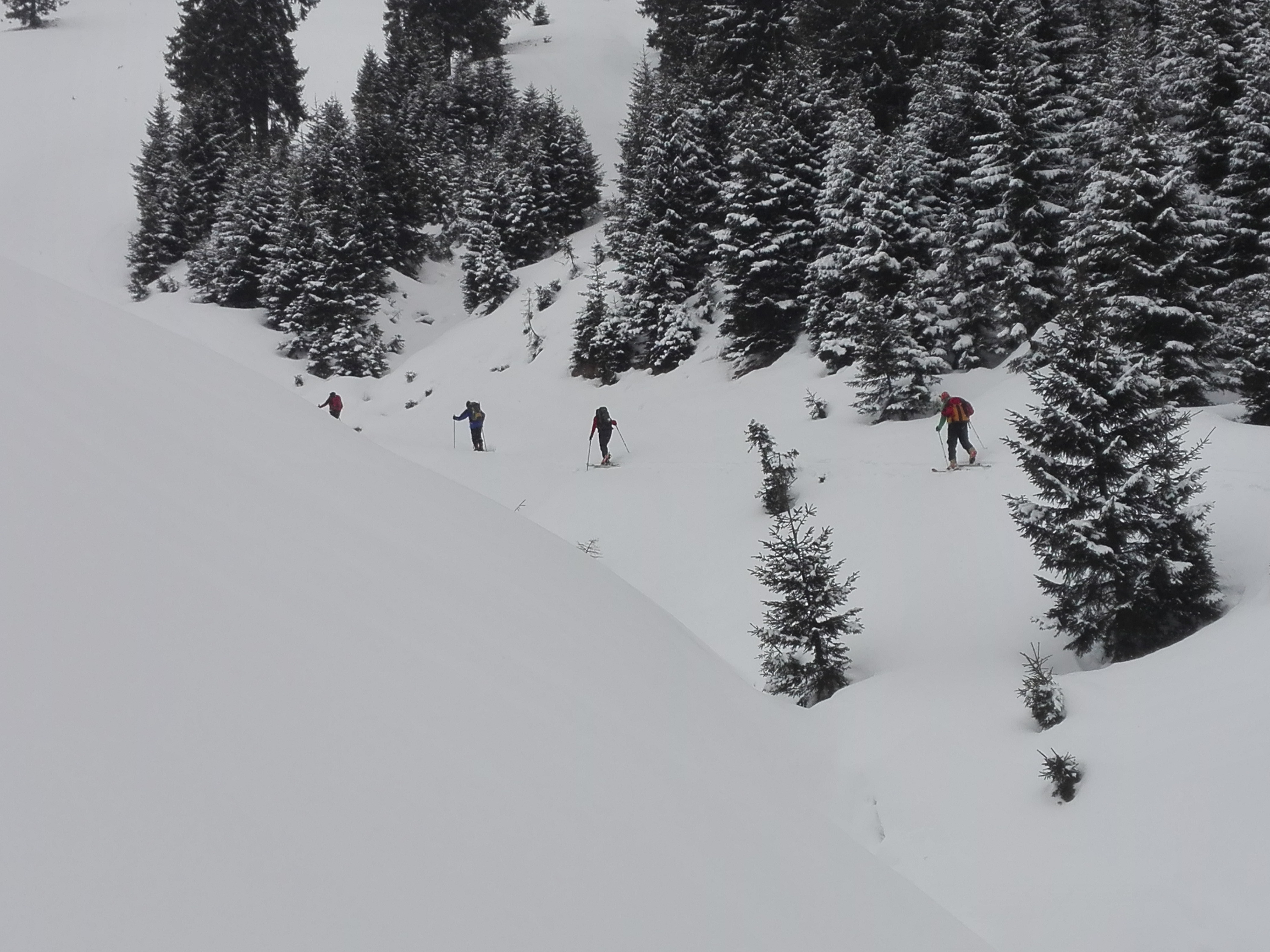 Tourenverhältnisse: Wir sind die Tour so, wie sie in der AV-Karte Tannheimer Berge (BY 5) eingezeichnet ist, gegangen. Der Steig, der durch den Wald führt, erwies sich im Aufstieg als überwiegend ziemlich hart zu gehen, mit einige Male Abrutschen. Harscheisen sehr empfehlenswert. Im unteren Teil des Waldes liegt auch zu wenig Schnee, um hier abzufahren. Ab der Waldgrenze dann problemlos. Wir mussten/durften spuren! Am Gipfel dann auch Tourengänger, die vom Haldensee herauf gekommen waren. Die Abfahrt bis zur Waldgrenze (500Hm) war sehr gut. Ca. 10cm Pulver auf harter Unterlage. Im Wald haben wir den Ziehweg vom Aufstieg bald (auf 1420m) leicht ansteigend nach links verlassen, um auf die Forststraße zu kommen, die von Rauth zur Rauther Alpe führt. Über diese dann problemlos runter.
