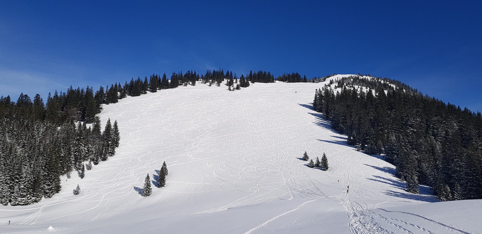 Abfahrt in ca. 15 cm Pulver auf Altschnee. Rechts am Wald war sogar noch Platz für eigenen Spuren. Dann hinunter auf die Piste bei der ob. Firstalm.