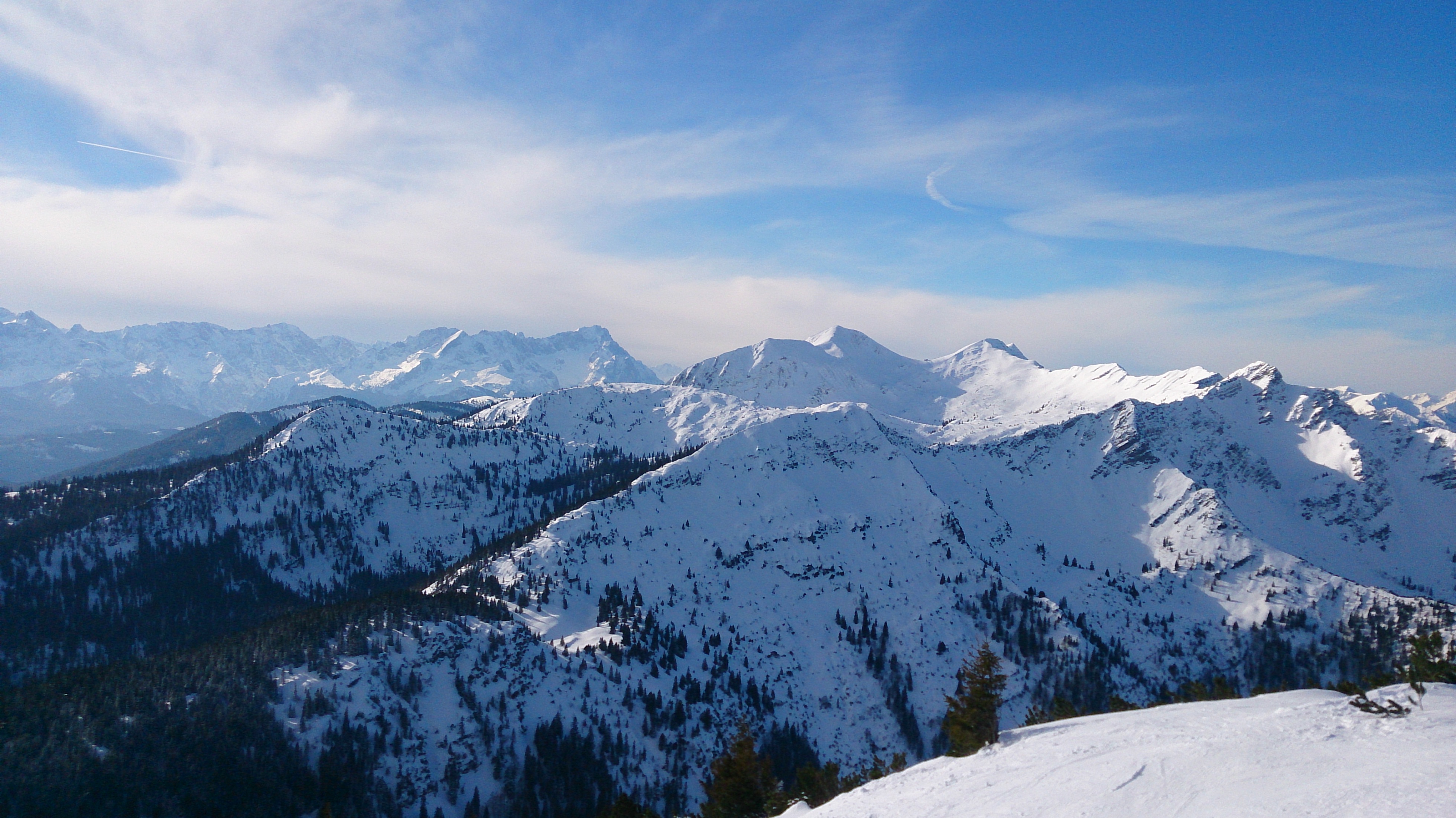Tourenverhältnisse: 2-5 cm Pulver auf hartem Harschdeckel, Schneisen und Aufstiegsforstweg schon pistenmäßig eingefahren; nach Eschenlohe unten aper