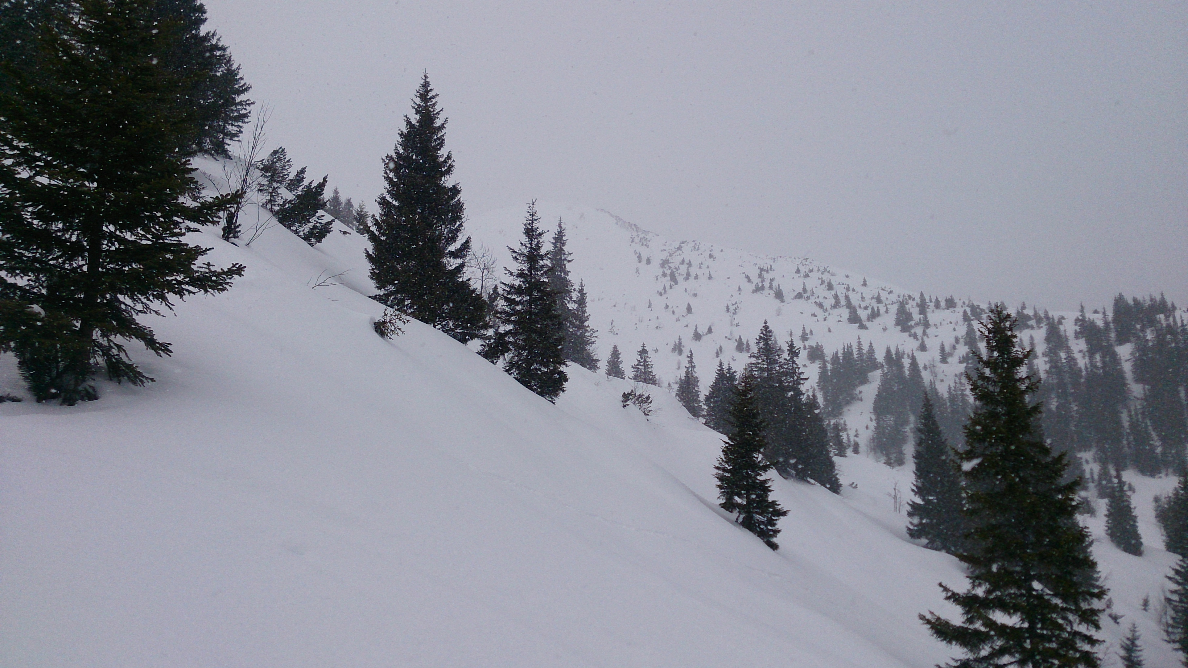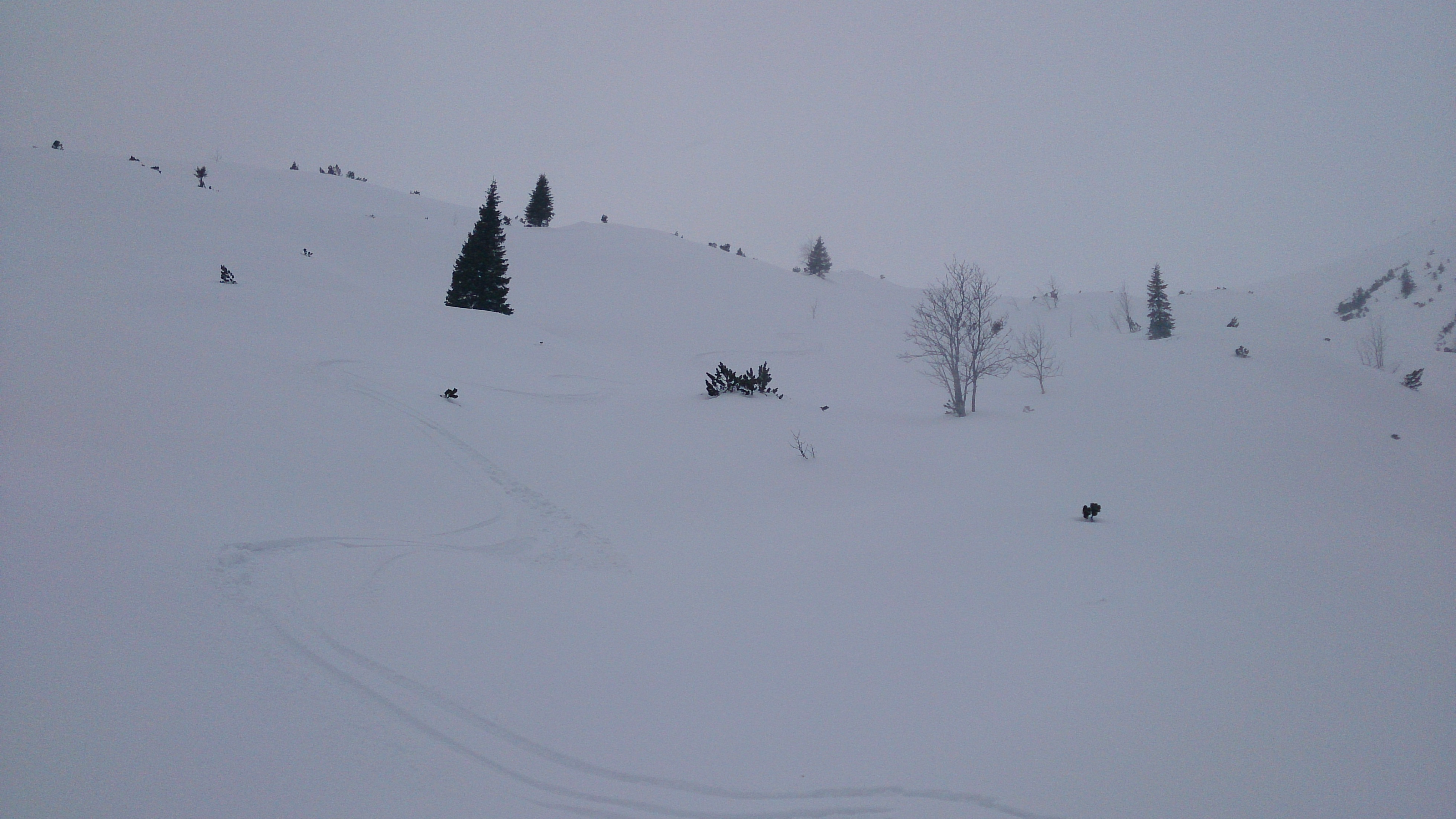 Tourenverhältnisse: genügend Schnee vom Tourbeginn weg; oben allerdings verblasen, mittlerer Teil schöner Pulver, im Waldbereich abrutschender Pulver auf Harsch (unangenehm insbesondere im Aufstieg)