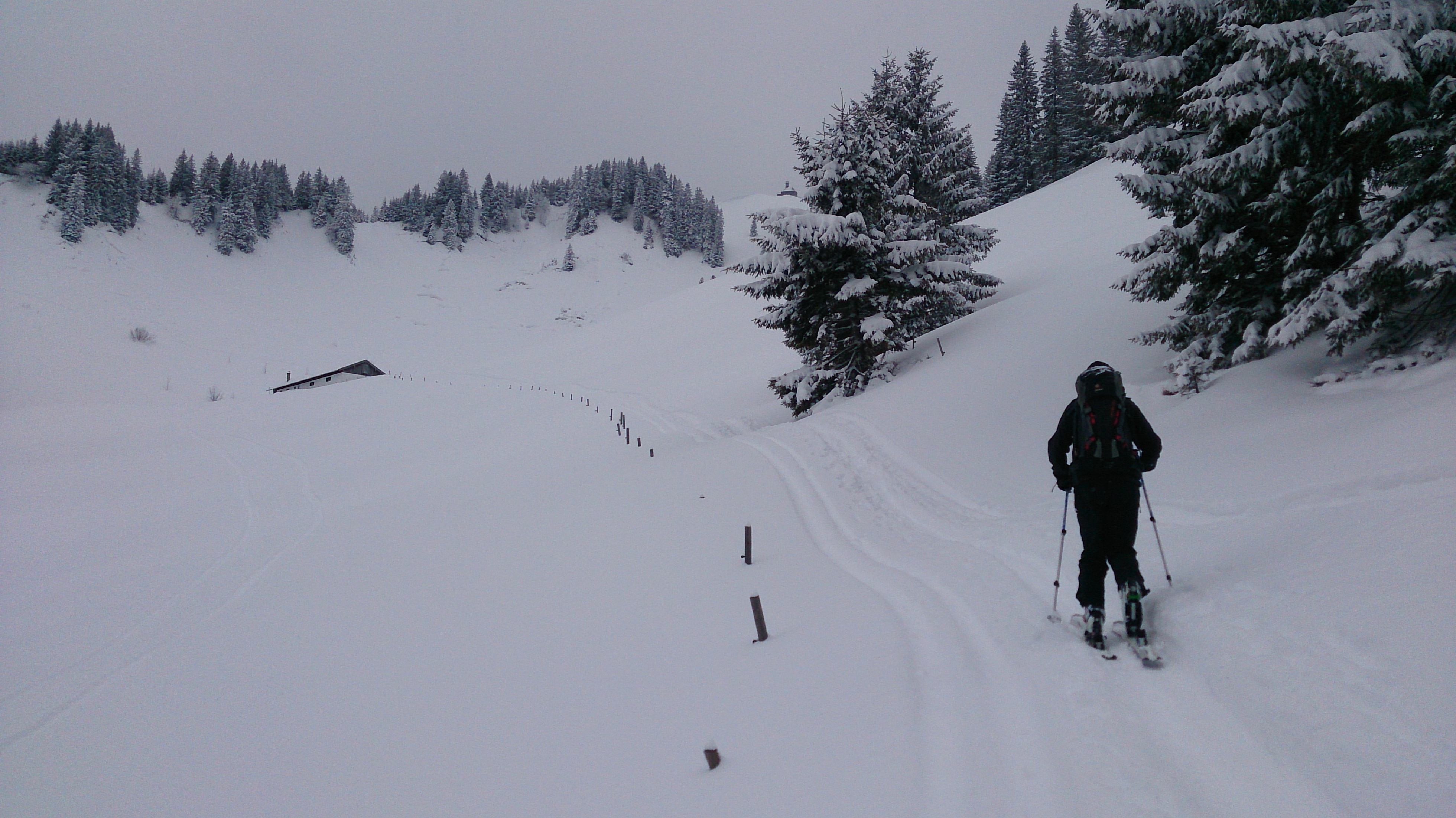 Tourenverhältnisse: ca. 25 cm Pulver, zumeist noch sehr locker - im Flachen schon fast zuviel Neuschnee zum Abfahren abseits der Spur