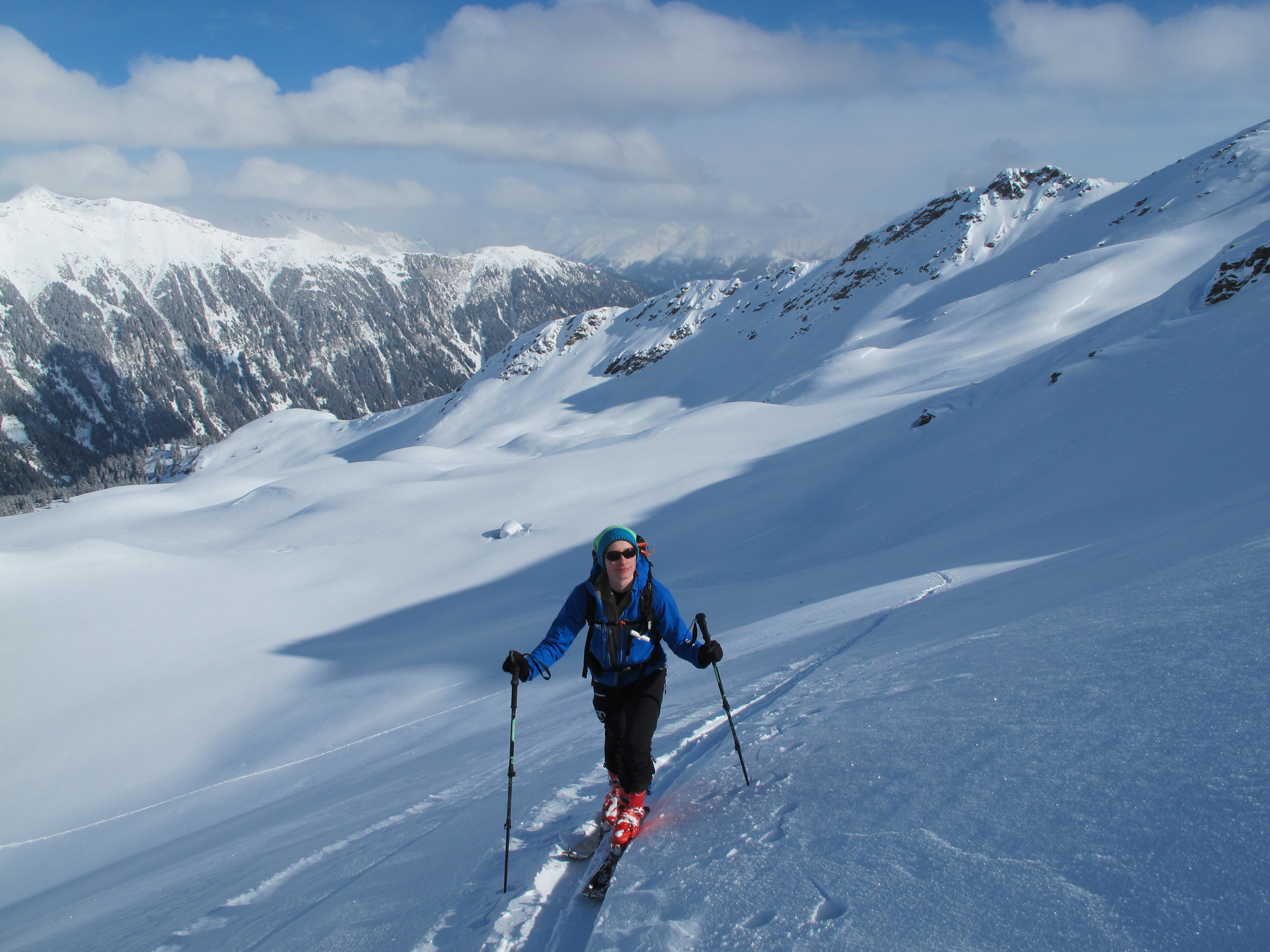 Hier hat es allgemein ein sehr gute Schneelage - deutlich über 1 m bereits am Ausgangspunkt. Darauf hat es ca. 20 cm feinen Pulverschnee.