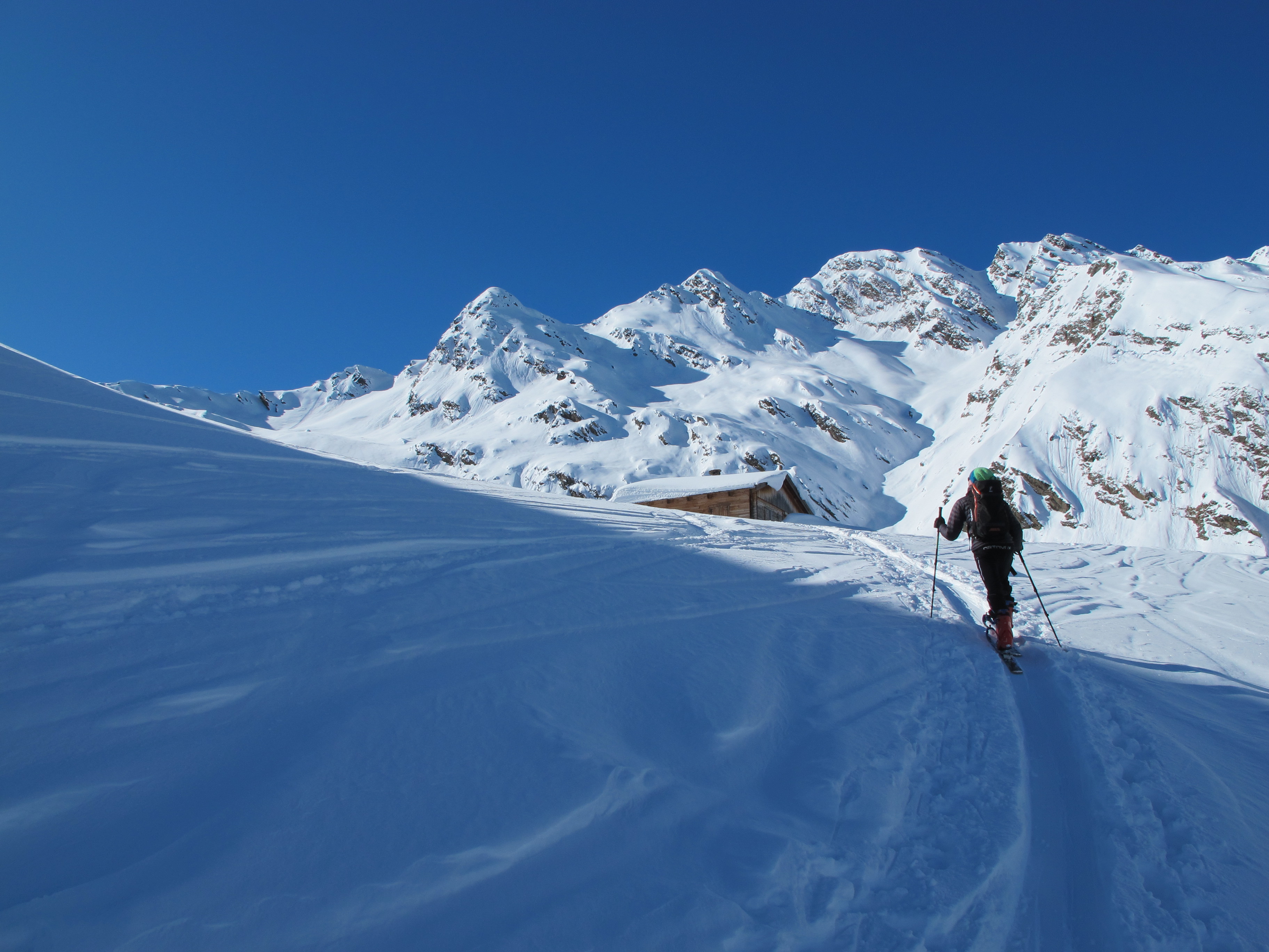 Tourenverhältnisse: Auch heute unverändert gute Bedinngen; es ist auch nach wie vor sehr kalt, was man aber gar nicht so merkt, denn esgeht fast kein Wind. SEhr schön pulvrig, 20 cm auf überweigend gut gesetzter Altschneedecke.
