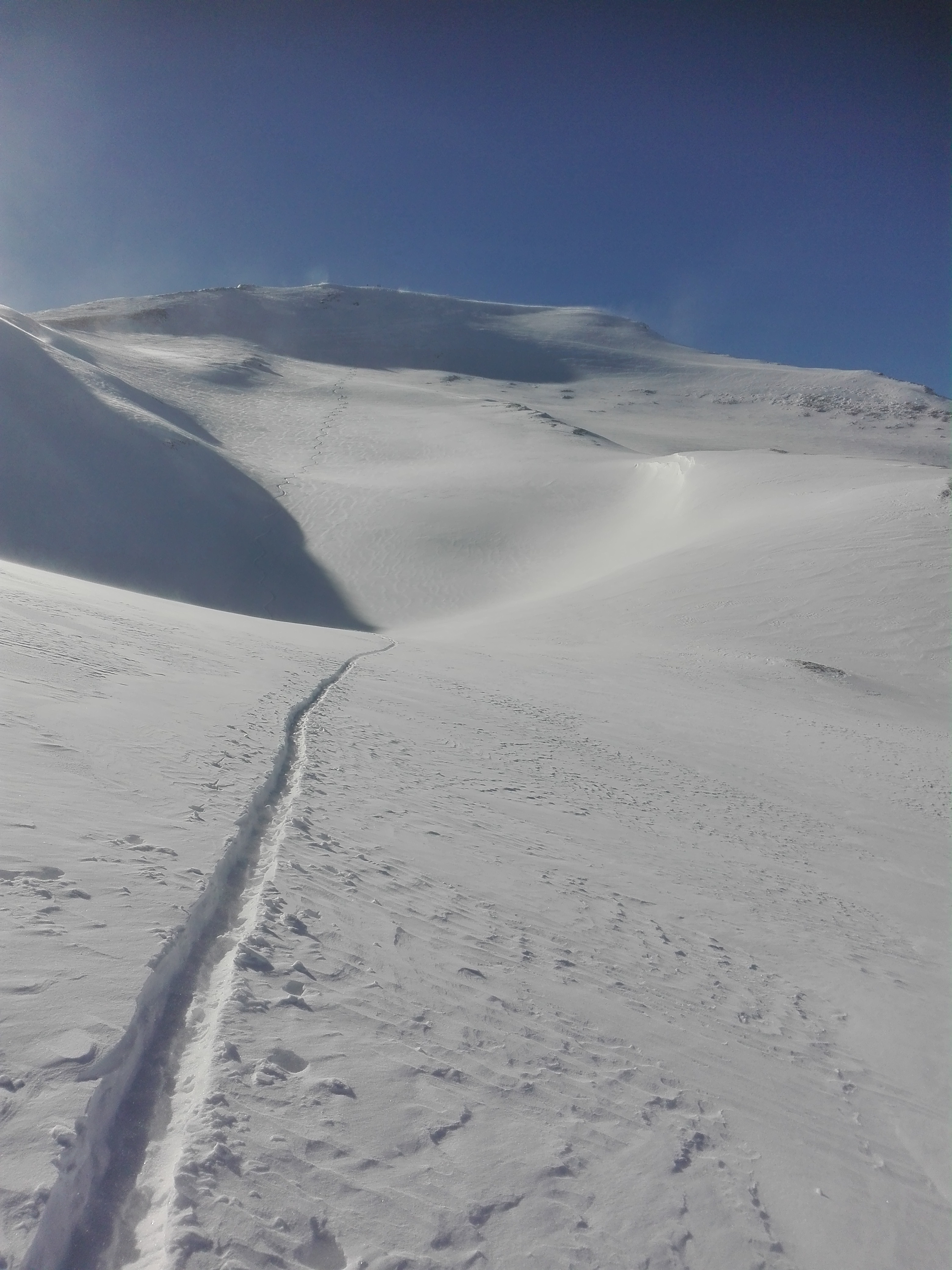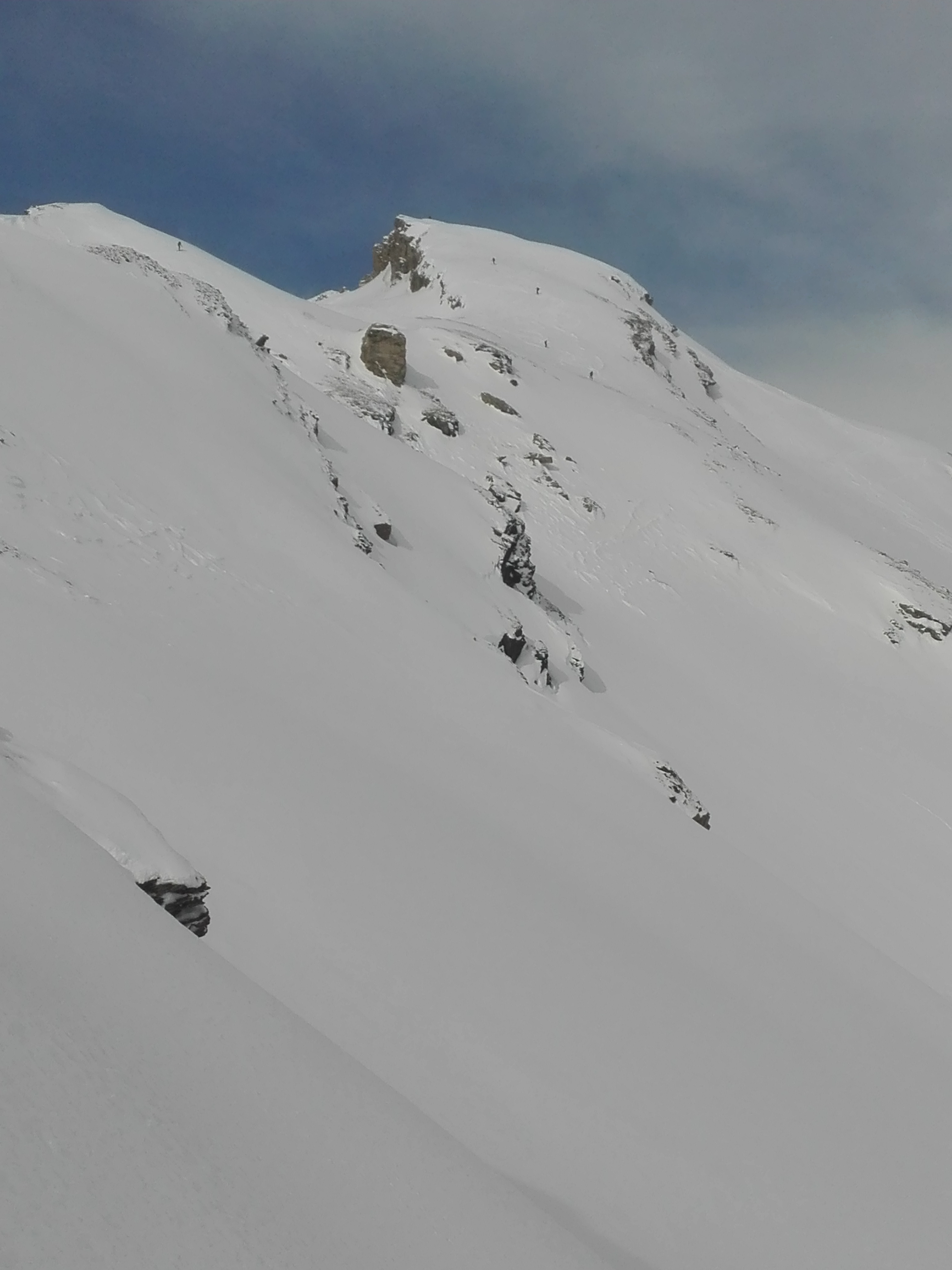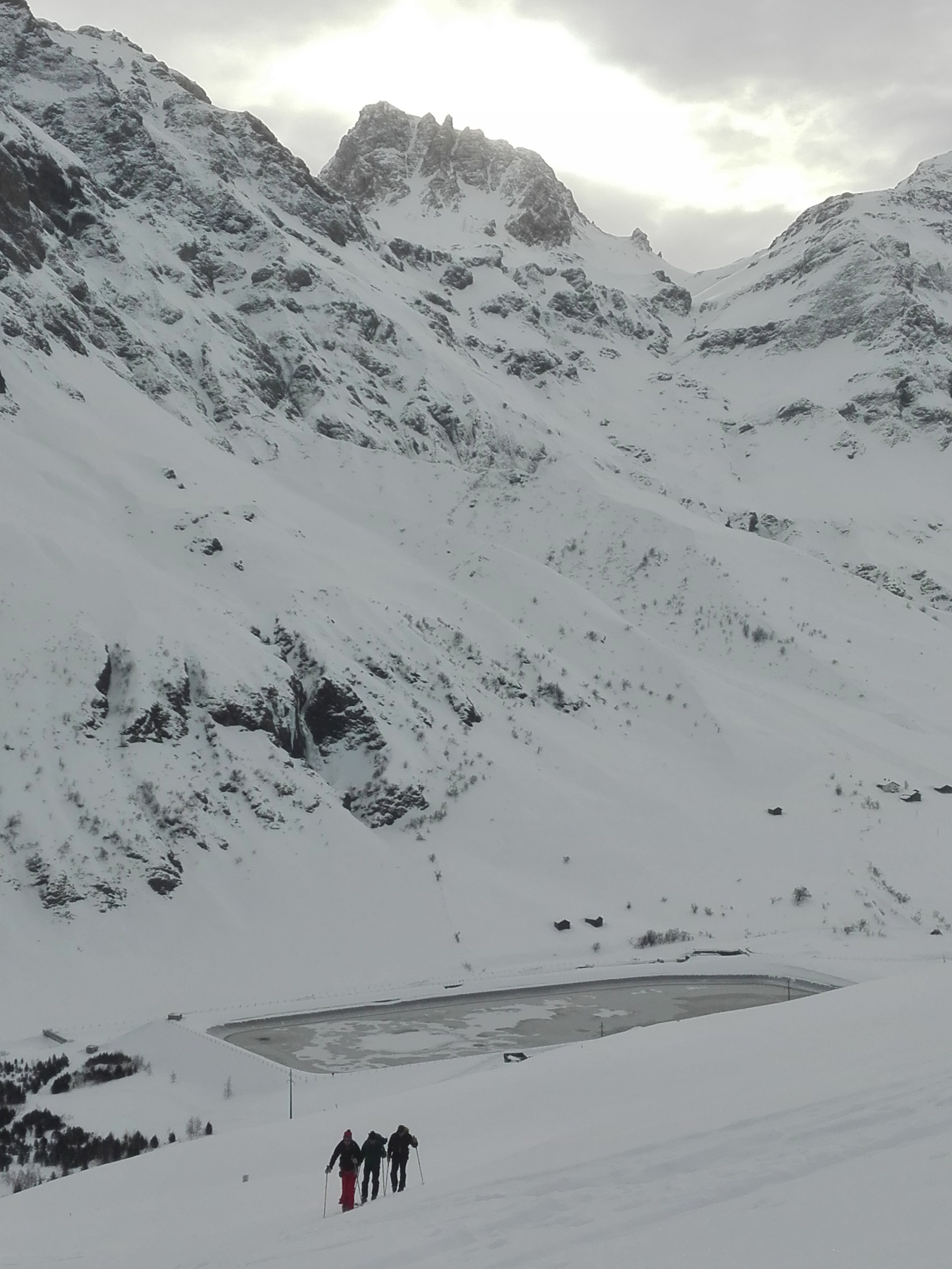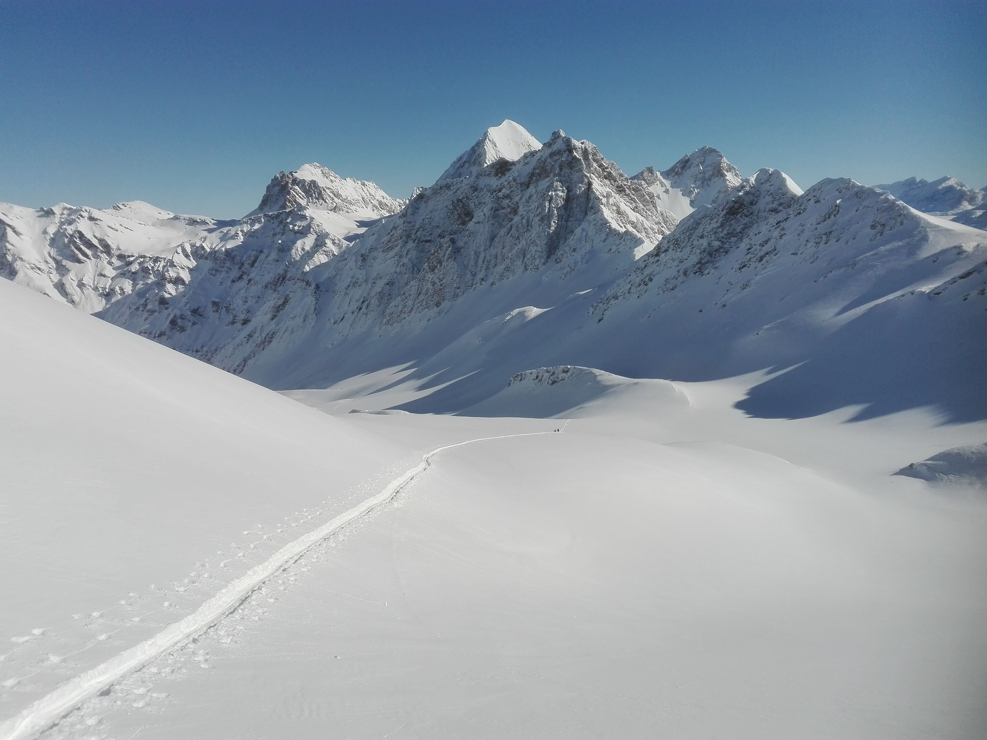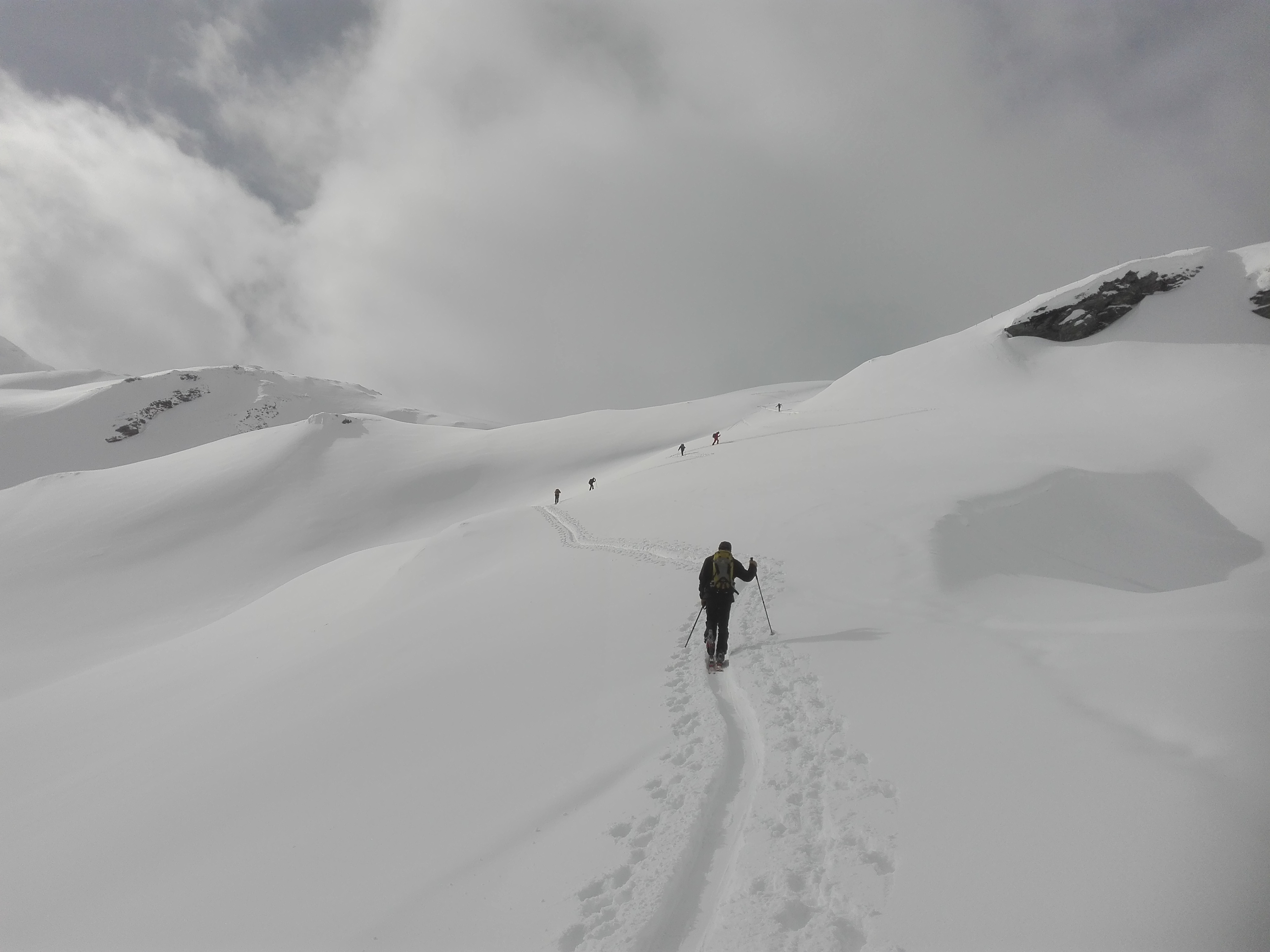 Am 12.02. bei schlechter Sicht über Nordosthänge unter dem Tomülpass durch zum Strätscherhorn. Abfahrt direkt vom Gipfel nach Osten. Guter Pulverschnee, ca. 10-15cm Neuschnee, fast ohne Windeinfluss.