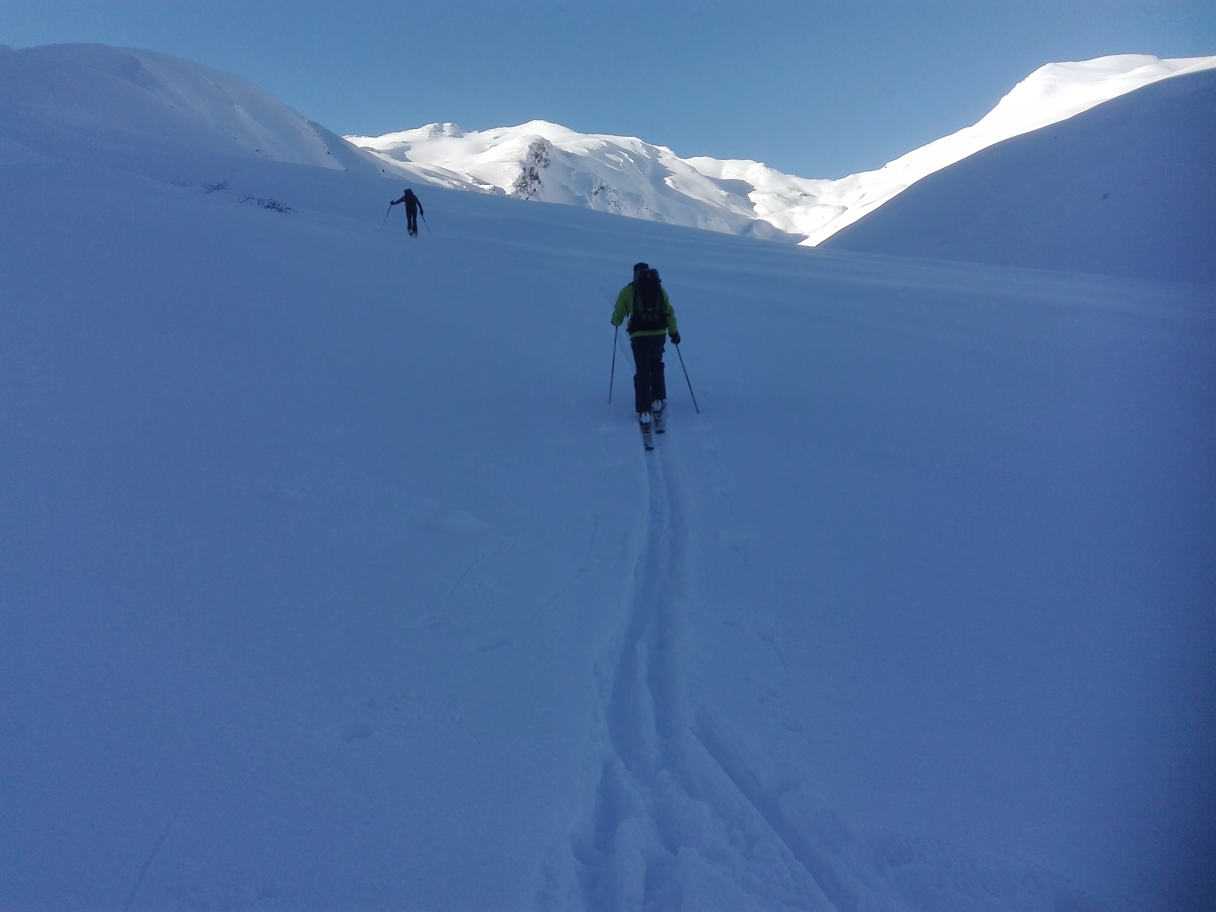 Am 13.02. durch das allerhinterste Safiental und anschließend über einen Nordosthang in ein Hochtal ("Lengegga") und durch dieses unter dem Vorgipfel nördlich vorbei auf das Bärenhorn. Wolkenlos, sehr kalt (-16 Grad am Start), bester Pulverschnee, ebenfalls ca. 10-15cm Neuschnee, fast ohne Windeinfluss.