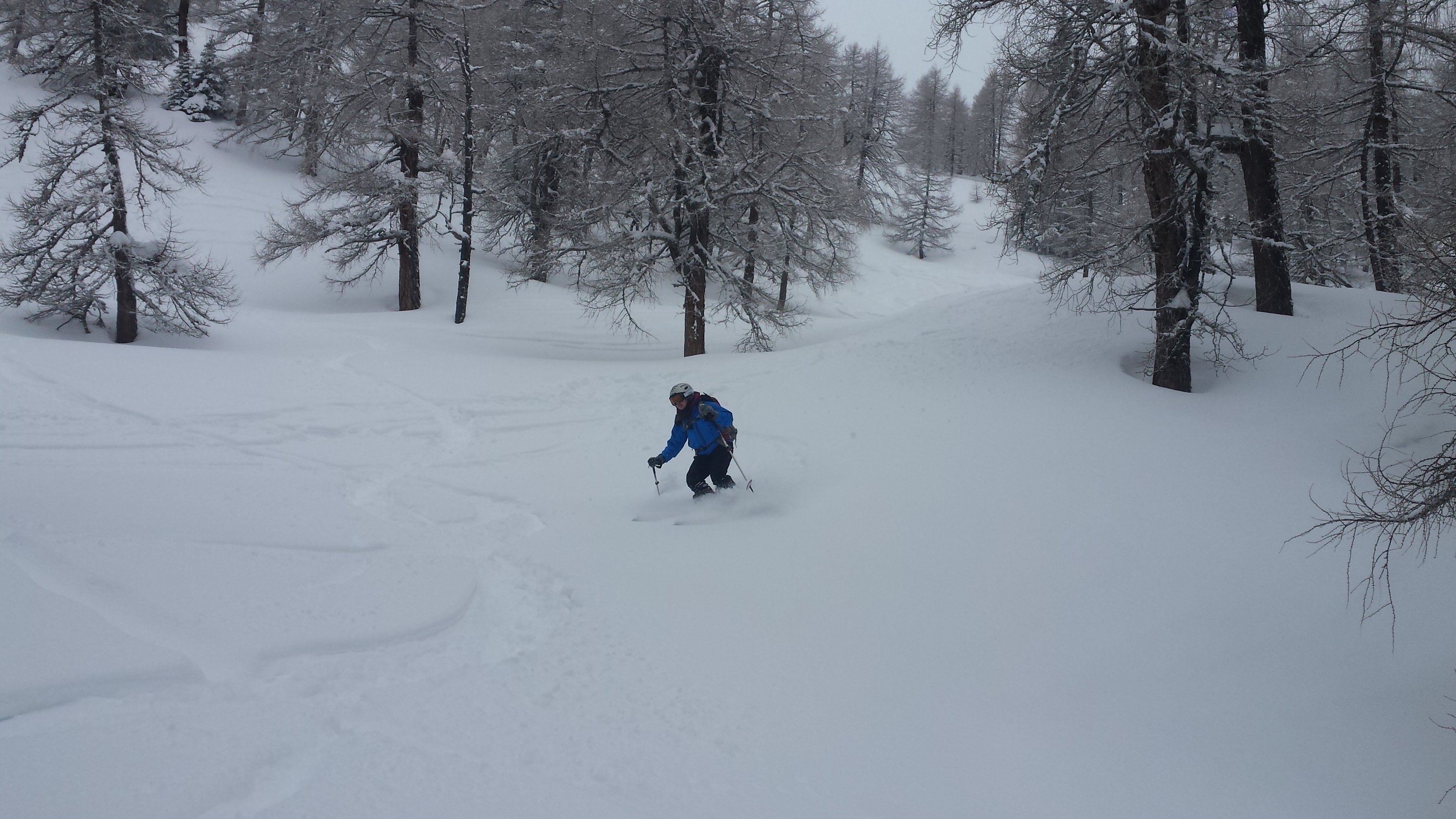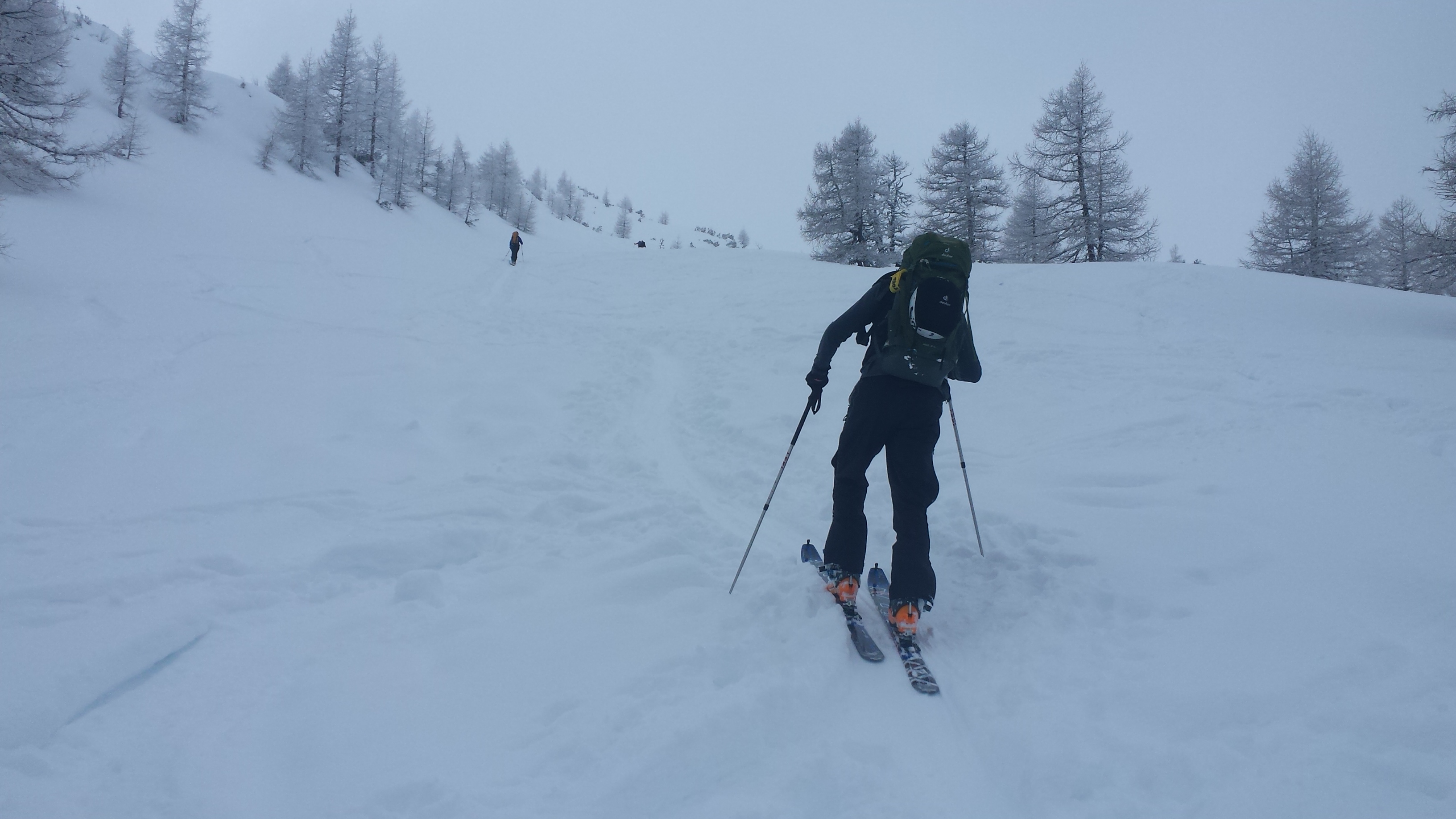Tourenverhältnisse: Heute einmal durch den Tunnel und auch wieder bessere Sicht. Über Nacht etwas Neuschnee, oben ca. 20cm. Zuerst flach, dann über Forstwege zur Ranstlalm. Ab hier freies Gelände mit lichtem Lärchenwald, der fast bis zum Gipfel geht. Abfahrt bei akzeptabler Sicht durch den Lärchenwald. Schnee oben lange top. Ab 1500 m feuchter und zum Teil harschig.